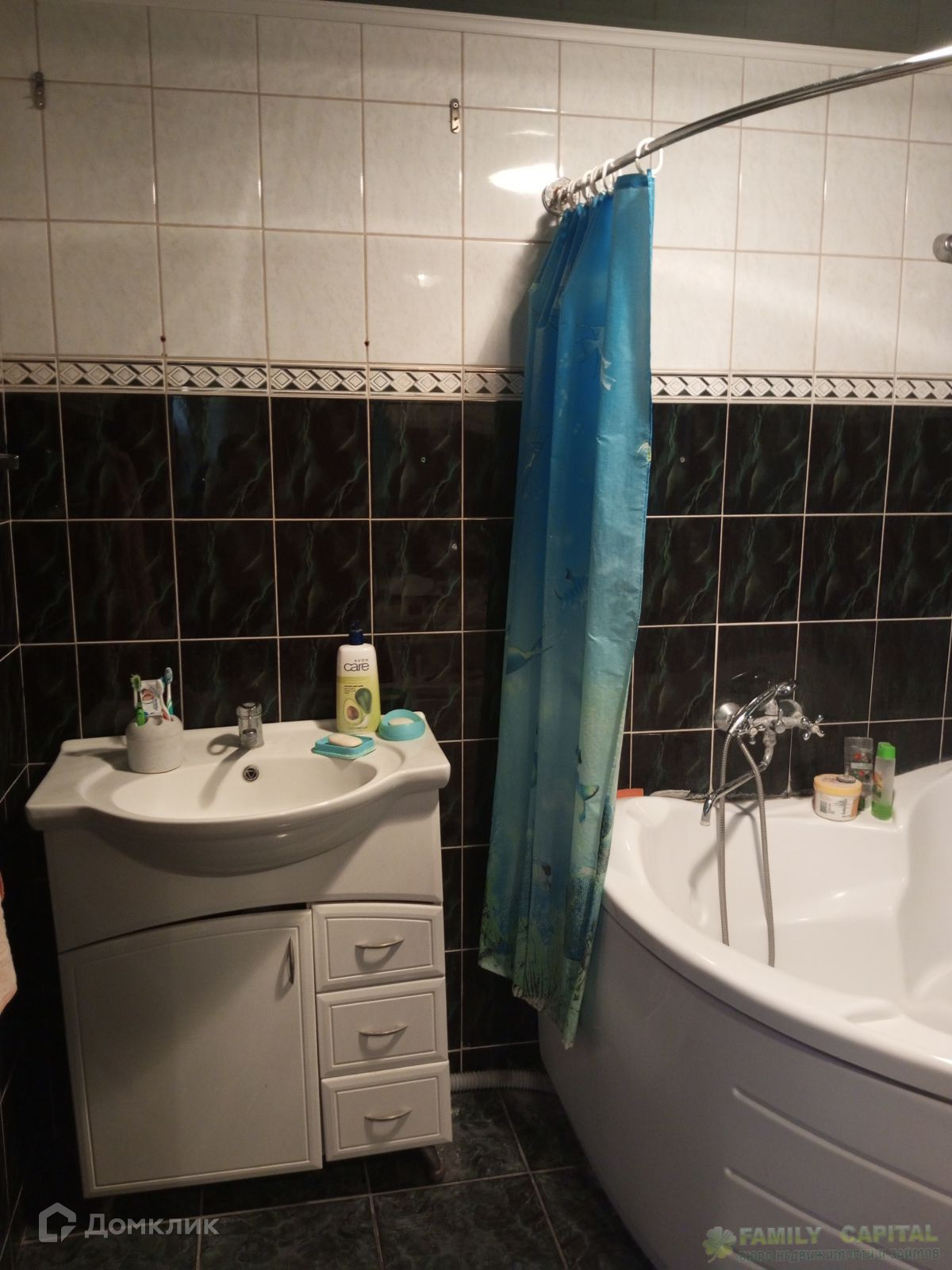 Санузел раздельный, отделан кафелем, сантехника в хорошем состоянии, есть ванна и душевая кабина.