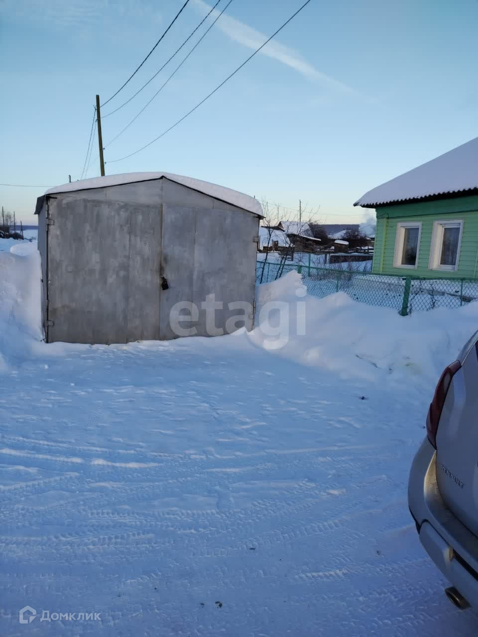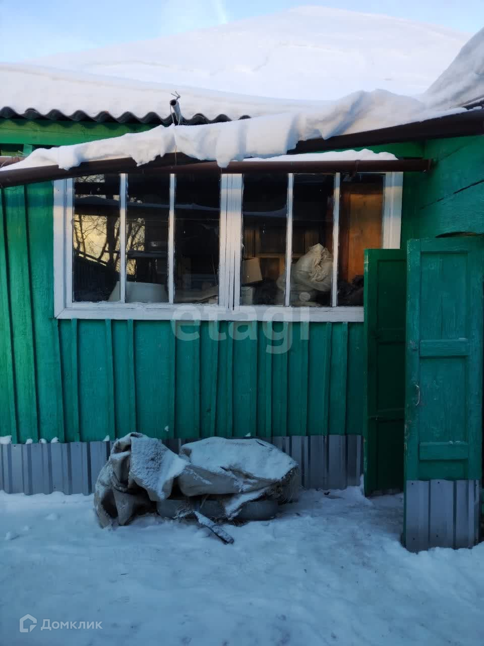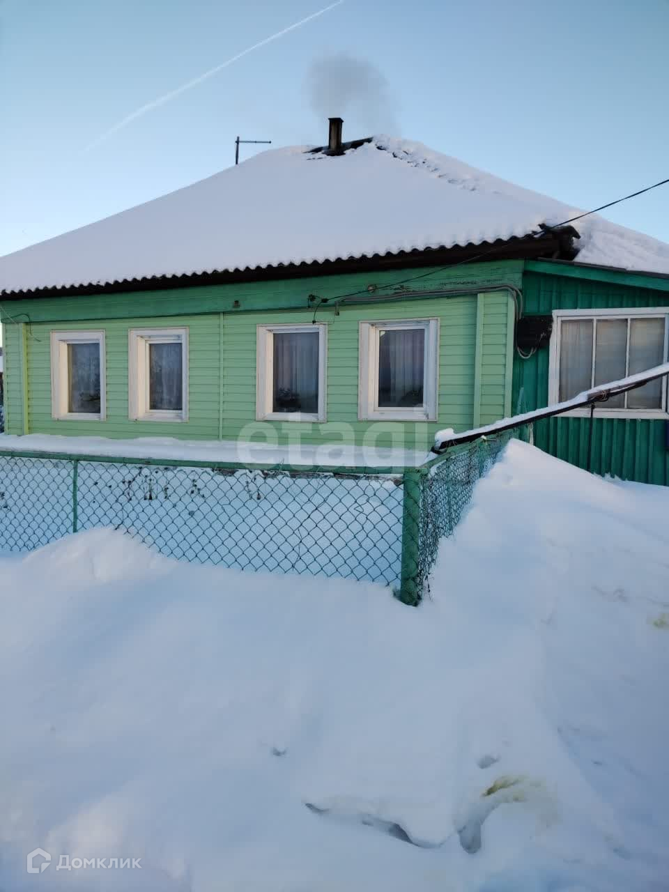Дом отделан сайдингом ПВХ приятного зеленого цвета. Территория огорожена профлистом, перед домом установлен металлический гараж.