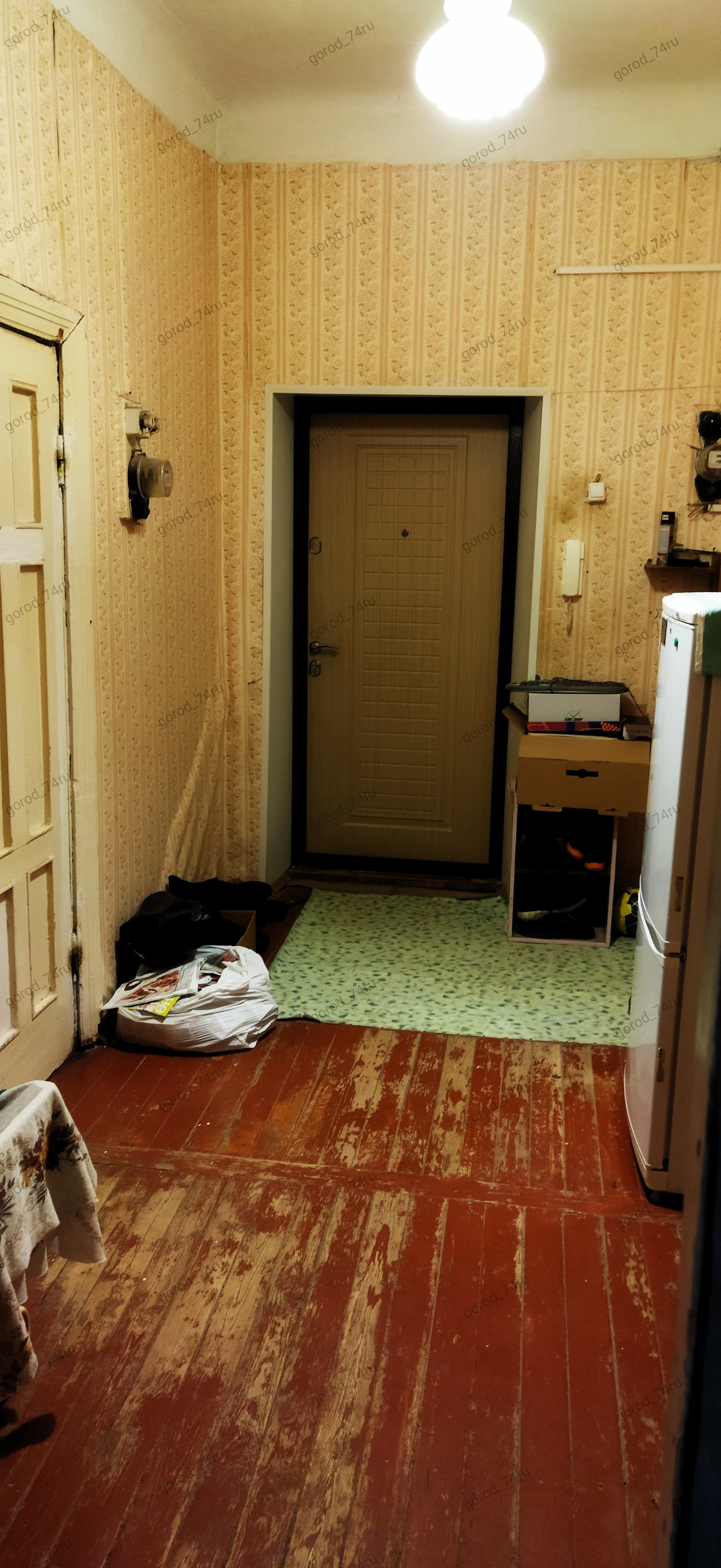 В комнате выполнен косметический ремонт: евроокно, натяжной потолок со светильниками, межкомнатная дверь, линолеум, обои