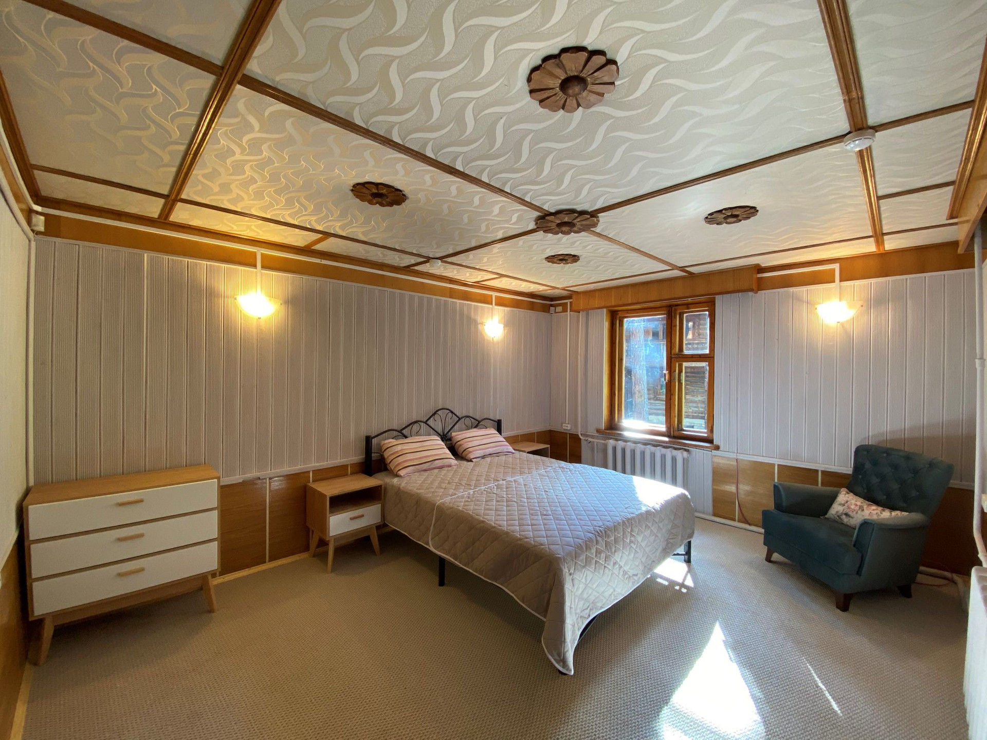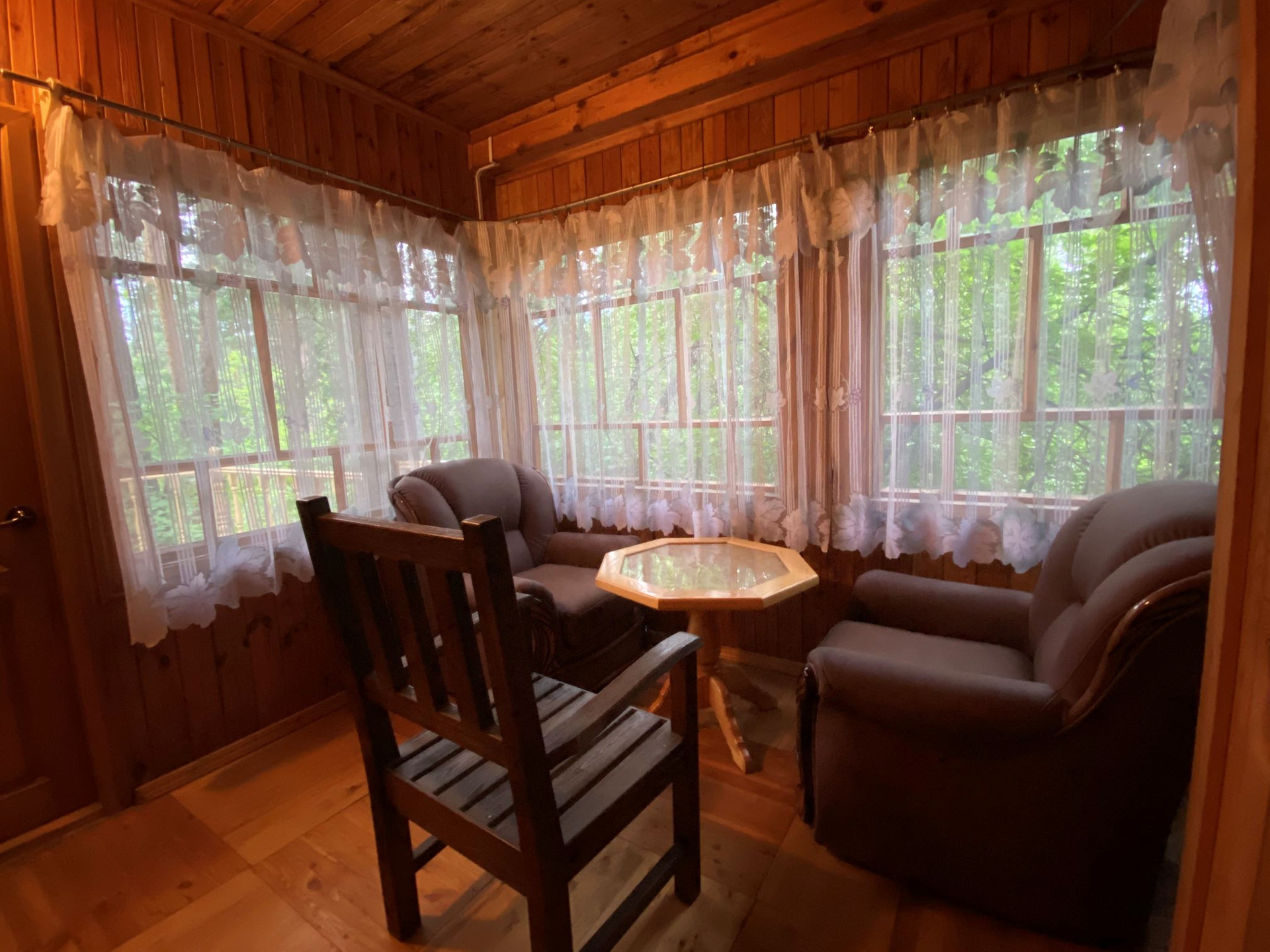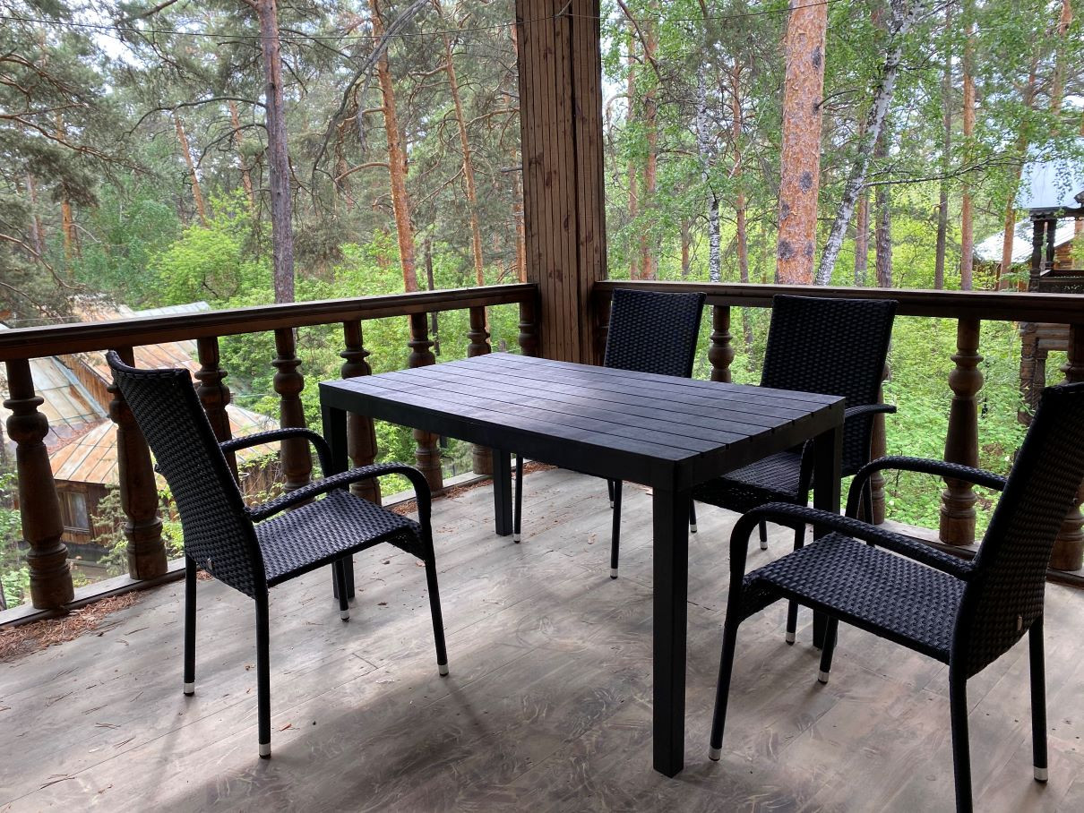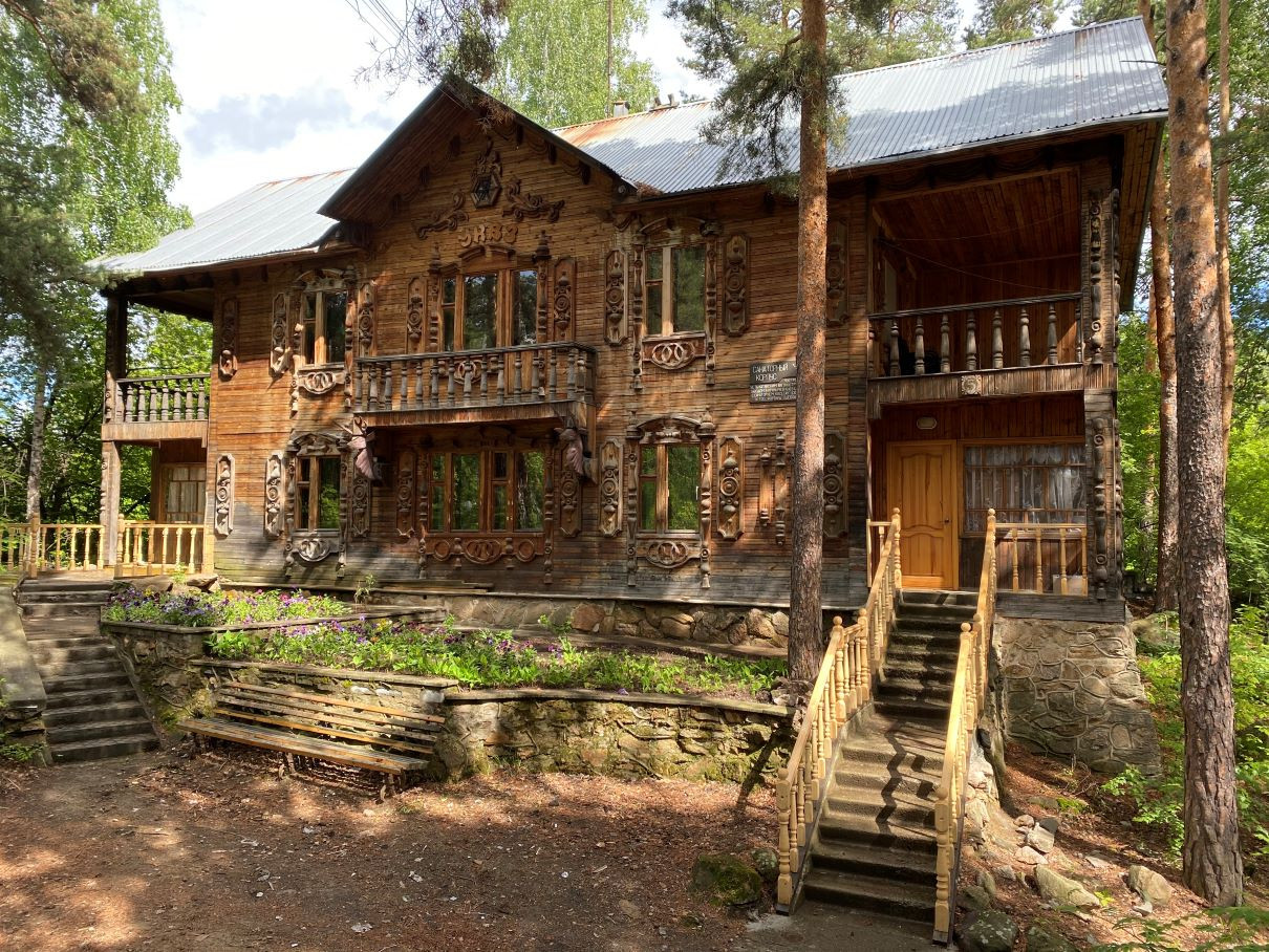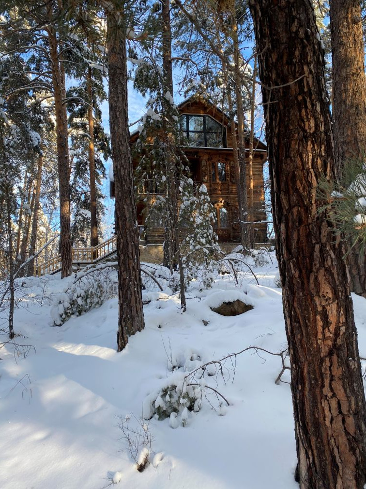 Дом расположен в сосновом лесу на перешейке между озёрами Теренкуль и Кисегач.