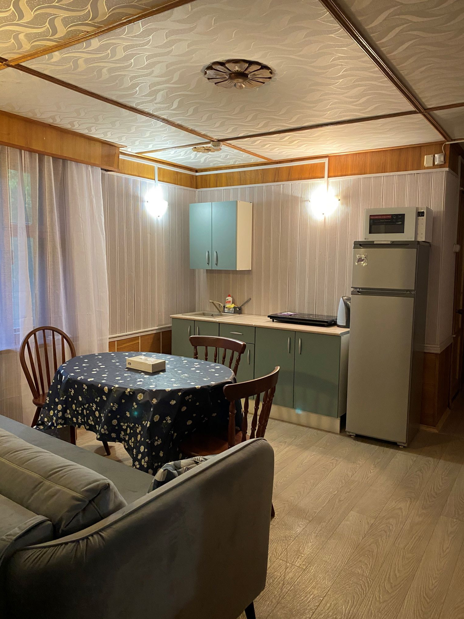 На кухне холодильник, плита, микроволновка, чайник, вся необходимая посуда.