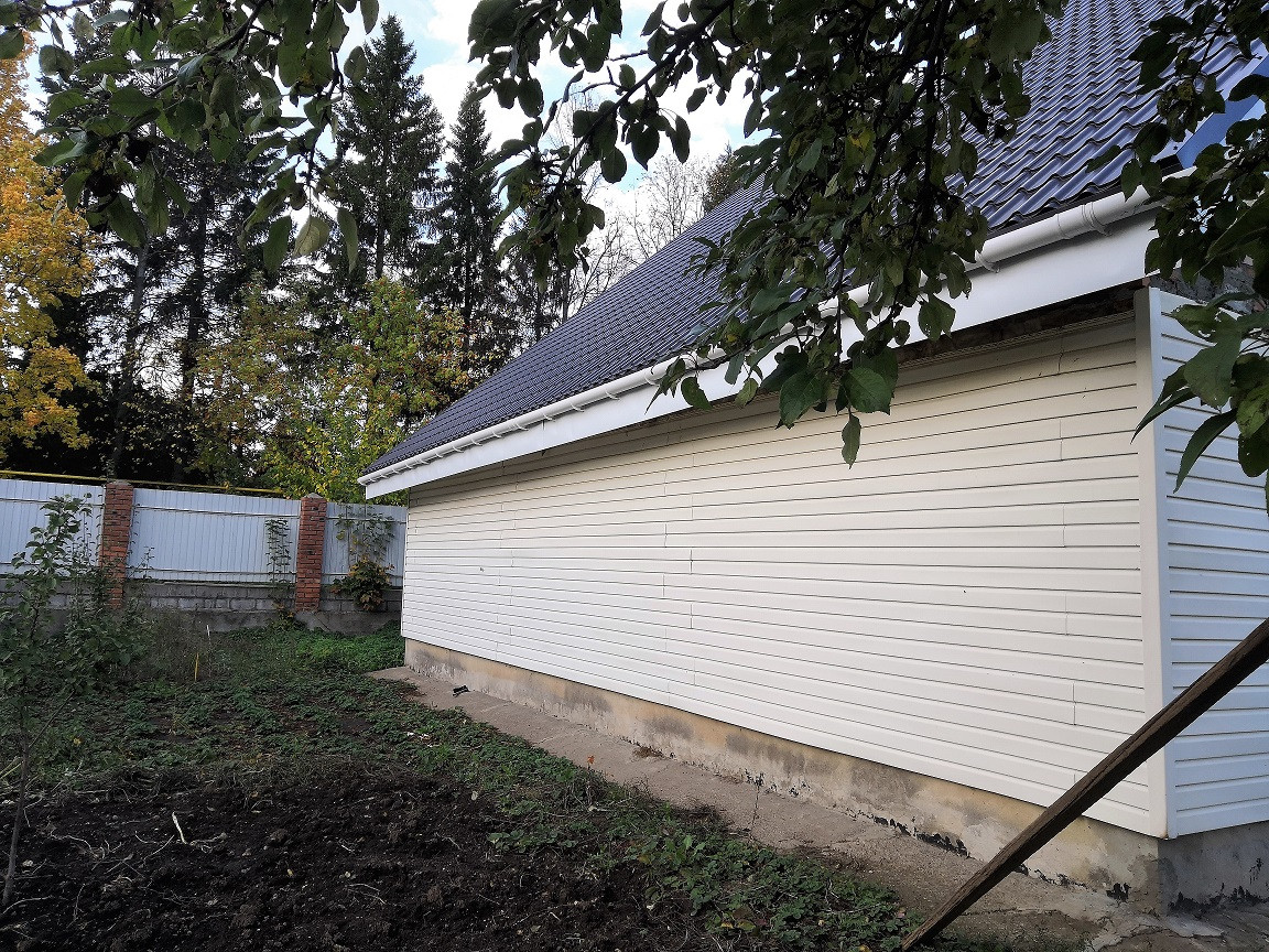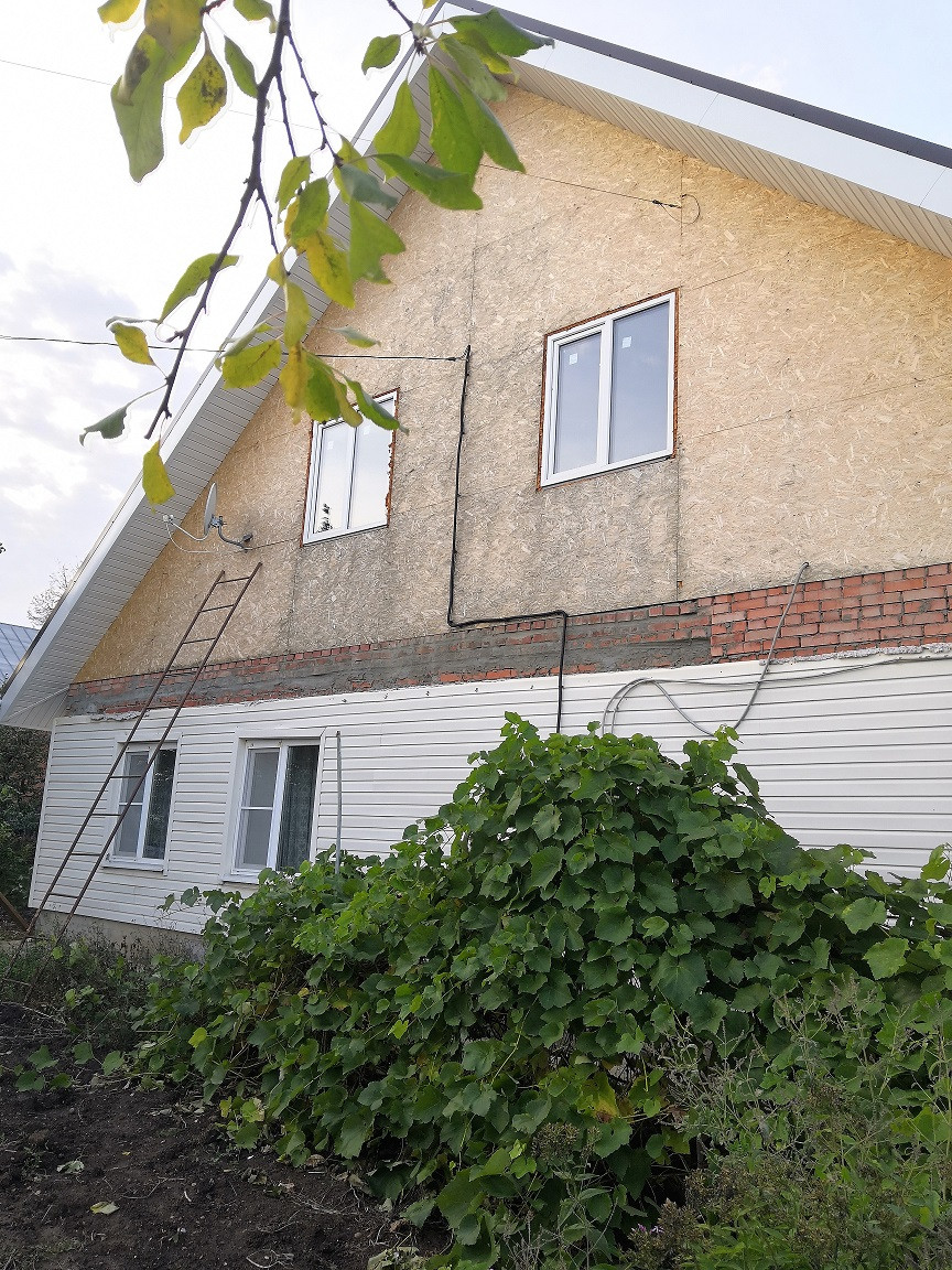• Кровля дома-металл, 1 этаж стены: пеноблоки, пристрой кирпичный, все утеплено снаружи и обшито сайдиногом.