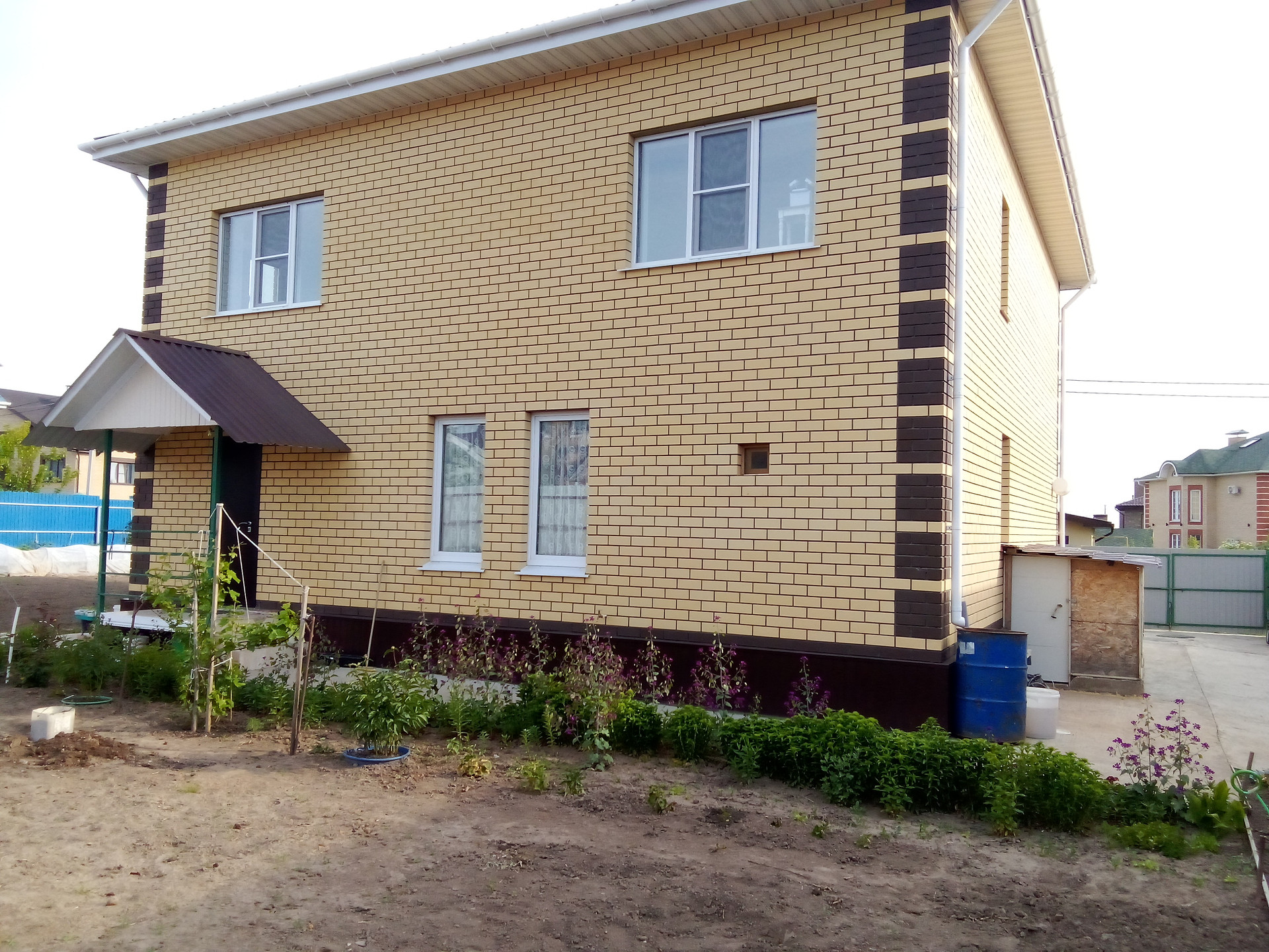 Дом 210 кв.м. + подвал 110 кв.м. на земельном участке 900 кв.м. Стены - газобетон с облицовочным кирпичом. Участок огорожен забором из профнастила.