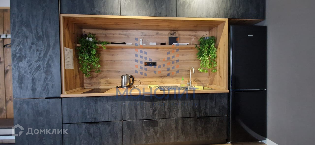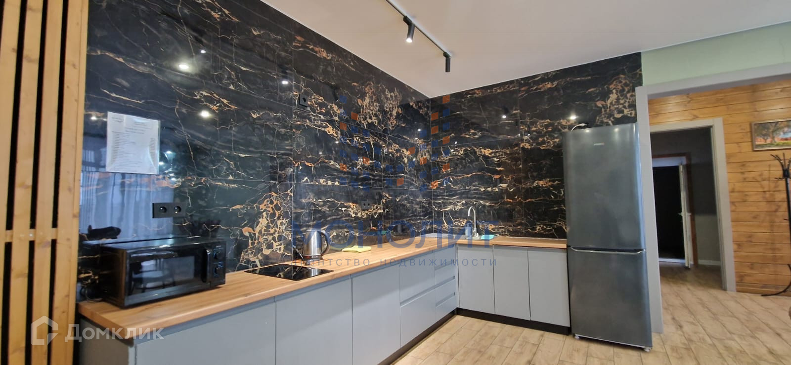 - Стильная кухня с фартуком из керамогранита, оснащенная холодильником, микроволновой печью и индукционной плитой.