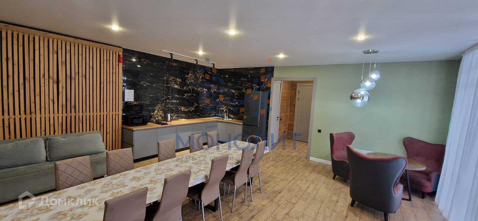 - Просторная кухня-гостиная площадью 45 квадратных метров с панорамными окнами, открывающими вид на крытую террасу.