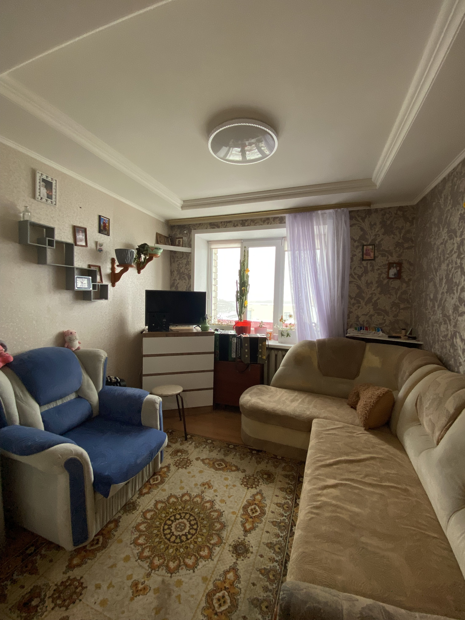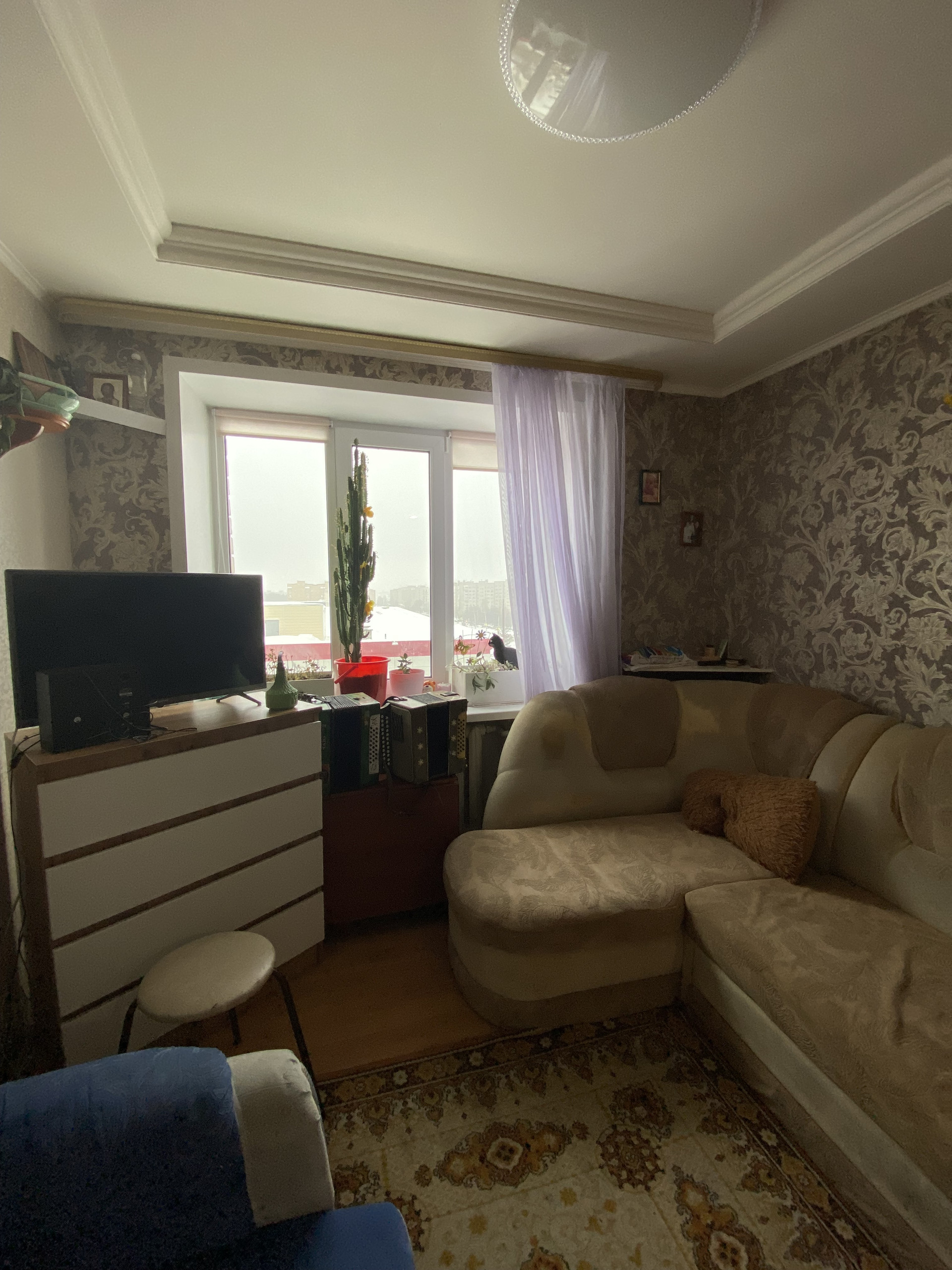 В комнате пластиковое окно, на полу ламинат, натяжные потолки. Чистый и ухоженный коридор и подъезд.