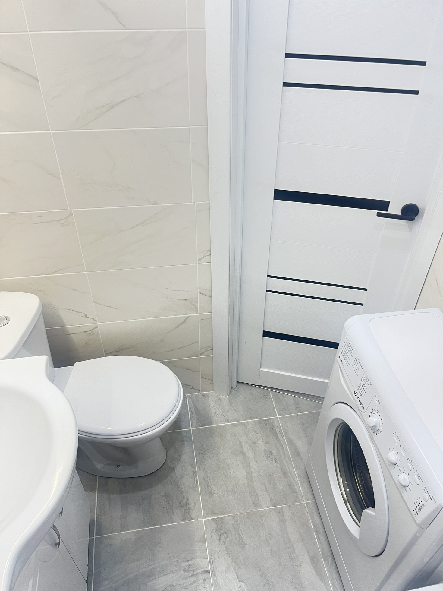 Санузел совмещённый полностью современной керамограгитной плитке, есть стиральная машина