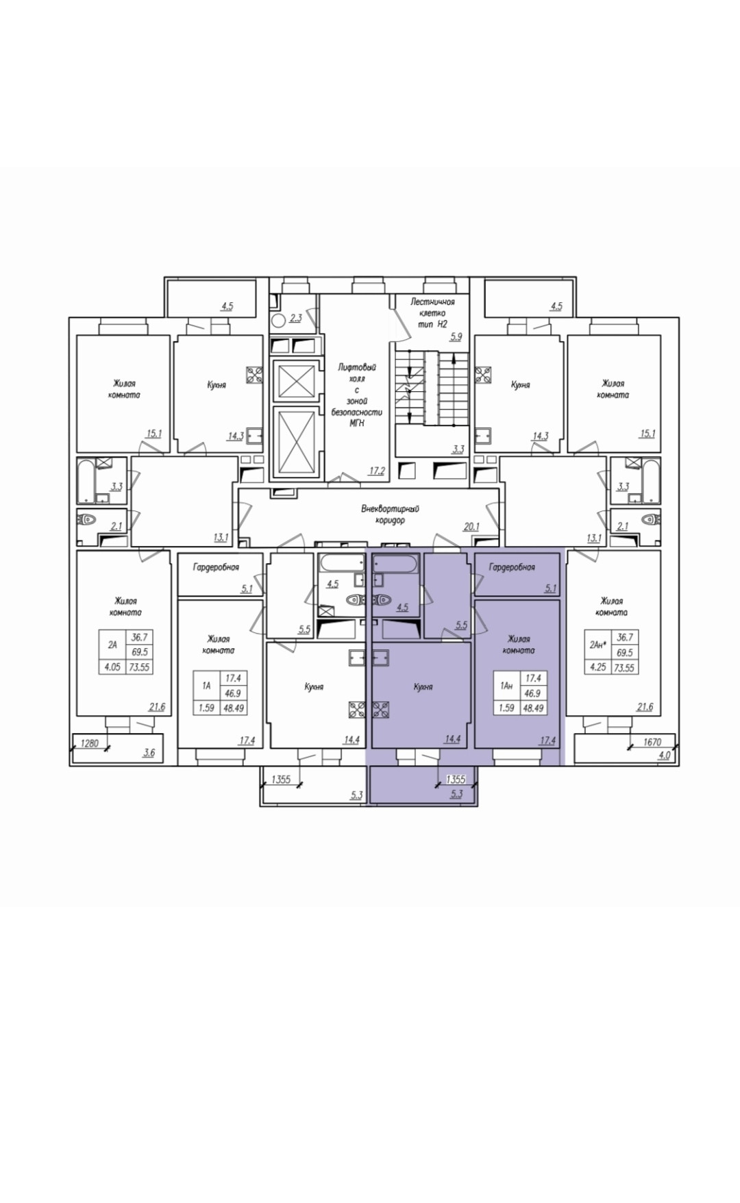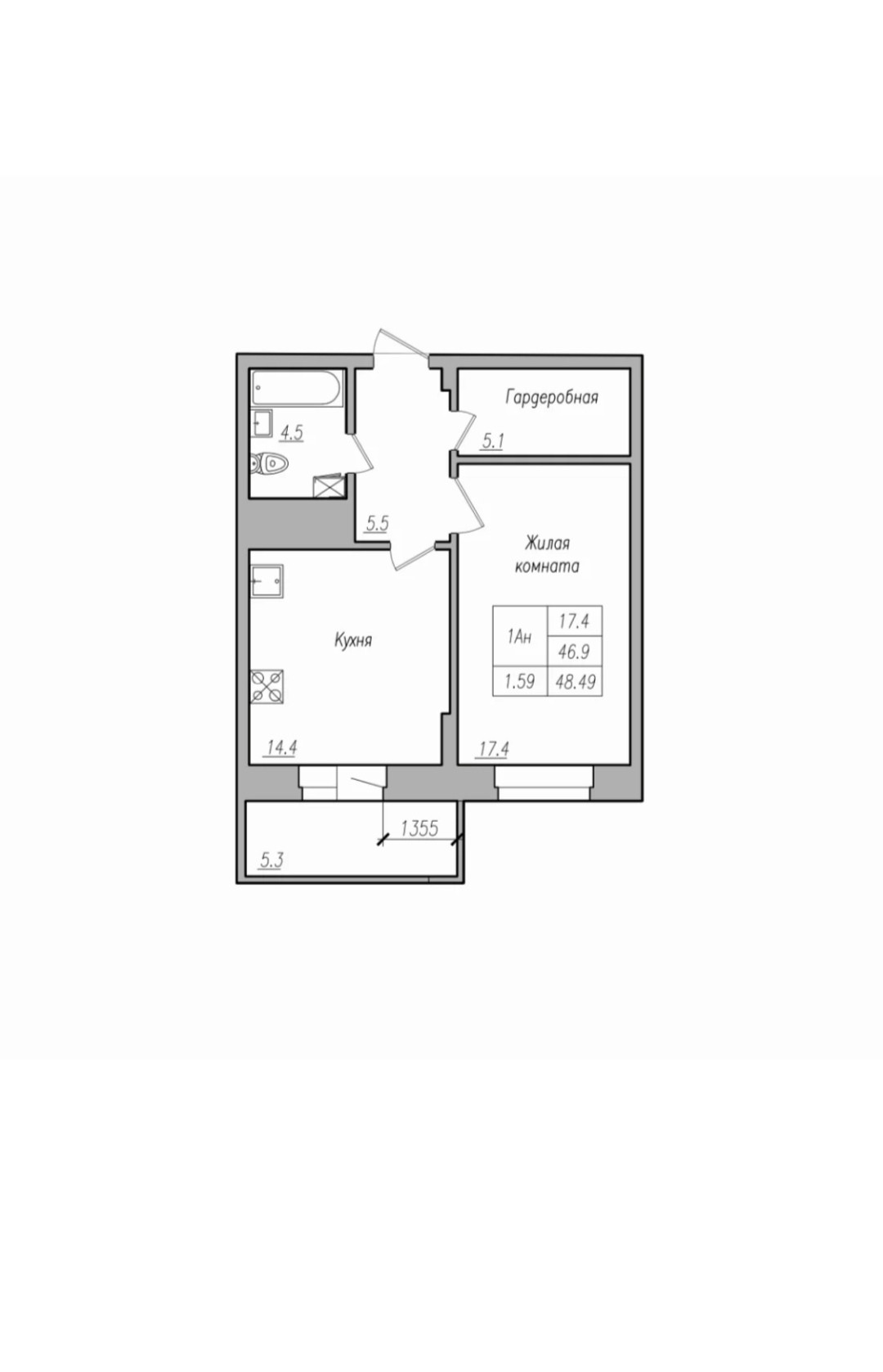 Общая проектная площадь квартиры с учётом площади лоджии - 52,2 кв.м., без учёта площади лоджии - 48,49, жилая площадь - 17,4 кв.м., кухня - 14,4 кв.м., прихожая - 5,5 кв.м., санузел - 4,5 кв.м., гардеробная - 5,1 кв.м, балкон - 5,3 кв.м.