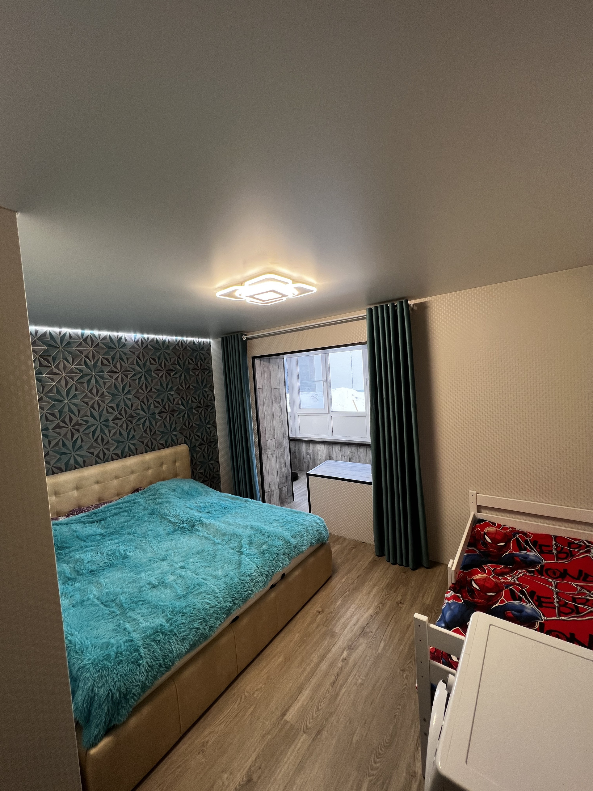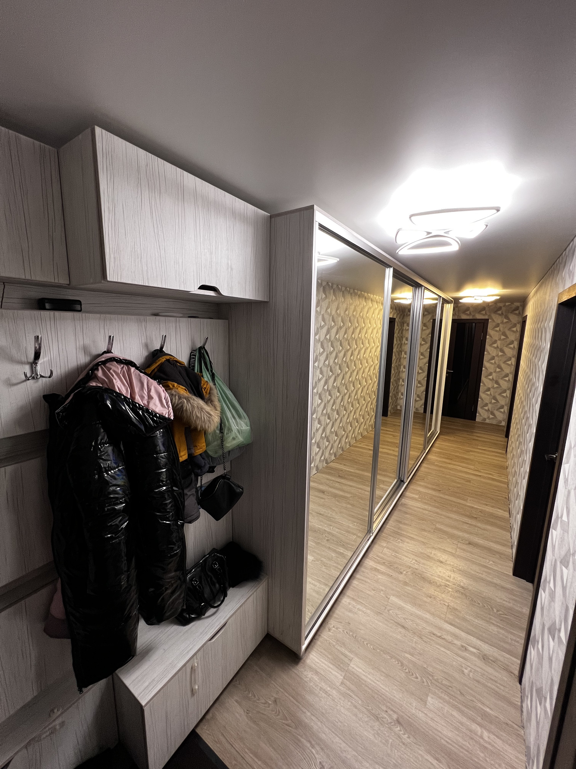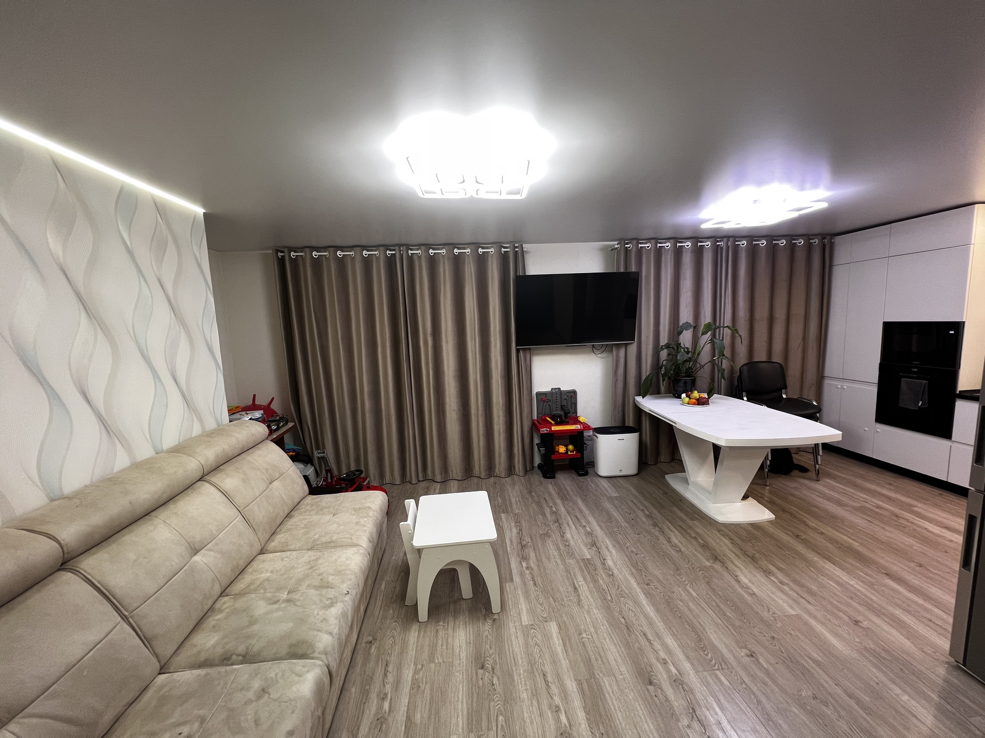 Оставляем встроенную кухню с фурнитурой Blum, большой шкаф купе в прихожей, мебель в детской комнате.