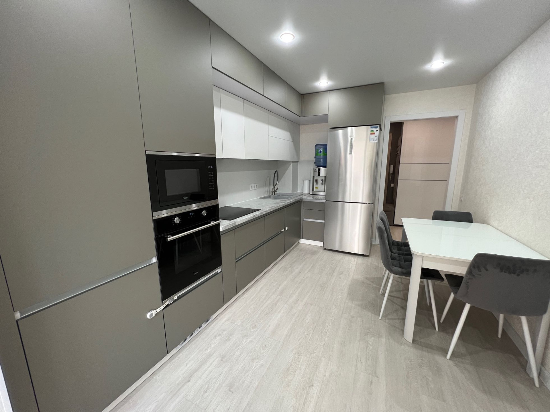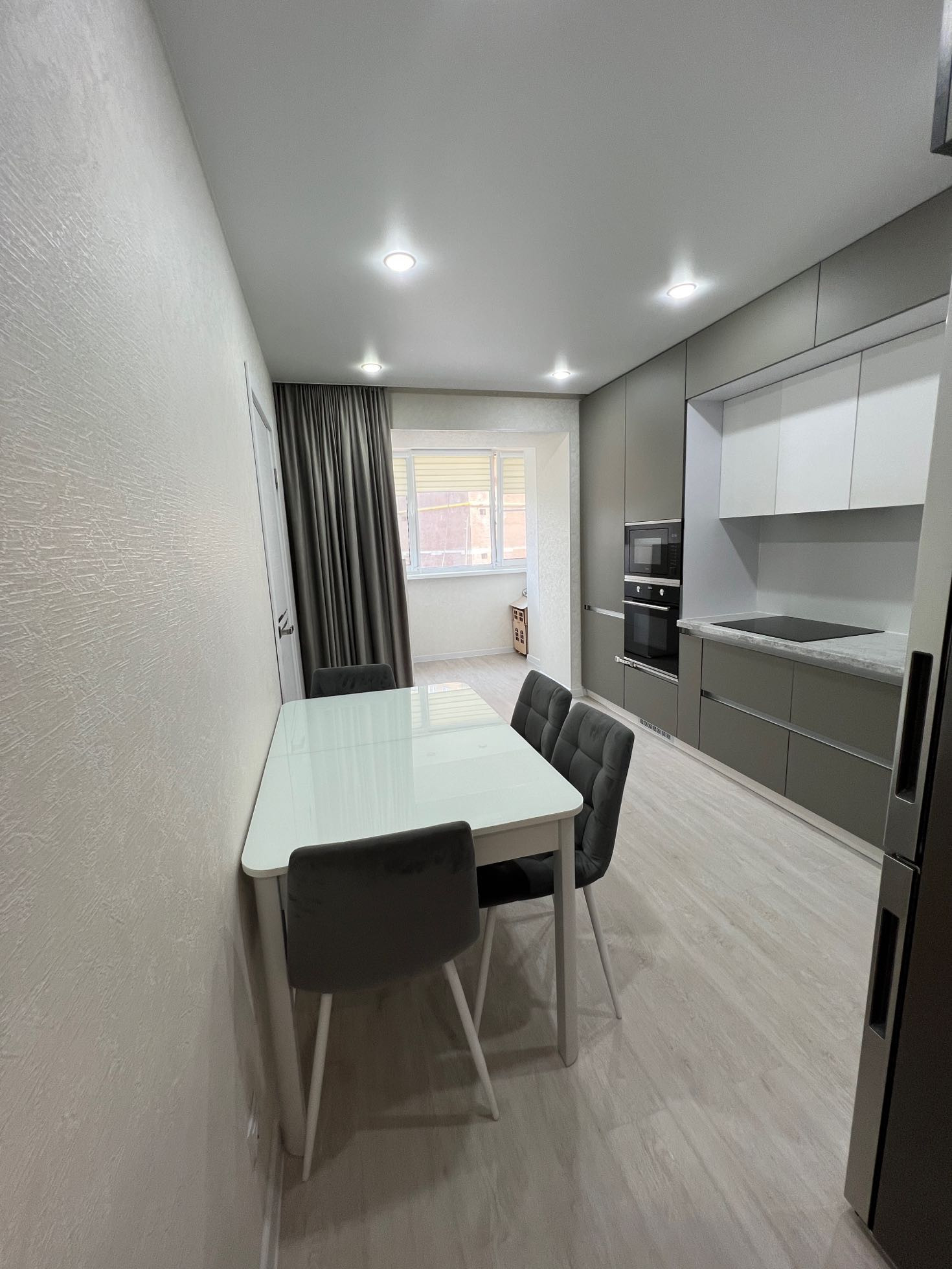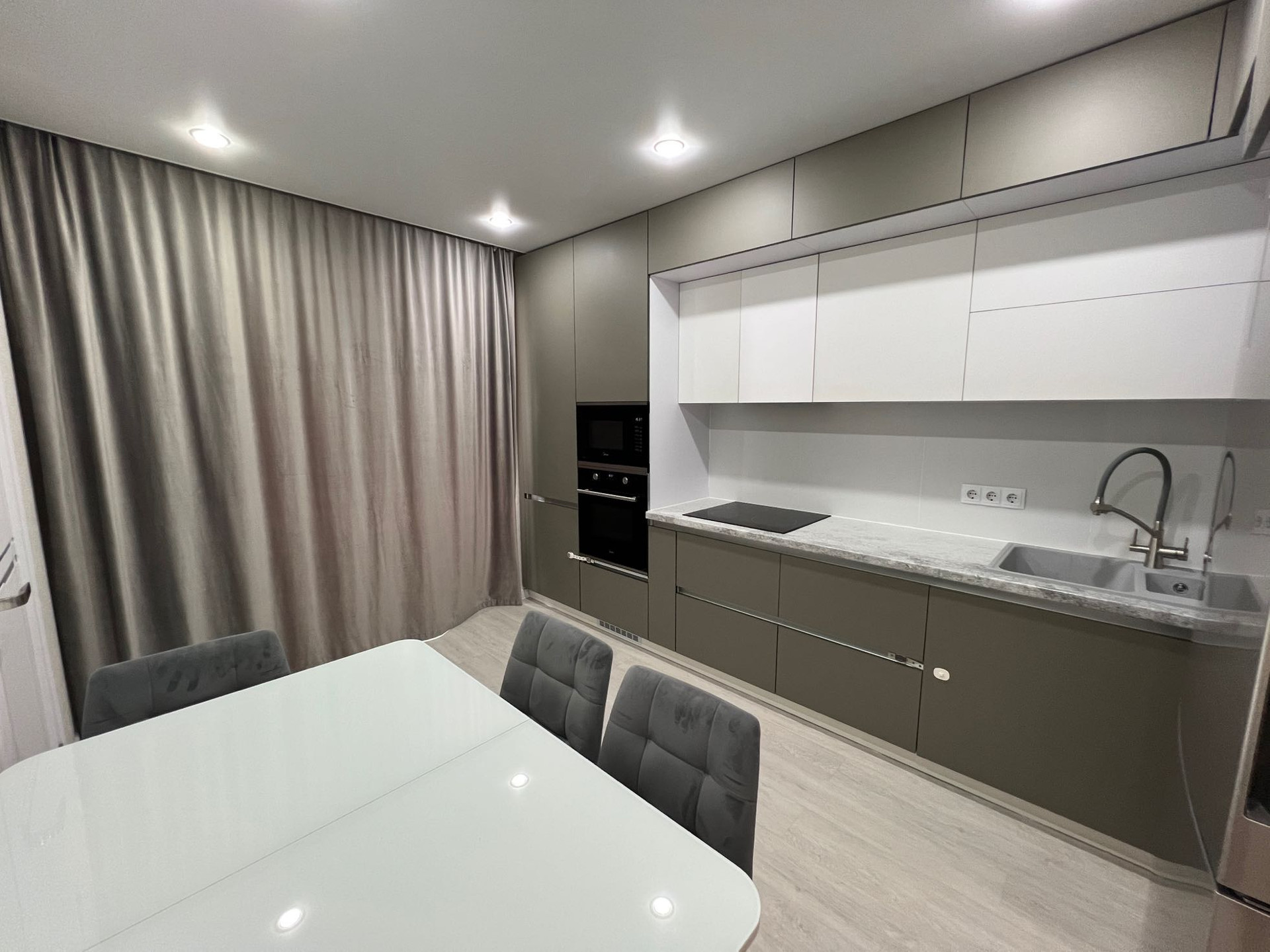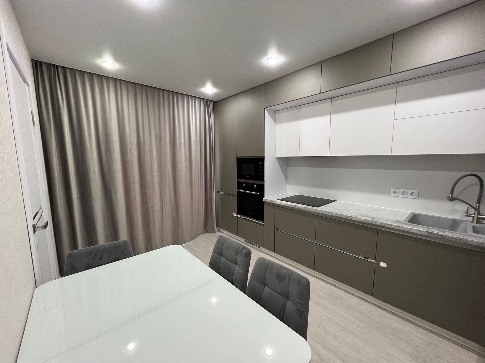 - в квартире остаётся: кухонный гарнитур со встроенной техникой (варочная панель, духовой шкаф, встроенная микроволновая печь, вытяжка), два шкафа-купе в прихожей, стенка под ТВ в гостиной зоне, рабочий стол с полками, все люстры