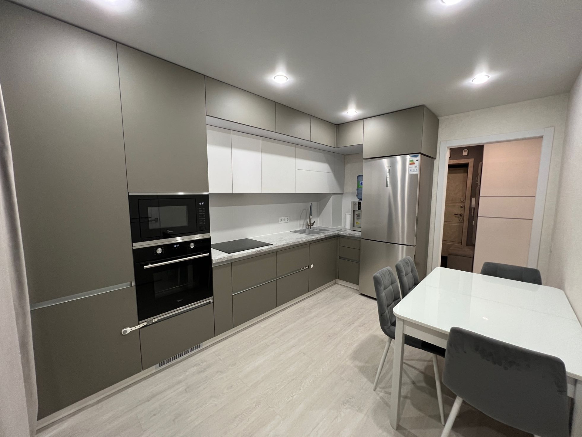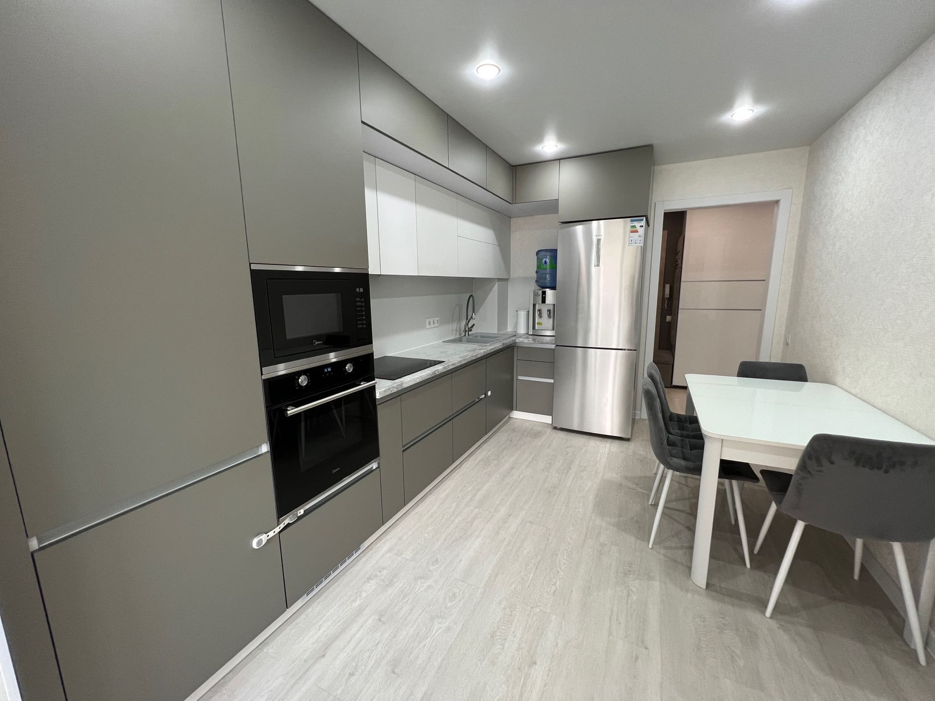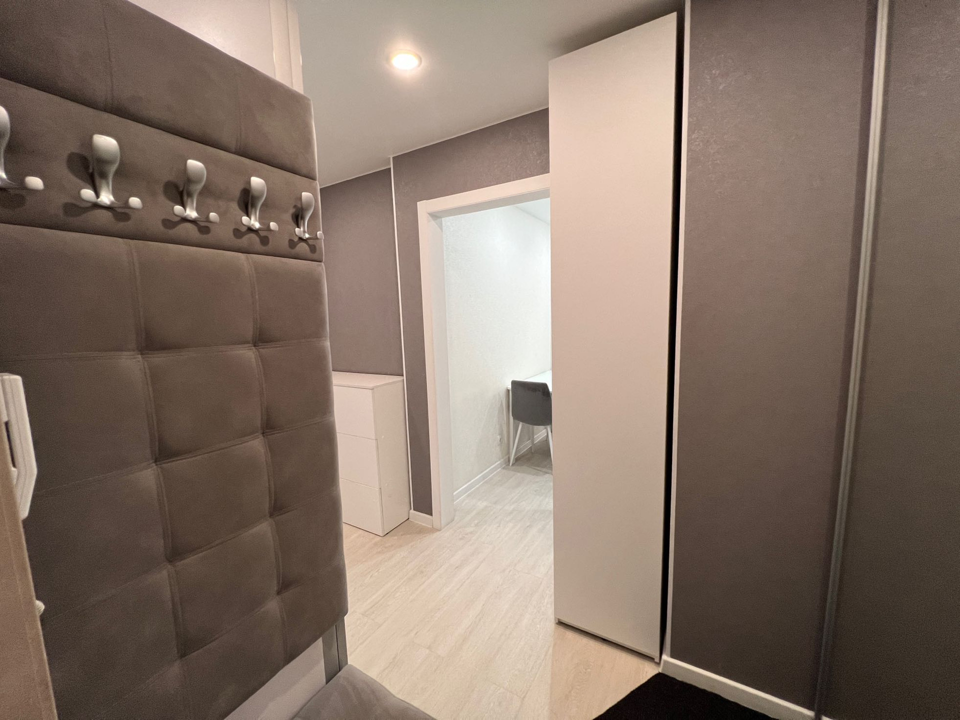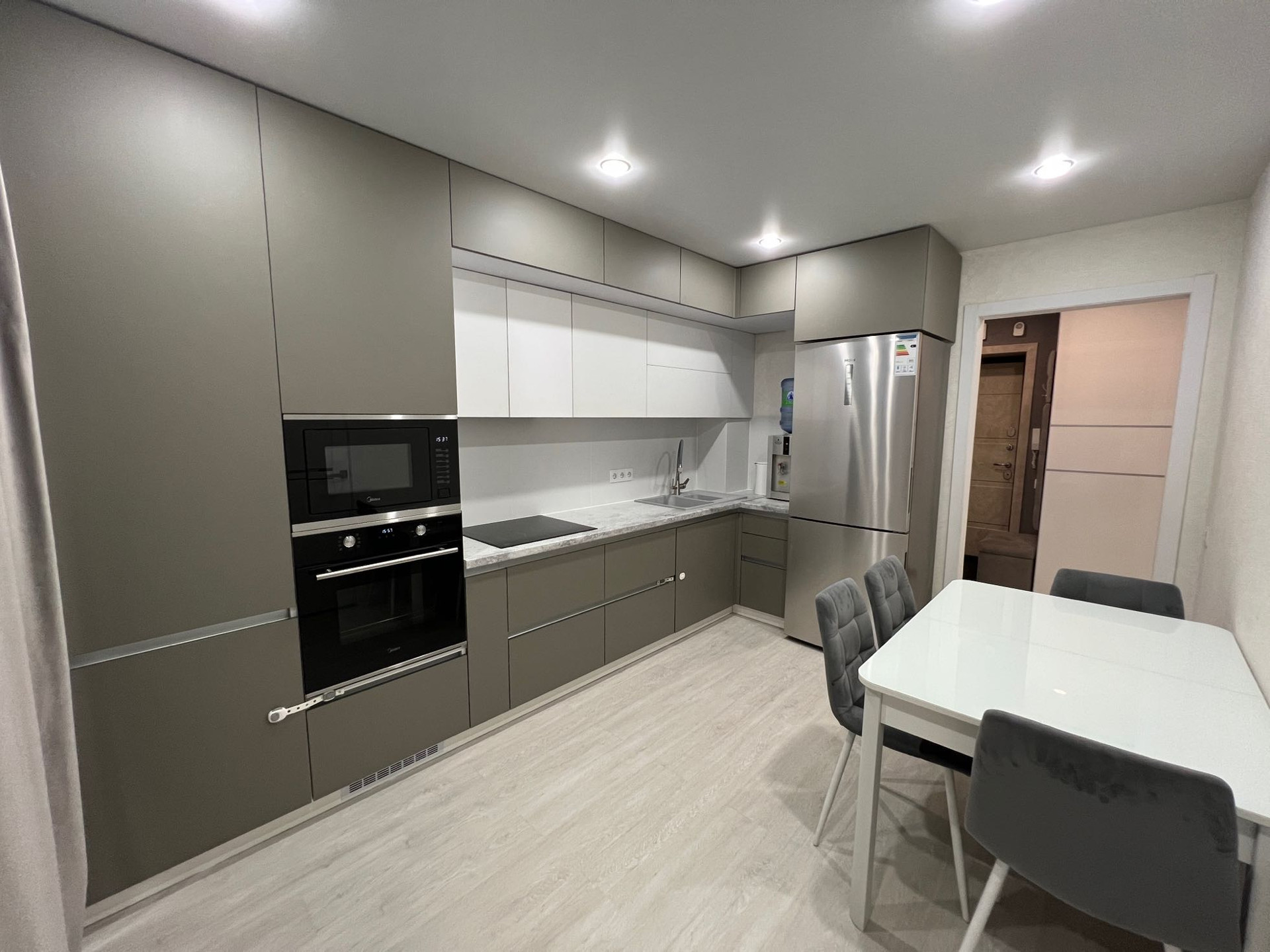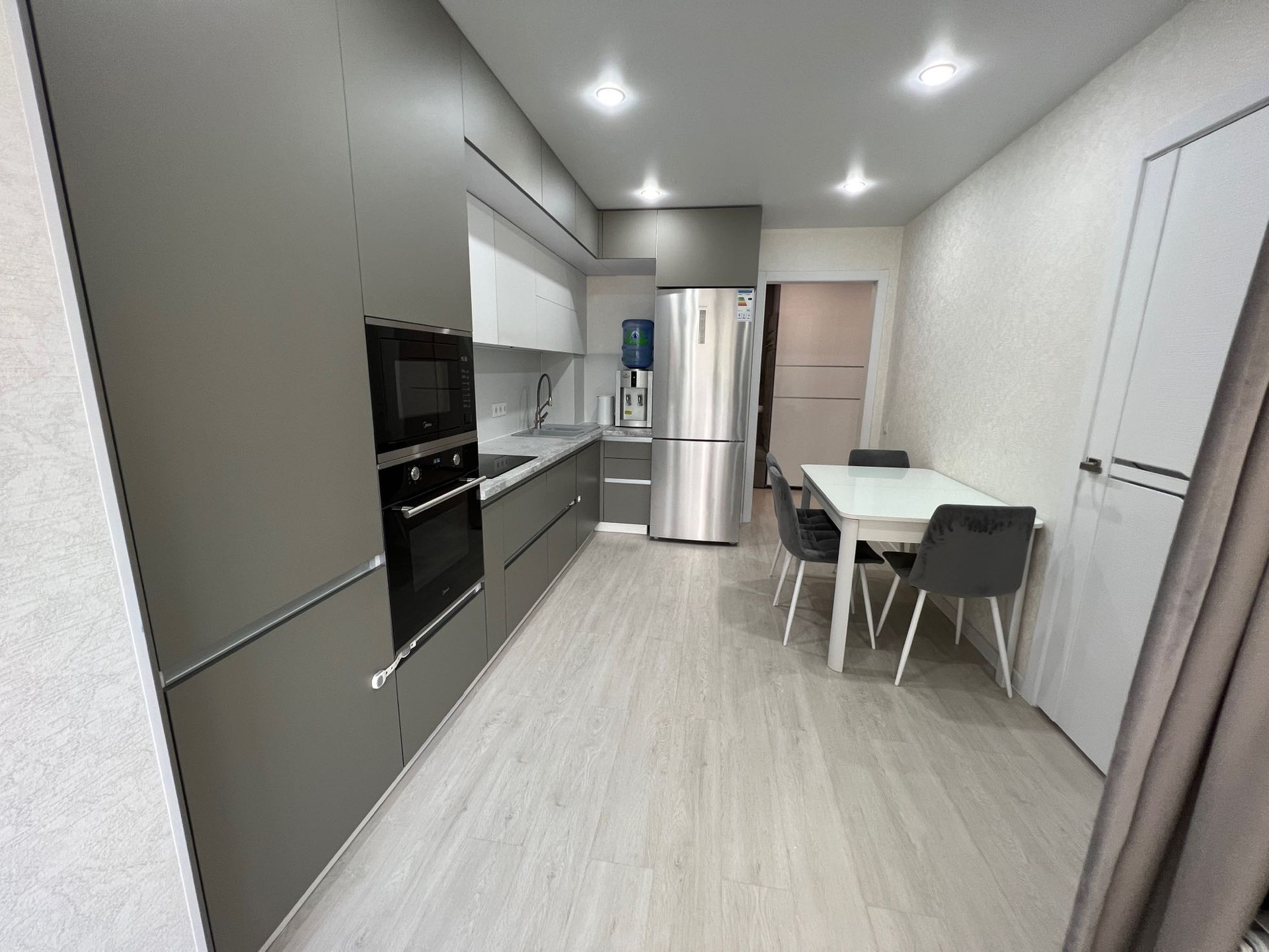 - в квартире остаётся: кухонный гарнитур со встроенной техникой (варочная панель, духовой шкаф, встроенная микроволновая печь, вытяжка), два шкафа-купе в прихожей, стенка под ТВ в гостиной зоне, рабочий стол с полками, все люстры