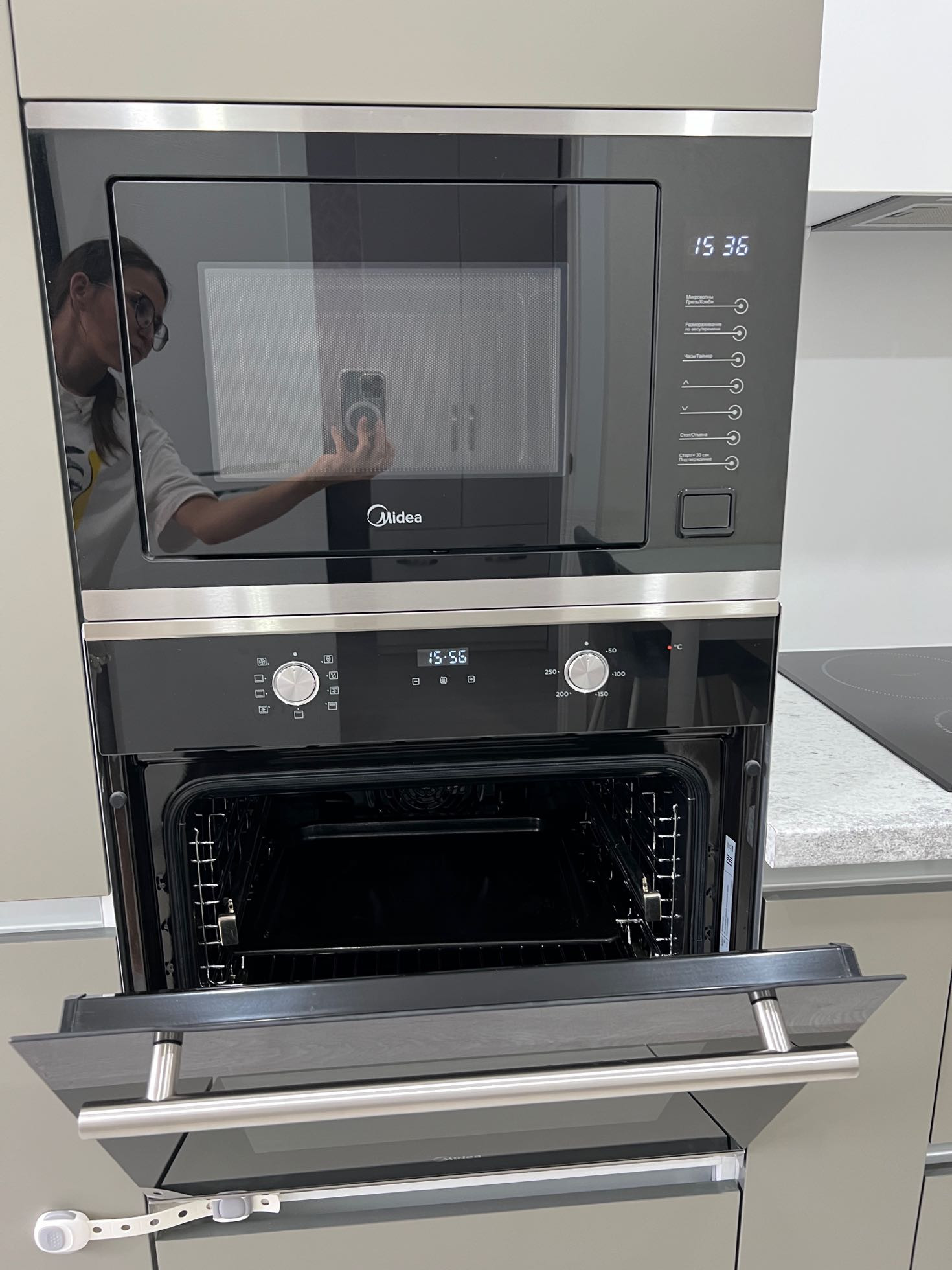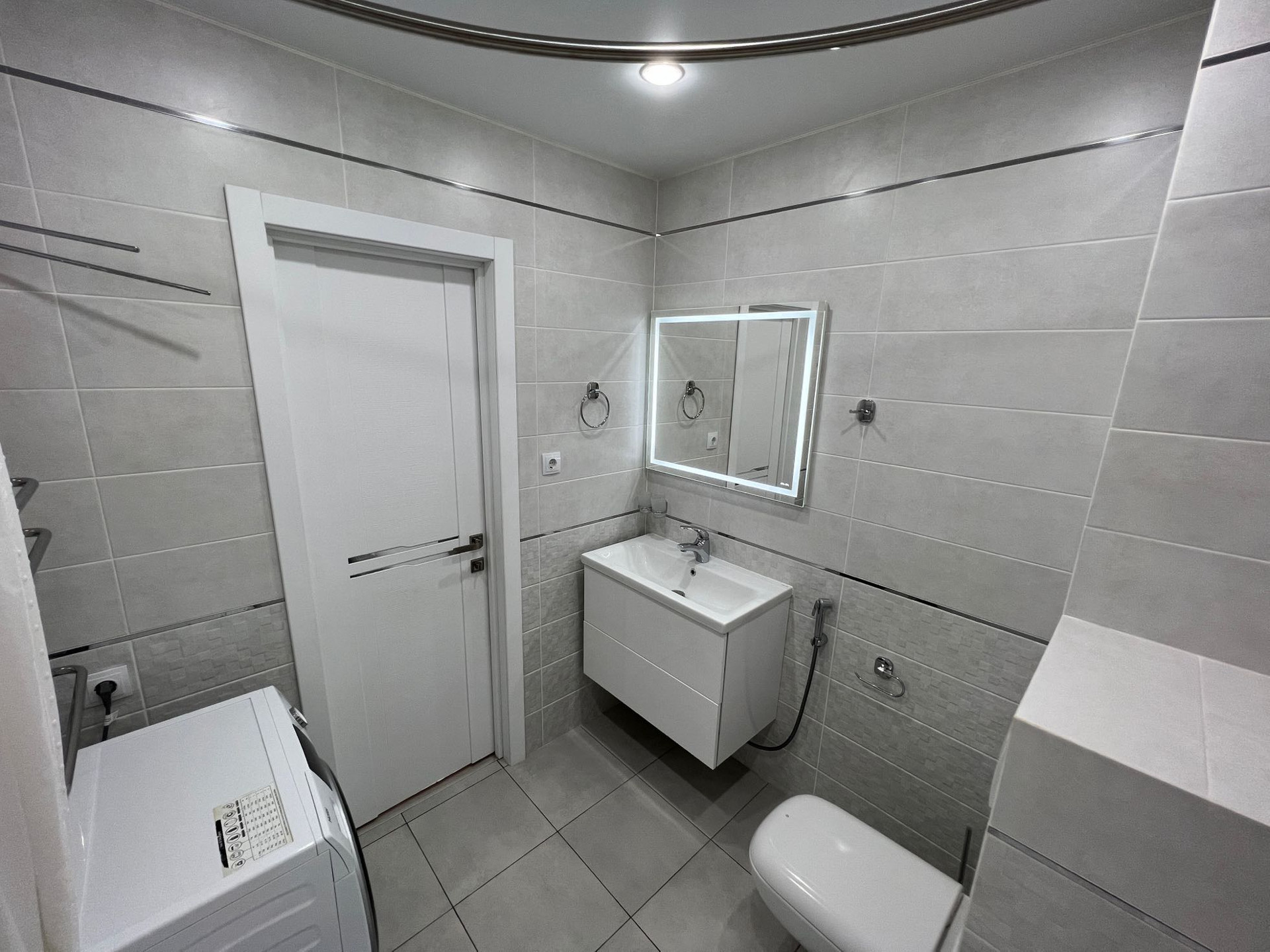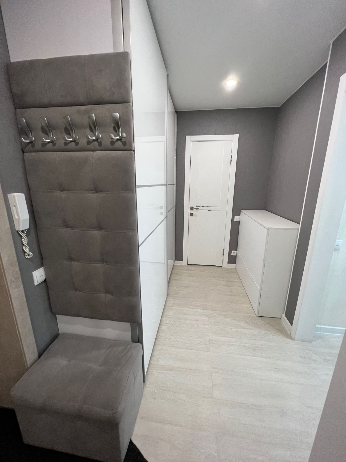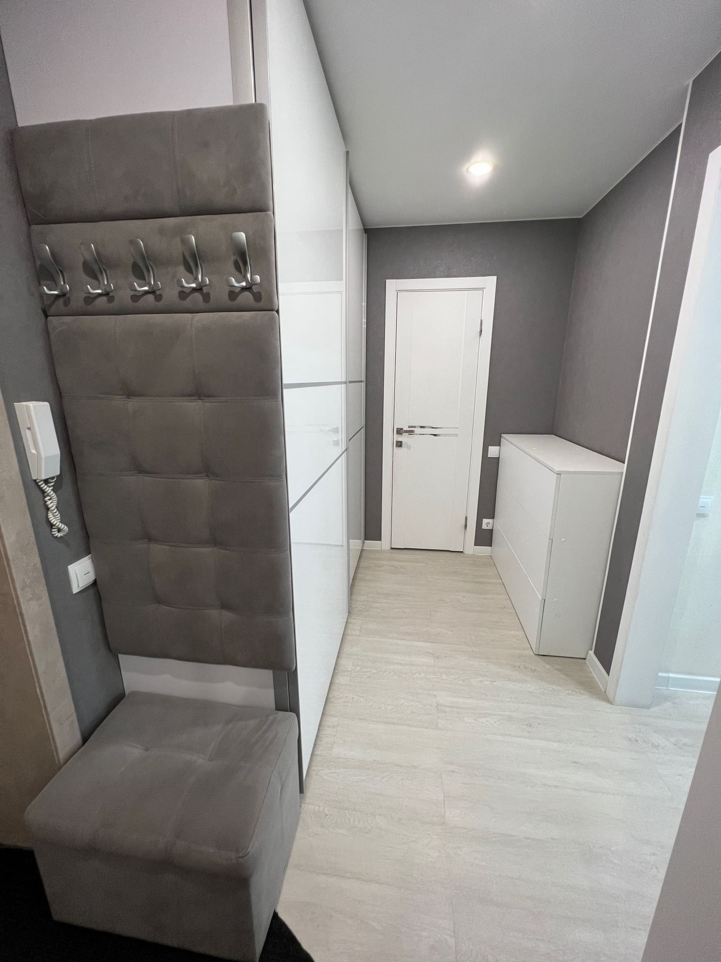 - в квартире остаётся: кухонный гарнитур со встроенной техникой (варочная панель, духовой шкаф, встроенная микроволновая печь, вытяжка), два шкафа-купе в прихожей, стенка под ТВ в гостиной зоне, рабочий стол с полками, все люстры