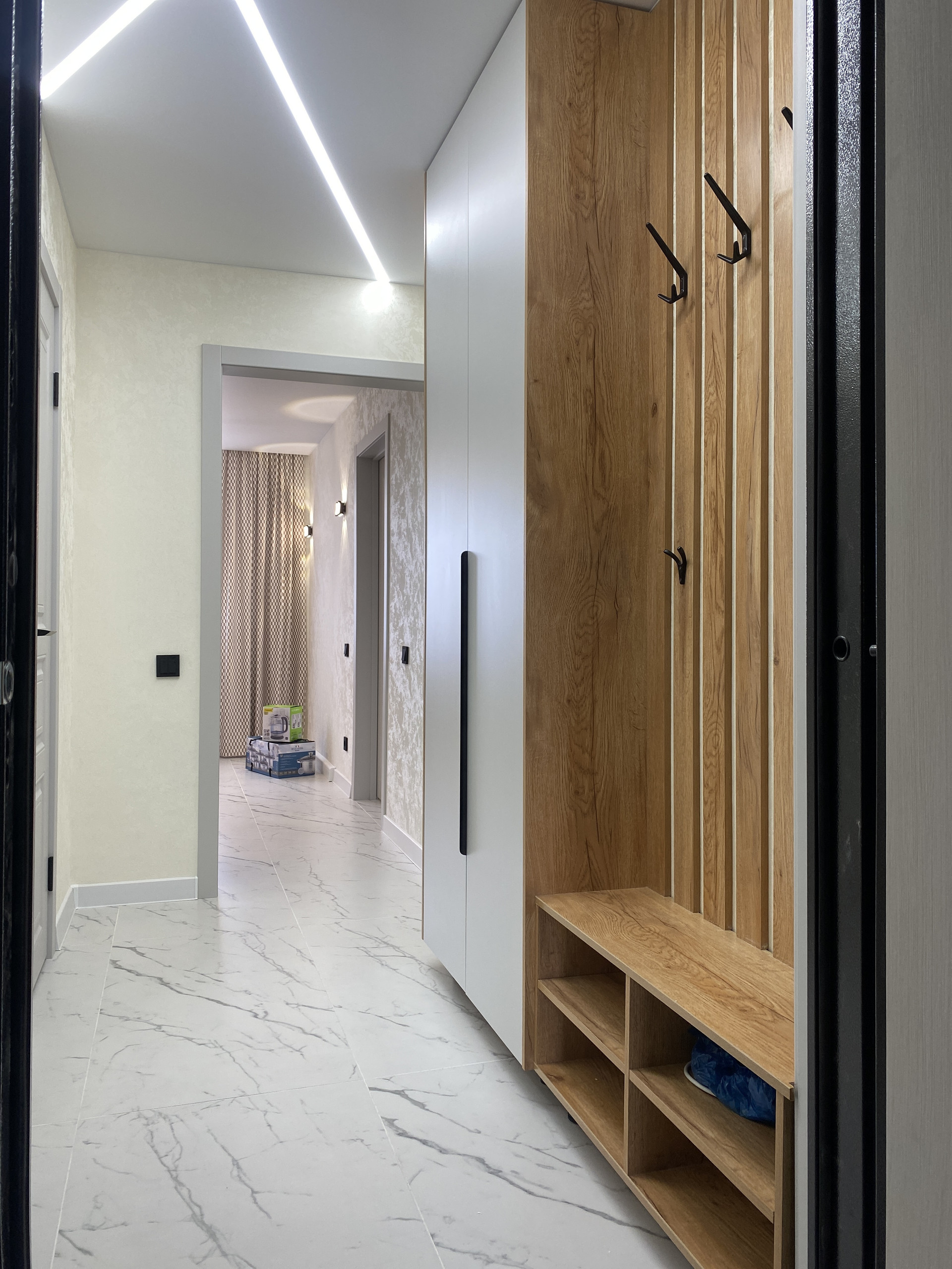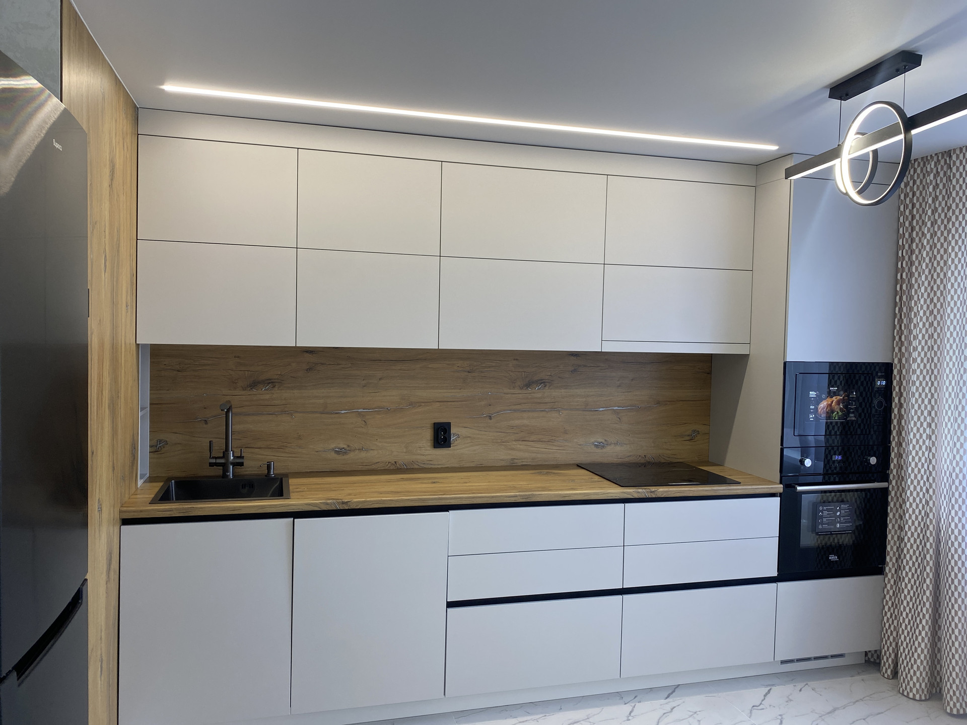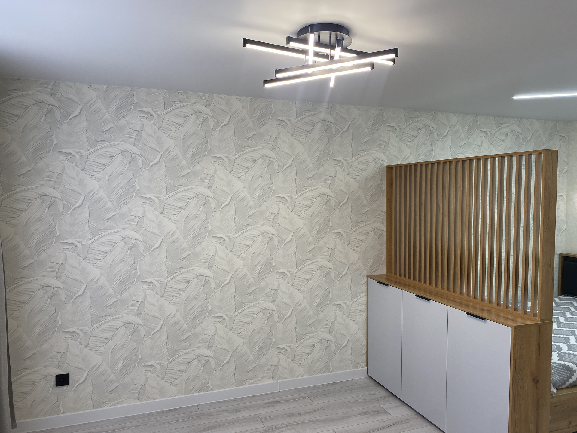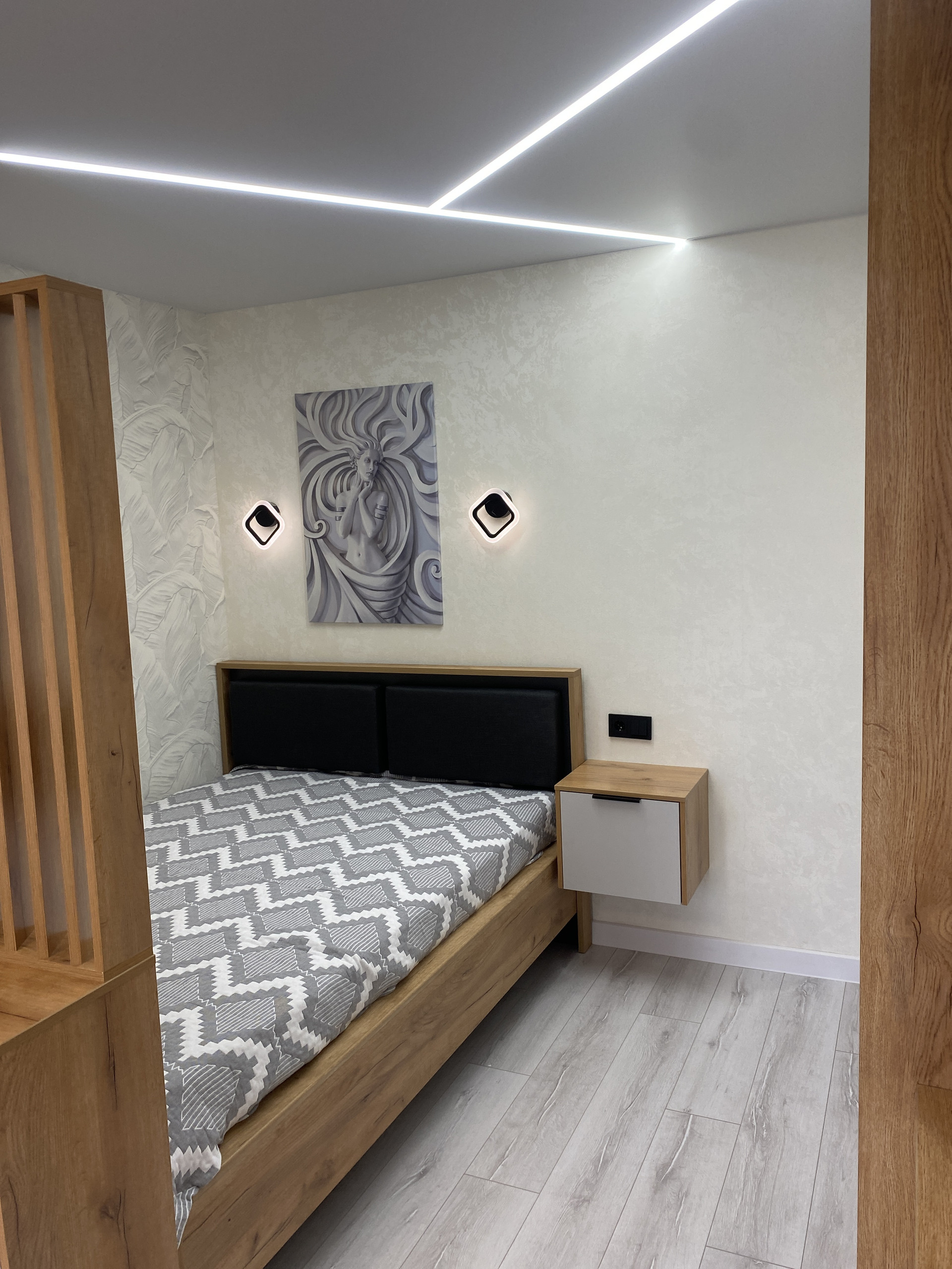 Потолок по всей квартире установлен натяжной (сатин), установлены люстры с регулировкой интенсивности освещения и точечные светильники, на кухне в прихожей и в спальной зоне встроены световые линии..