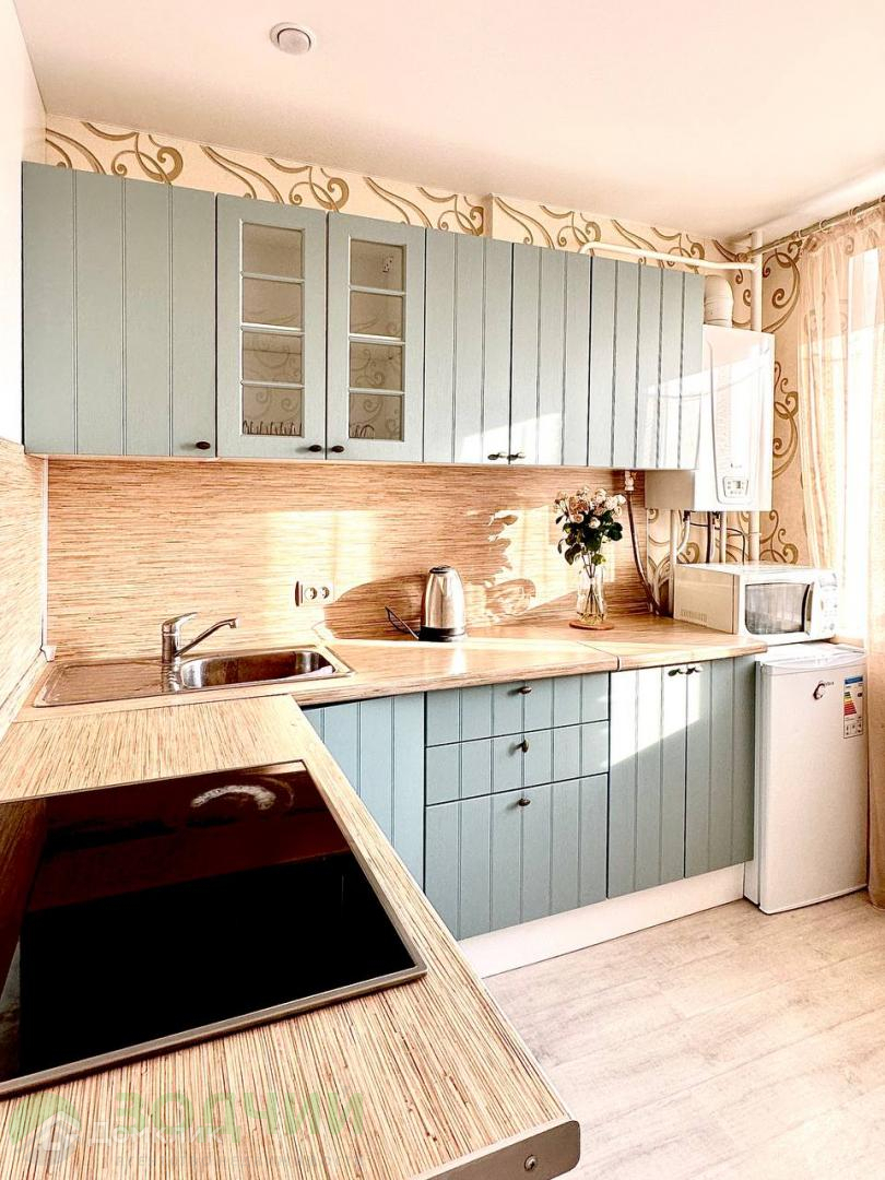 На полу уложен качественный ламинат, в санузле керамогранит . На кухне остается гарнитур, с варочной поверхностью и холодильник. Потолки натяжные с точечными светильниками.