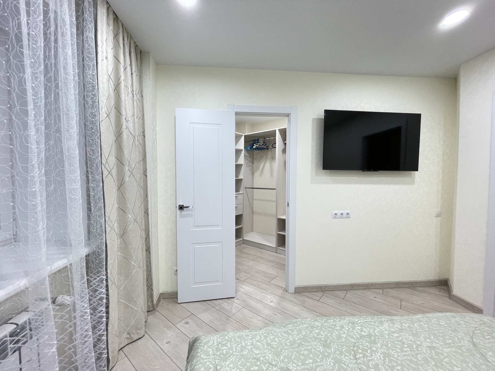 Для комфортного и приятного времяпровождения в гостинной комнате установлен  проекционный экран с пультом для просмотра фильмов.