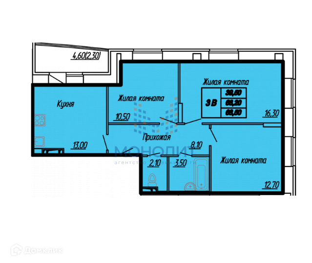 Общая площадь 68.5 м2