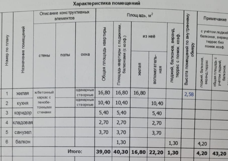 Общая площадь 39 м2