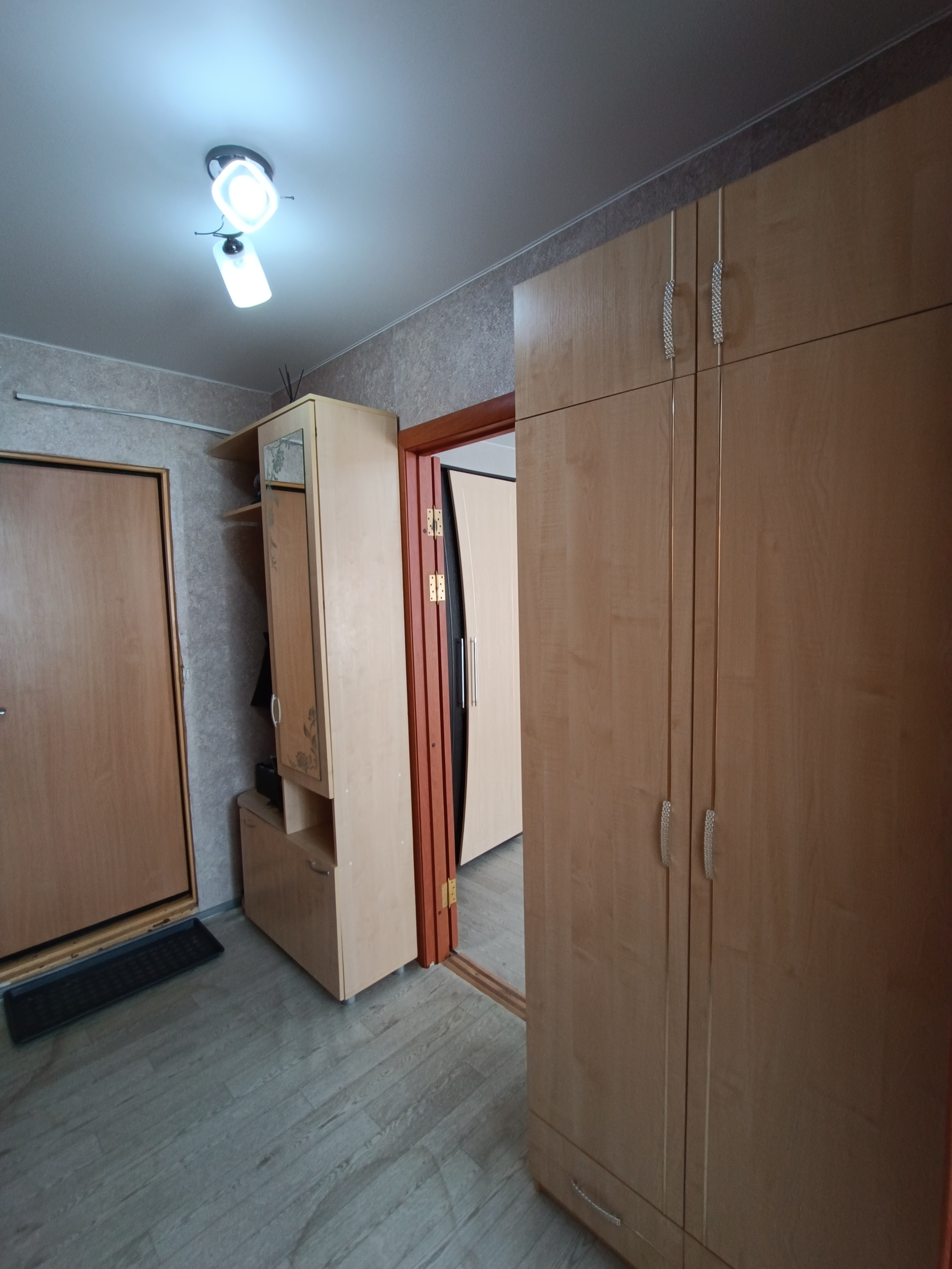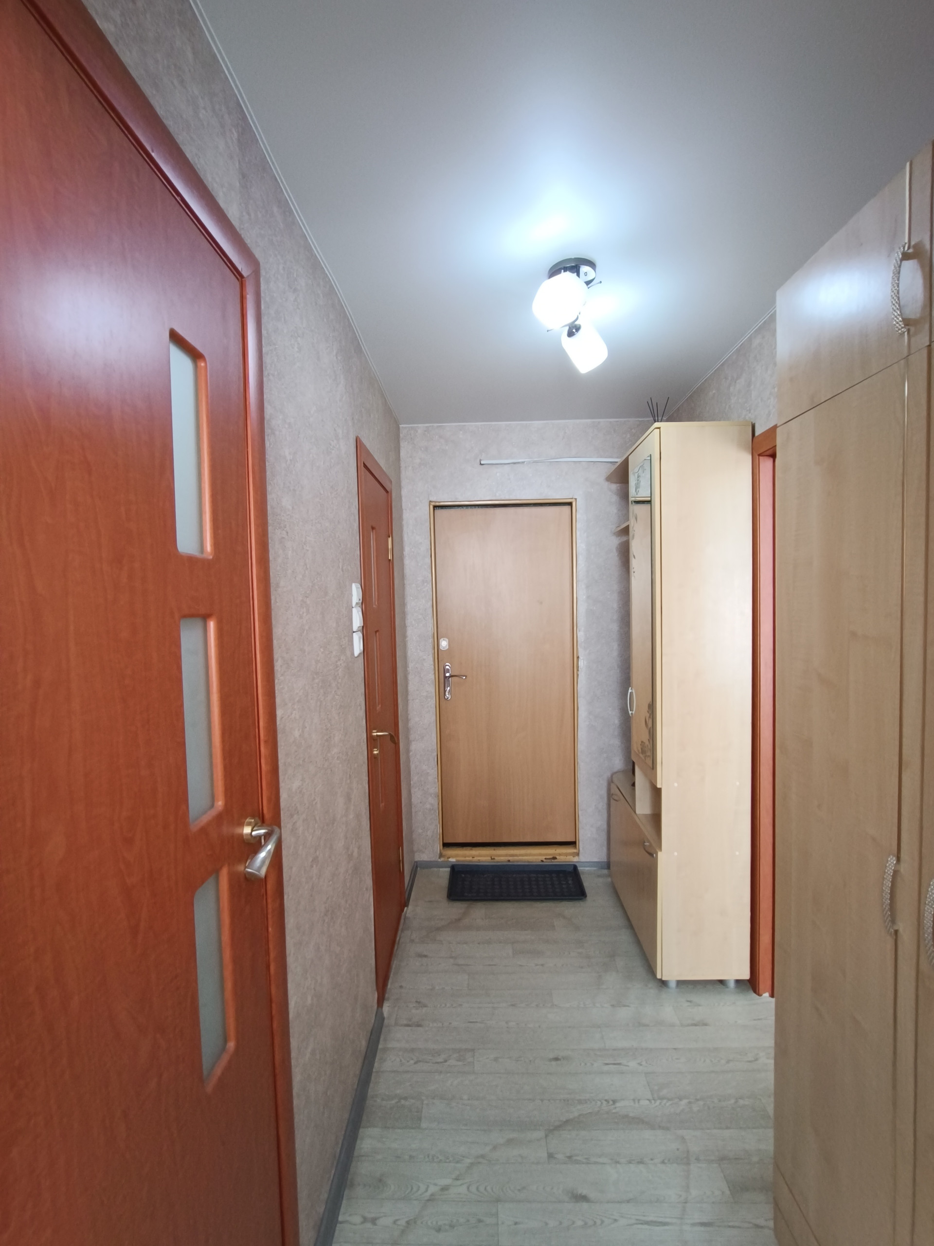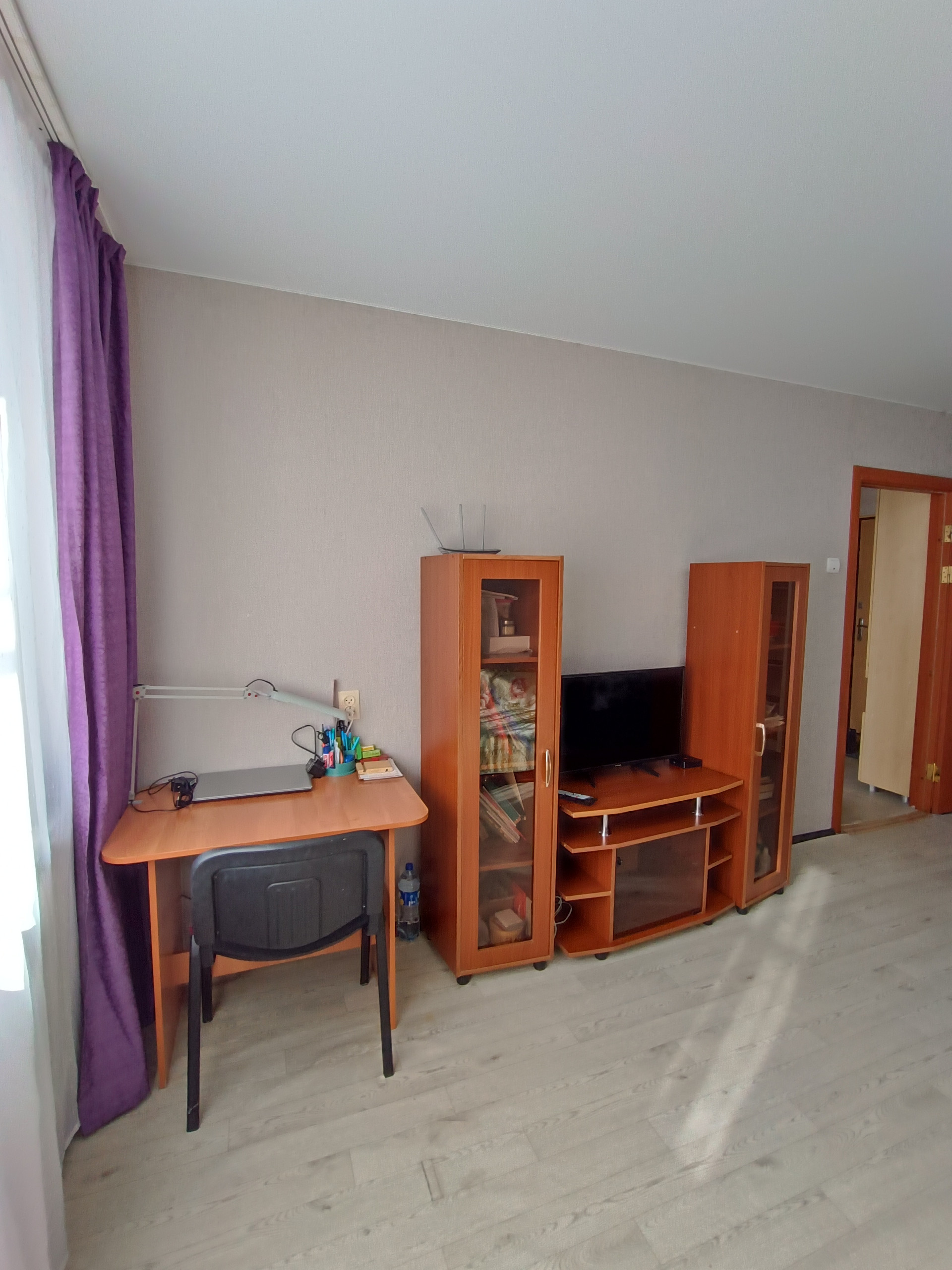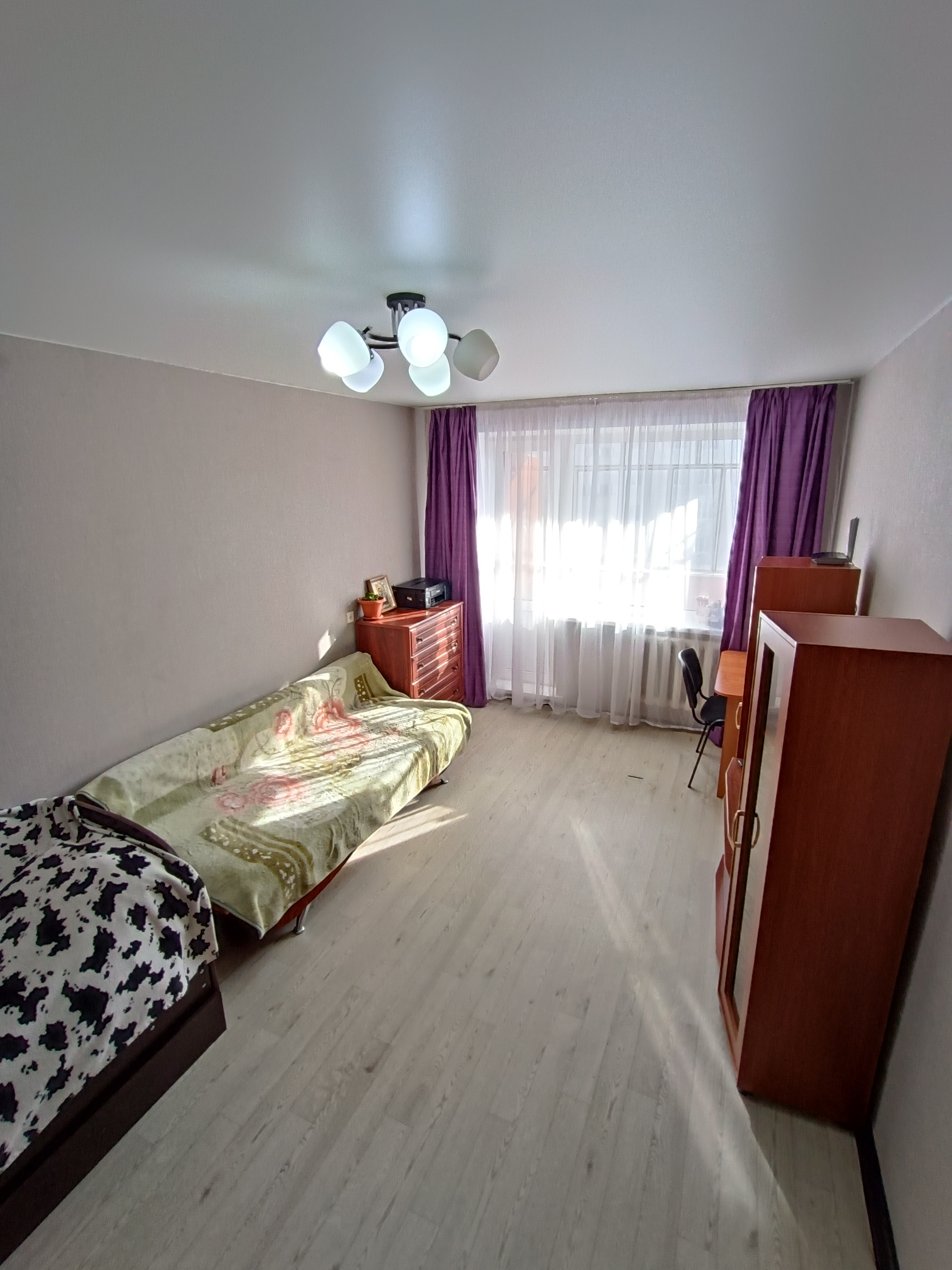 Квартира очень светлая, натяжные потолки, по всей квартире установлены стеклопакеты, окно квартиры выходят во двор.