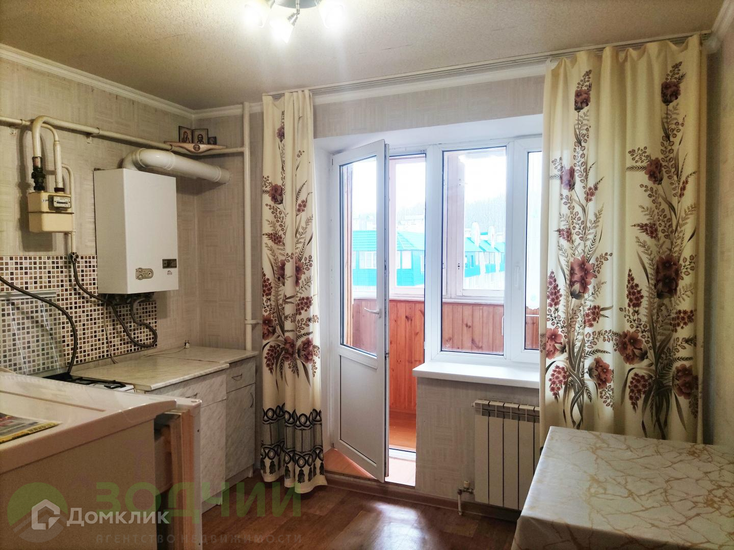 Просторная кухня и обшитая лоджия.