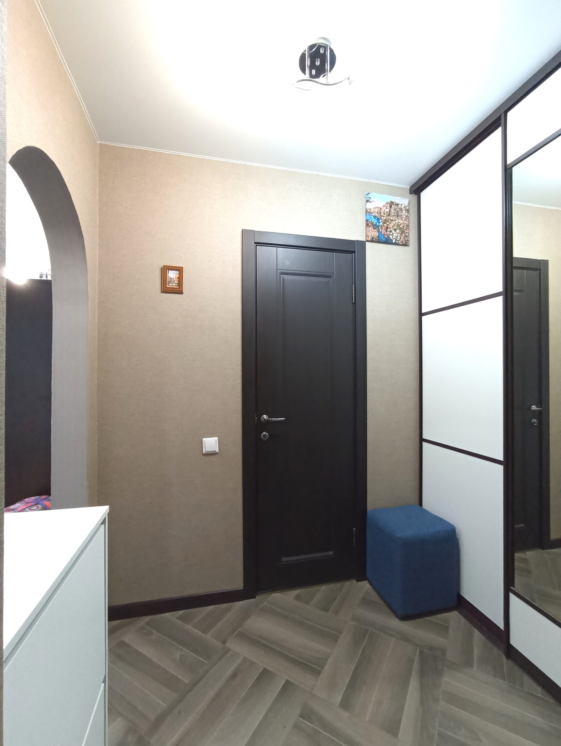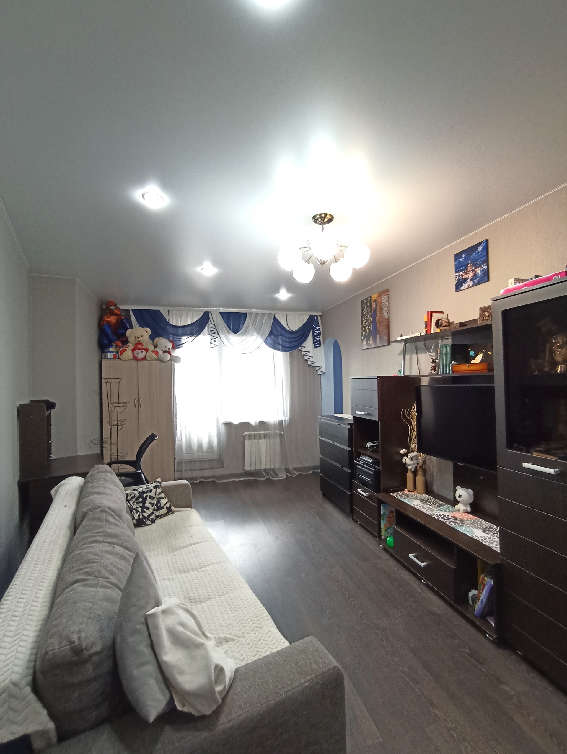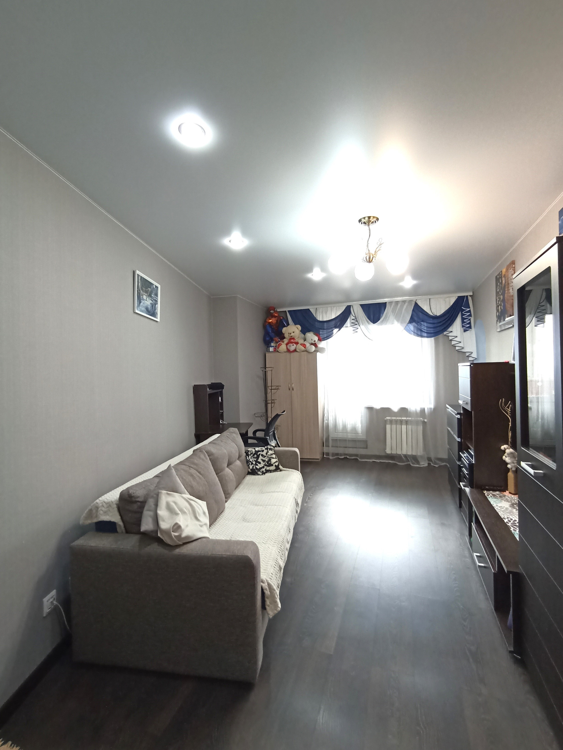 В квартире выполнен отличный ремонт. На полу ламинат, натяжной потолок, окна ПВХ. Санузел облицован плиткой и установлена современная сантехника. Теплые полы в ванной комнате. Имеется лоджия с выходом из зала, застеклена. Красивый вид из окна и доброжелательные соседи.