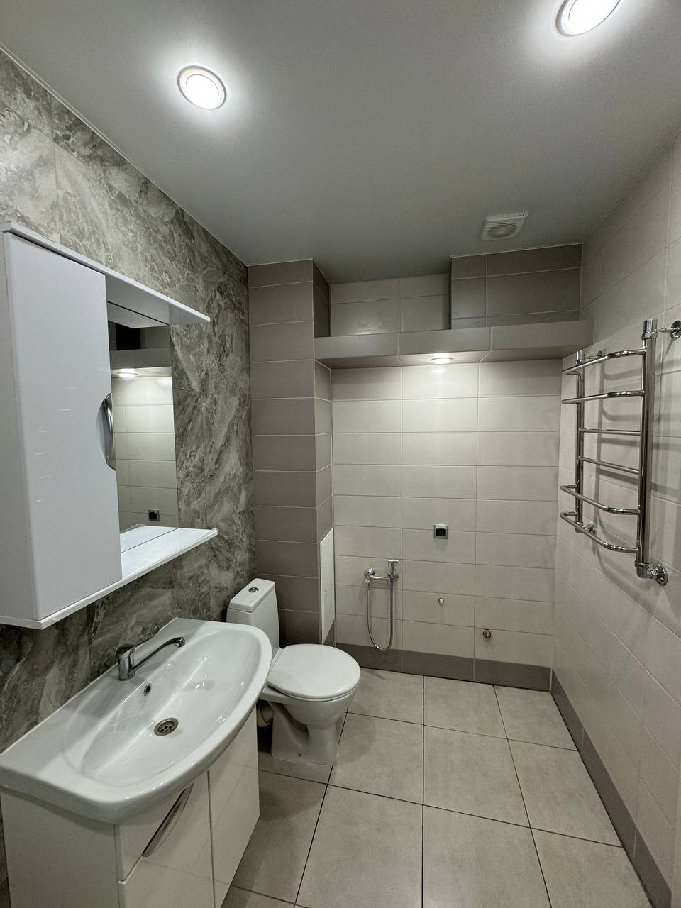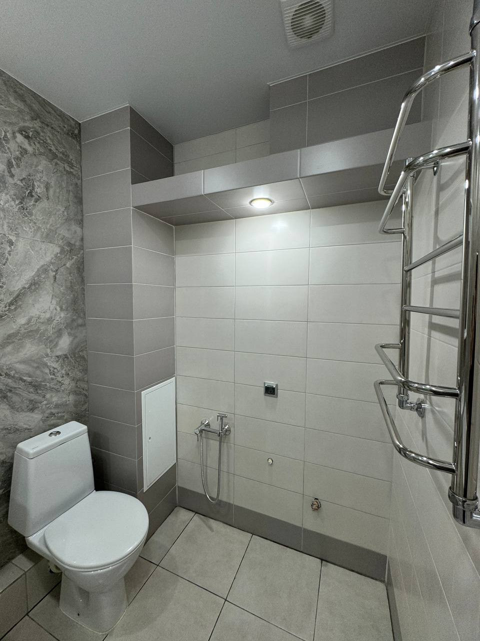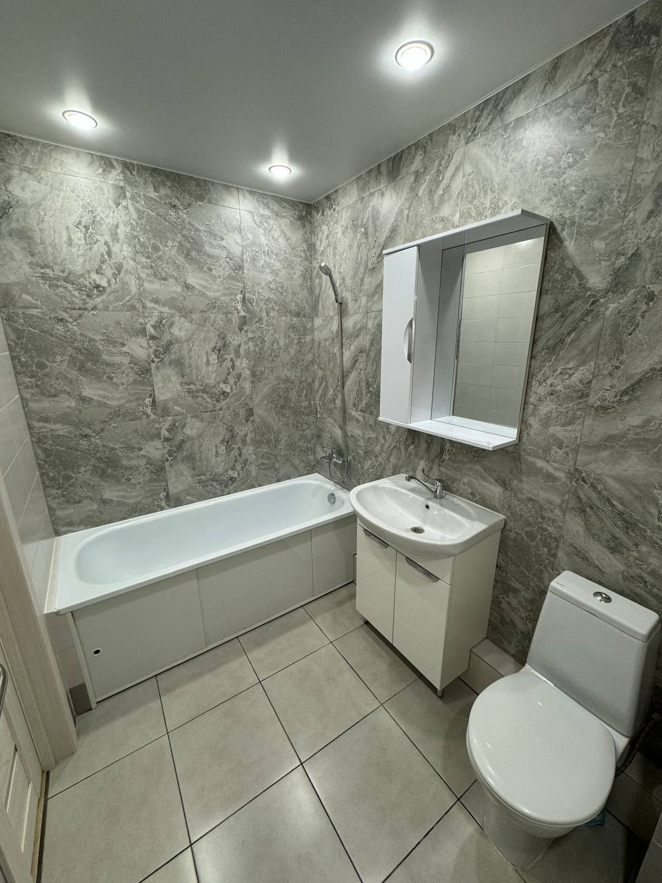 Санузел облицован плиткой нового образца, установлена вся сантехника.