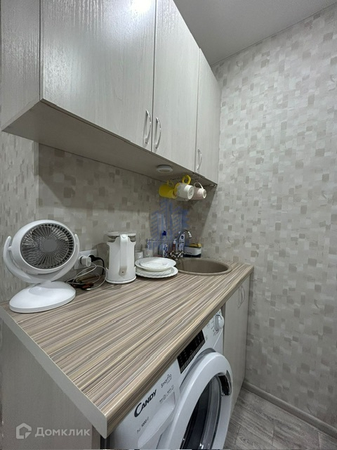 В студии установлено пластиковое окно, натяжной потолок, линолеум под ламинат, светлые обои. В комнате остается кухонная ниша, новая стиральная машинка, диван, шкаф, обувница.