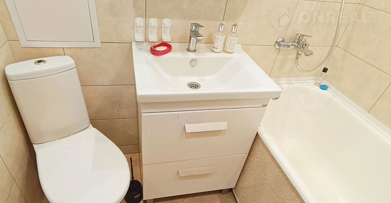 - cанузел совмещённый, облицован кафелем нового образца, установлена ванна, раковина с тумбой, унитаз