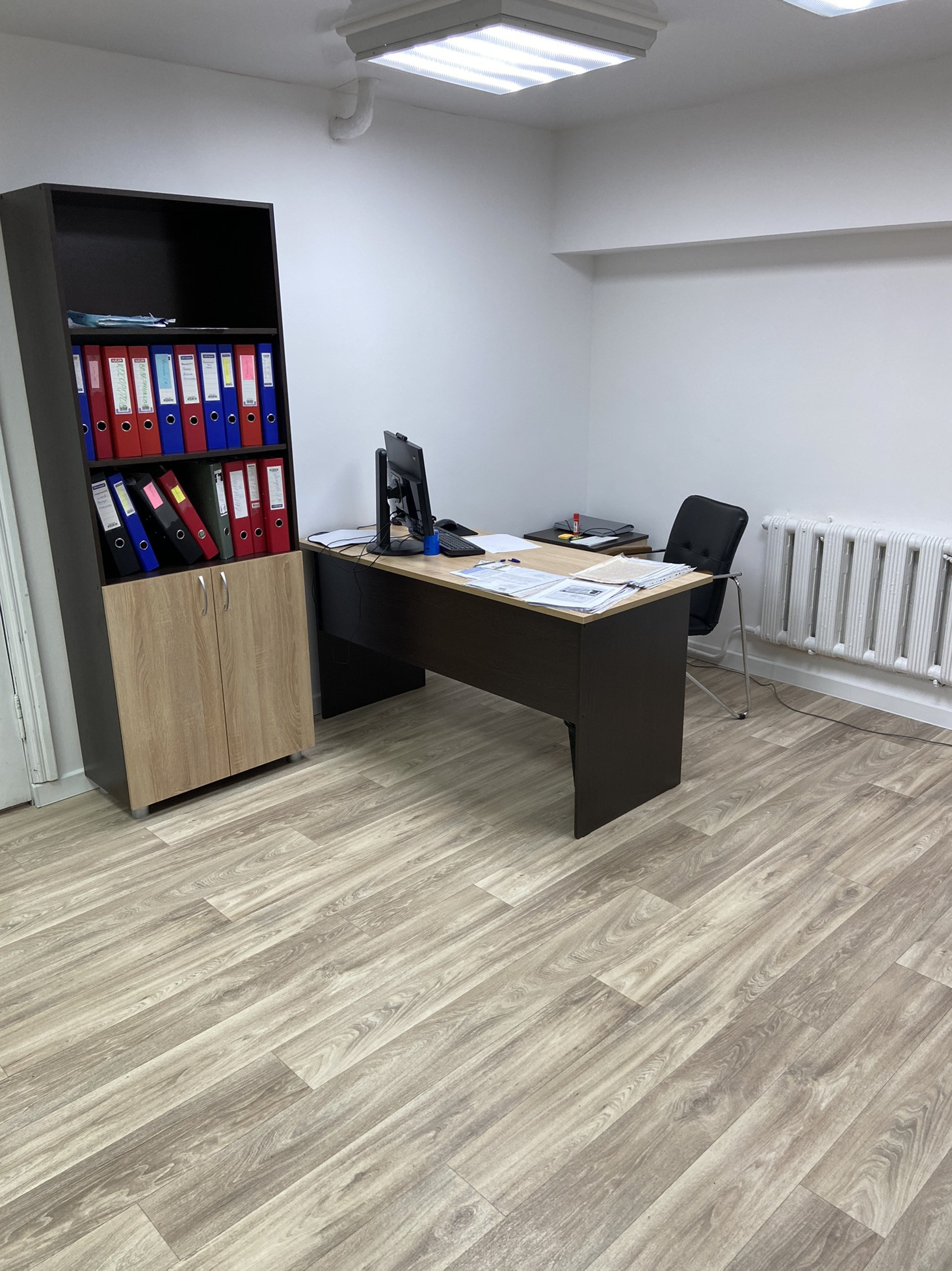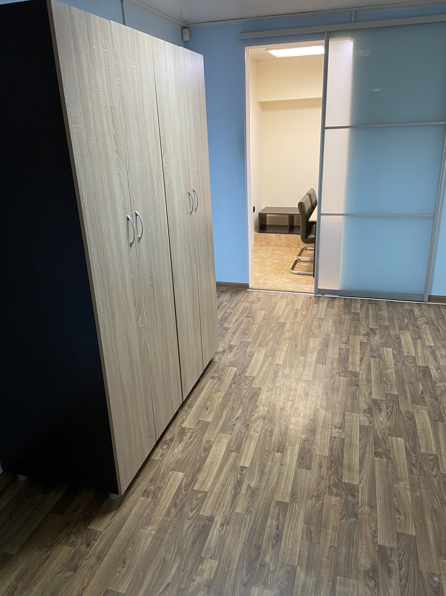 Офис разделён на кабинет руководителя кабинет сотрудников, переговорная, зона для ожидания посетителей, кухня, архив для документов, небольшой склад для бытовых вещей и ещё один склад под документы или хранения различных вещей, который можно переделать под отдельный кабинет, санузел.
