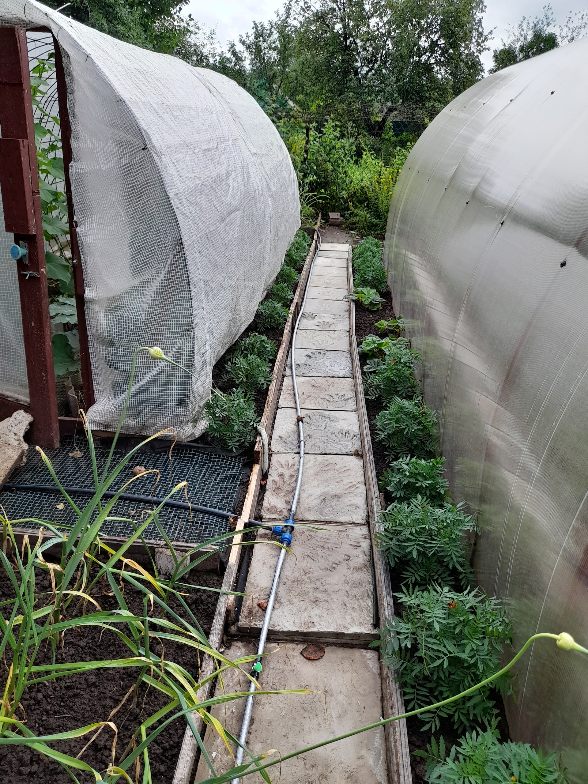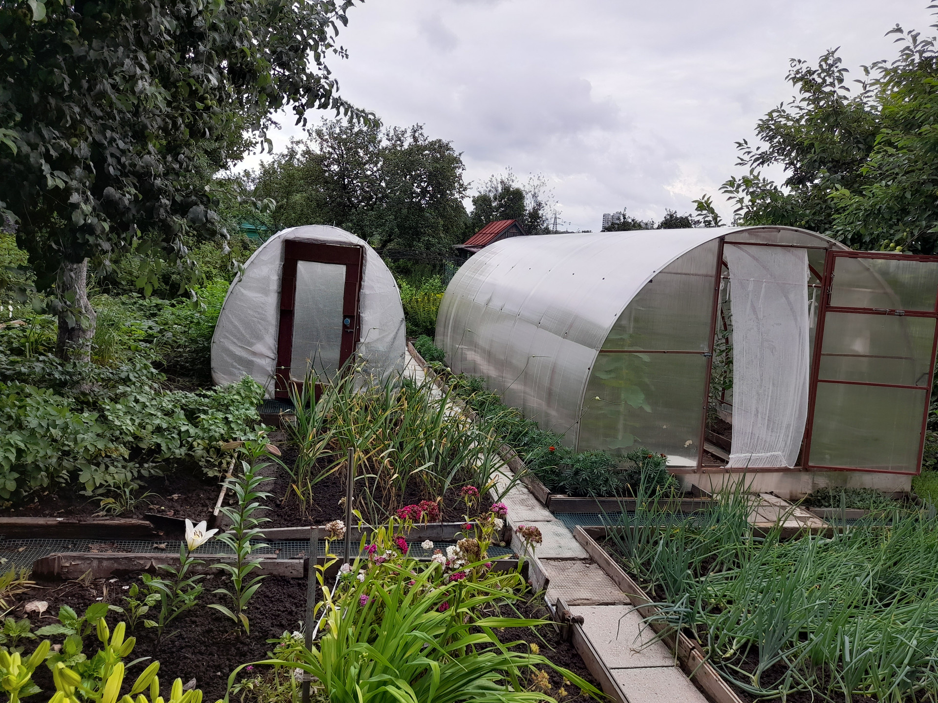 Грядки с двумя теплицами и плодово-ягодными деревьями