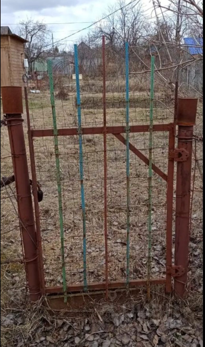 Забор - сетка рабица и железные столбы.Вдоль забора посажен хмель.