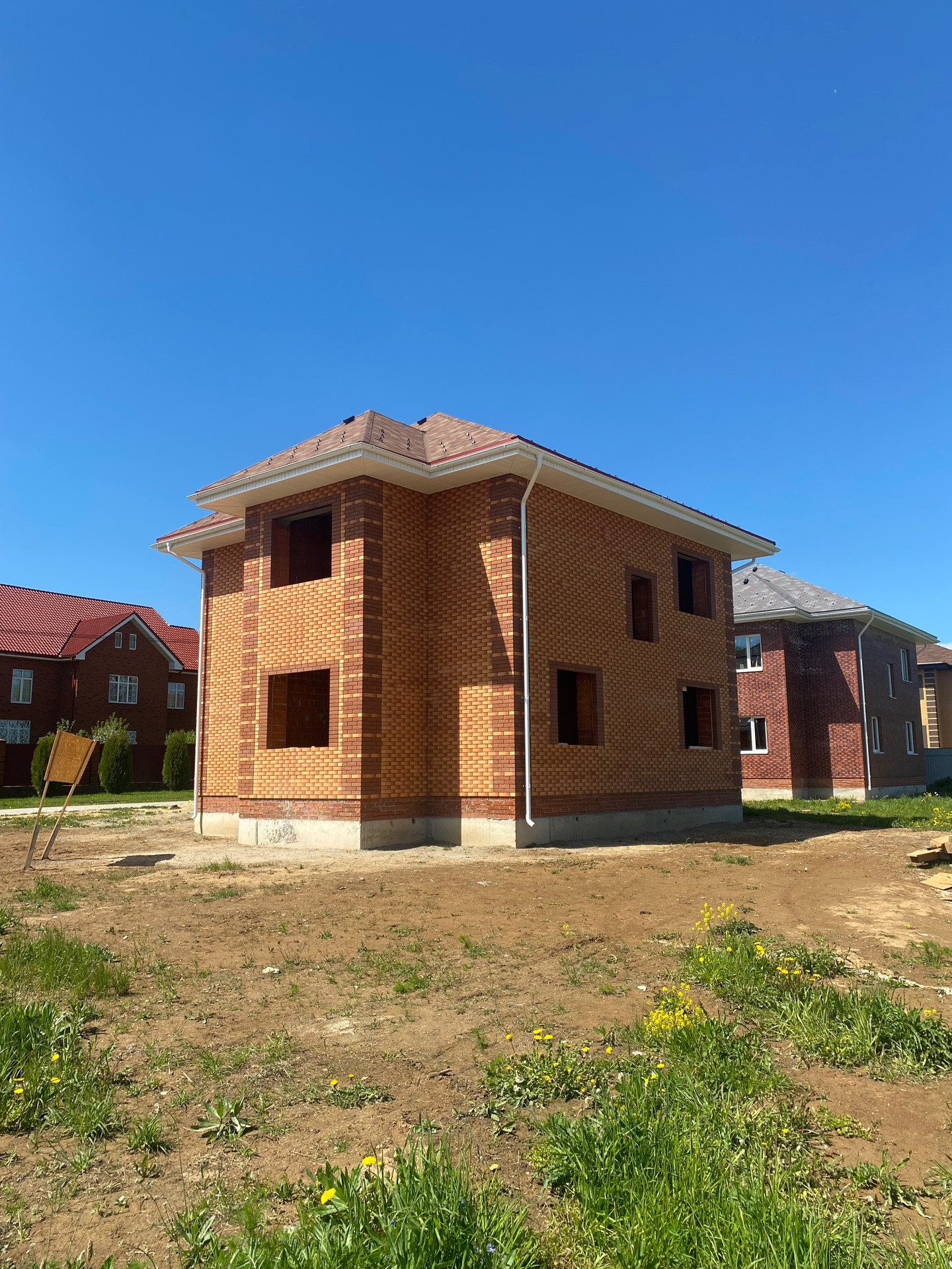 Дом построен из кирпича, фасад здания выложен облицовочным кирпичом,