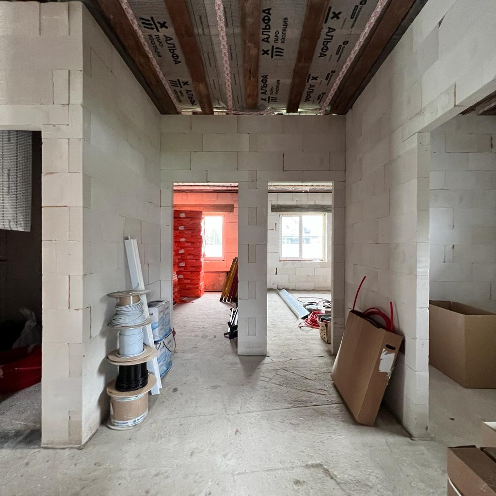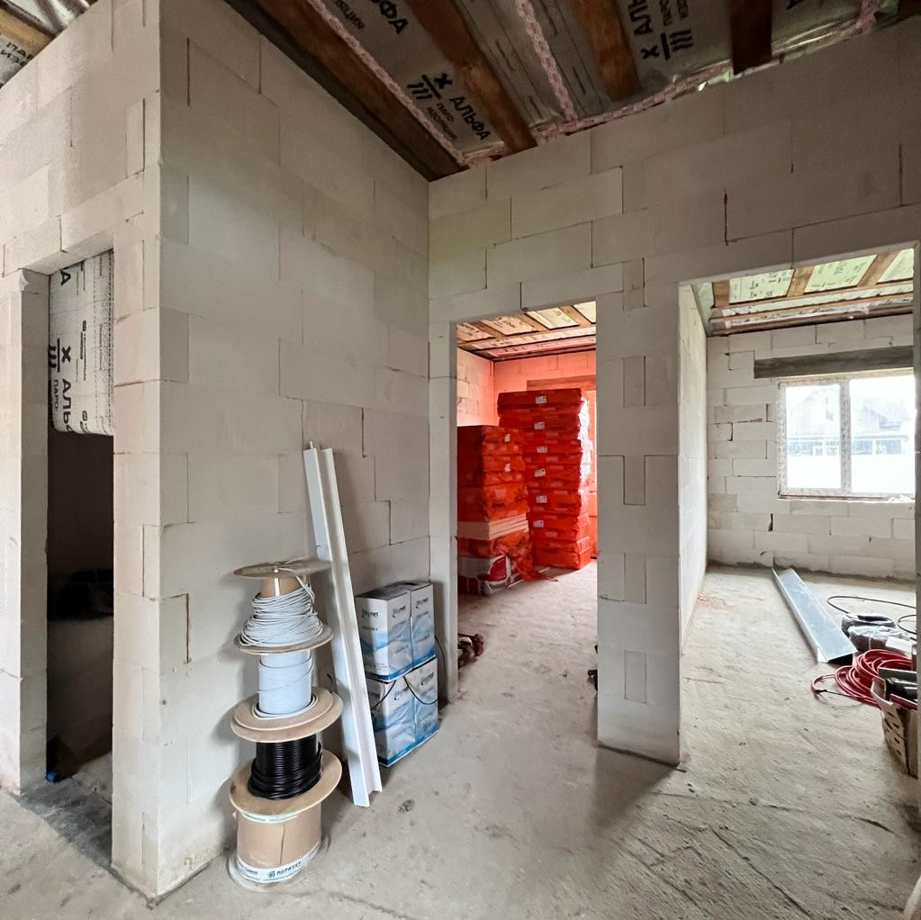 Коммуникации: электричество 15кВт, скважина, канализация септик «Топаз», отопление – электрическое. Всё подведено, подключено и разведено по дому. Газ магистральный по границе участка.