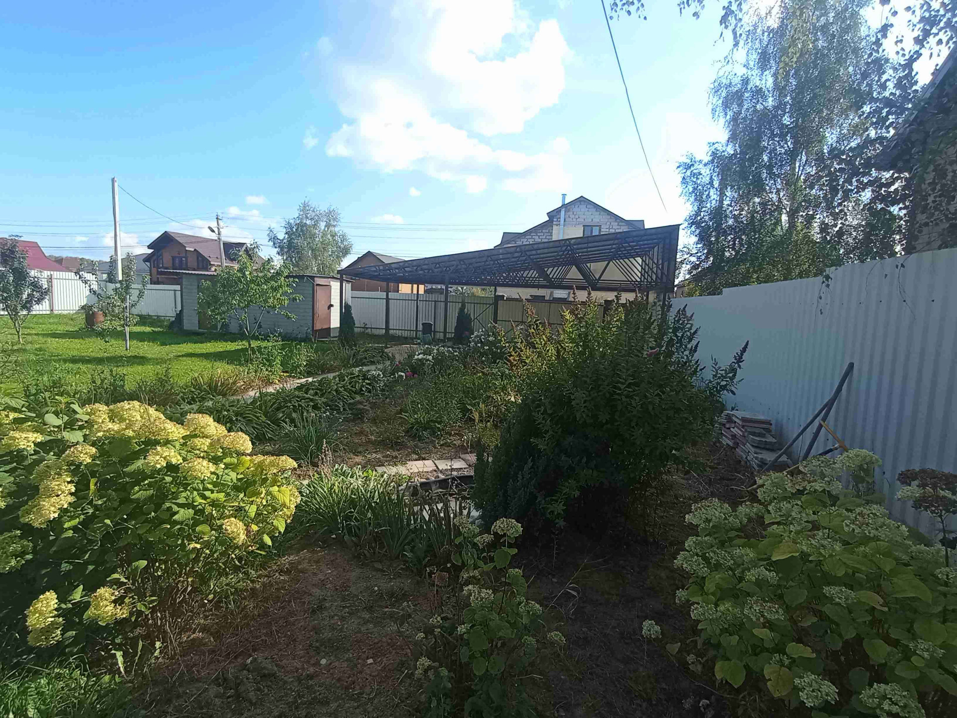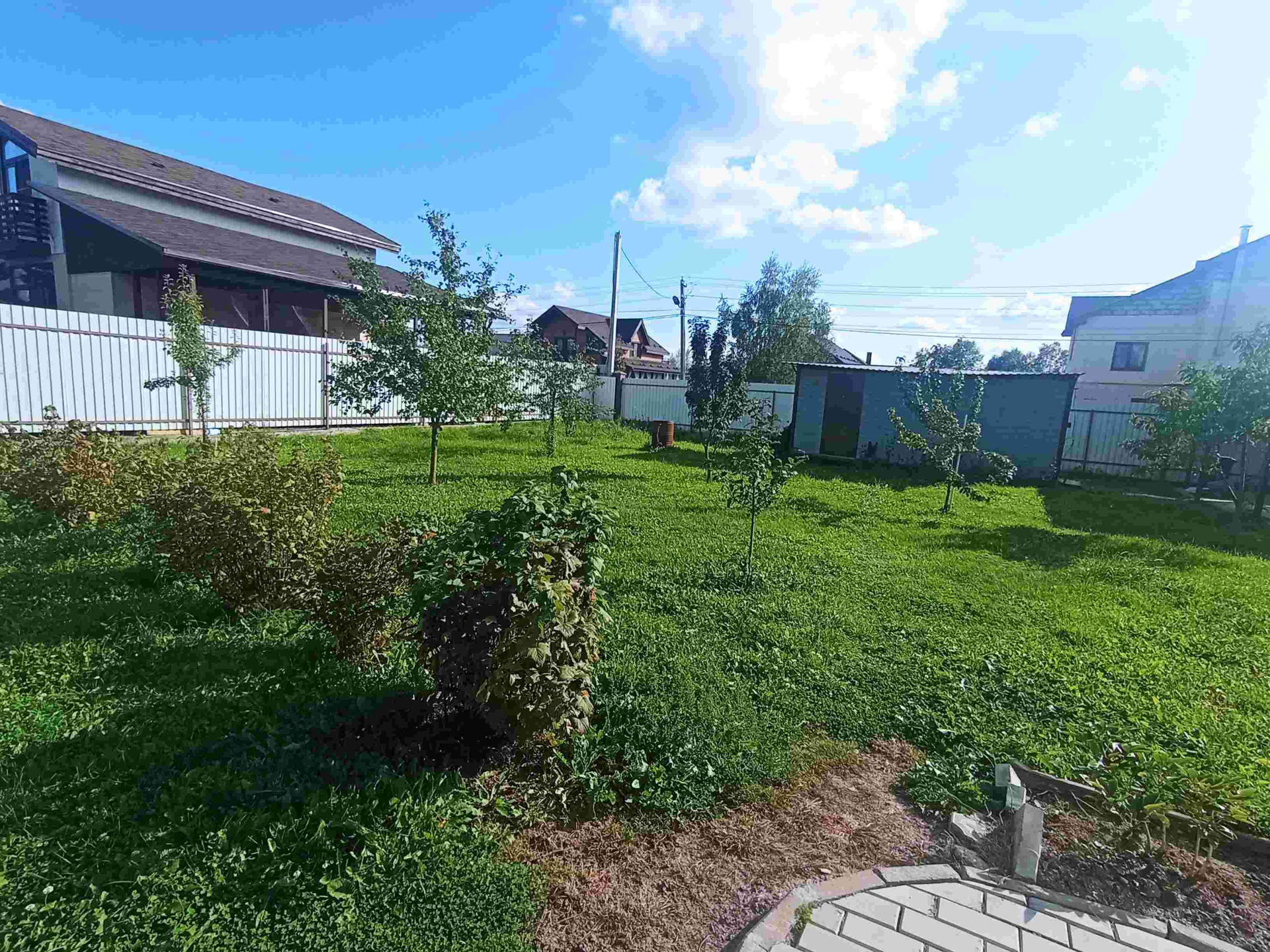 Участок по всему периметру огорожен забором, ворота откатные автоматические, навес под 2 автомобиля. Участок ухоженный, ландшафтный дизайн, много насаждений тропинки из брусчатки, газон. На участке расположены хозблок для садового инвентаря, парник из поликарбоната.
