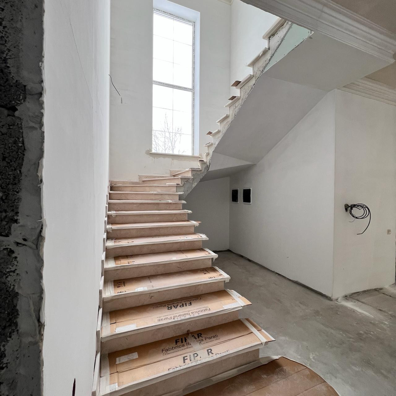 В доме уже установлена дорогостоящая мраморная лестница и мраморные подоконники, всё в одном стиле. Потолок отделан гипсом. Использовались только дорогие и качественные материалы. Все делалось для себя!!!