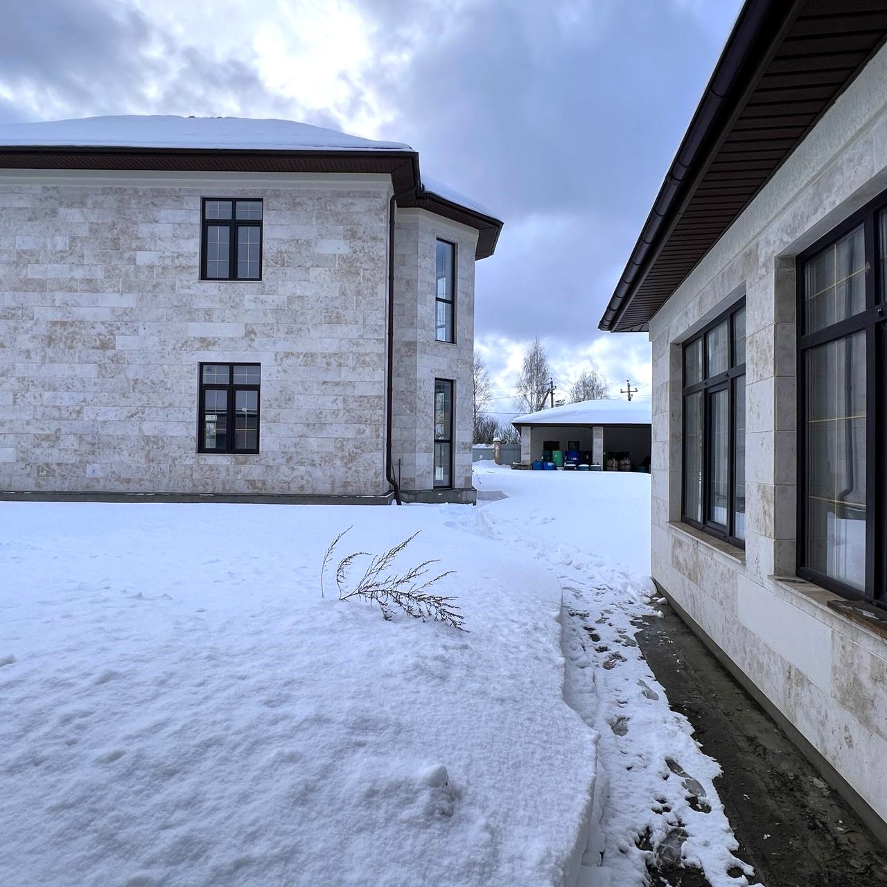 За домом – готовое одноэтажное здание капитального строения, 160 кв.м.. Здесь расположена отдельная бойлерная комната, однокомнатная квартира (спальня, кухня, с/у) для персонала, гостевой зал с отдельным входом и большой банкетный зал с отдельным входом, в этих помещениях установлен с/у и выделена зона для кухни. Это здание можно использовать под аренду или бизнес (проводить банкеты, бьюти-индустрия). Все постройки на участке в одном стиле.