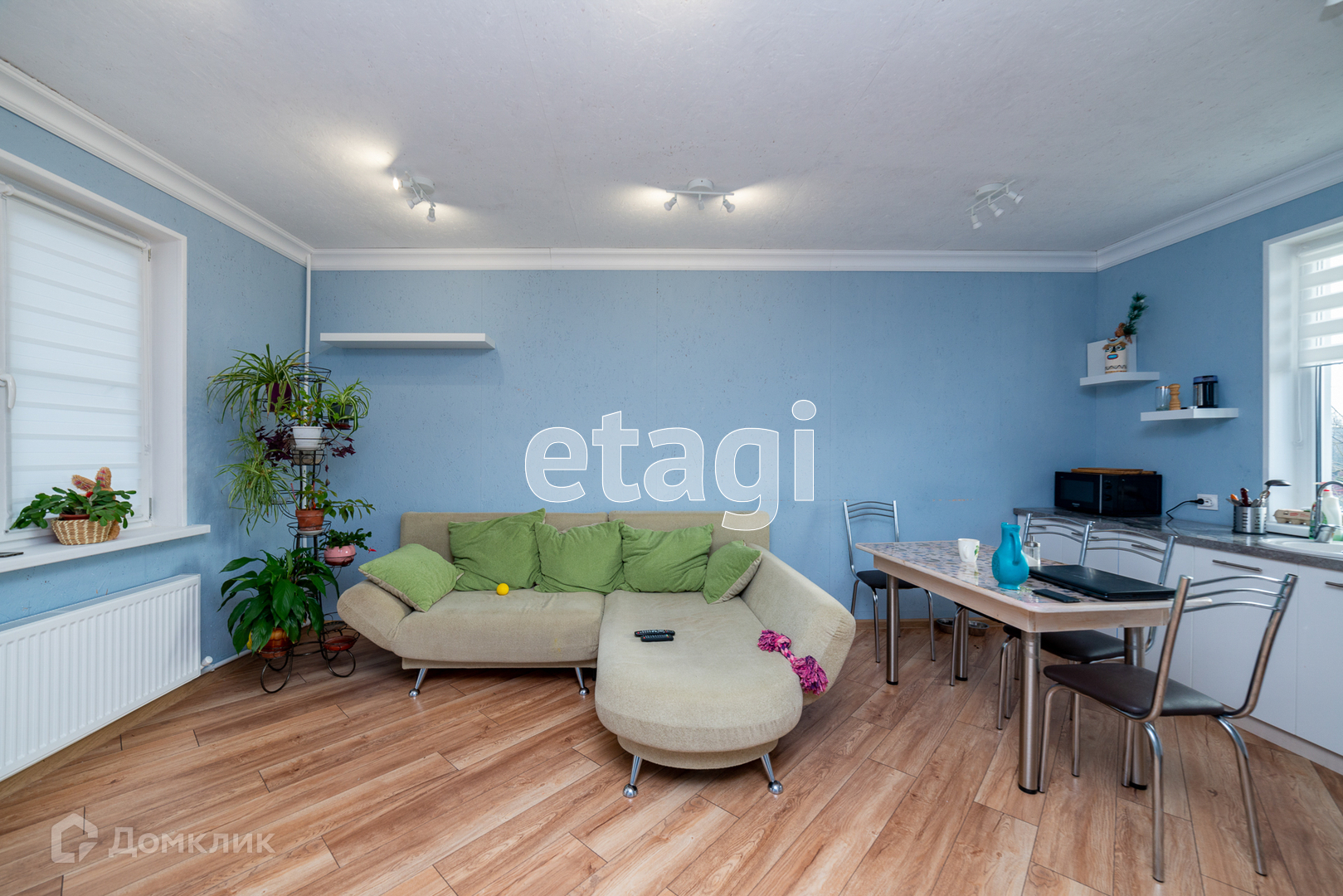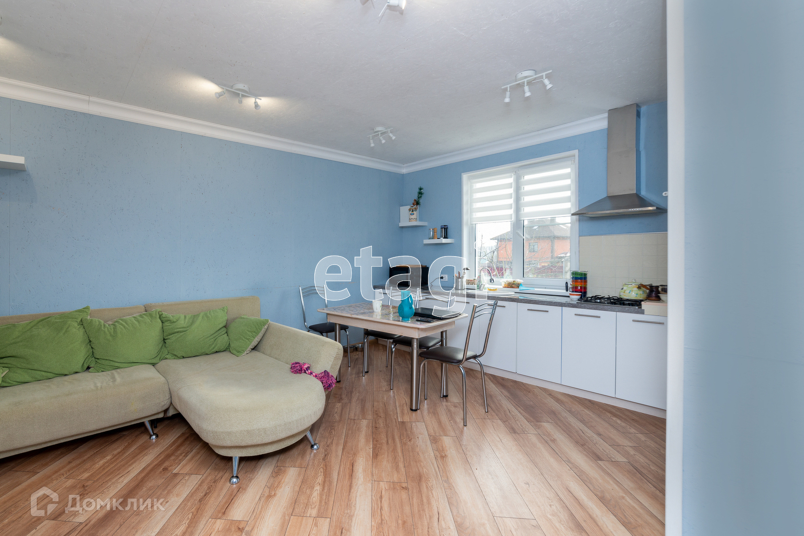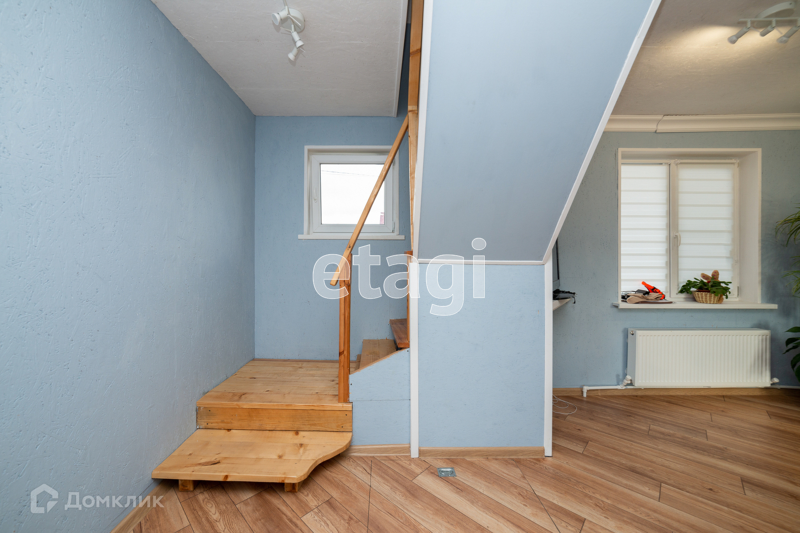 На первом этаже большая гостиная студия, душ совмещён с туалетом, входная зона с окнами в пол. Пол: ламинат.