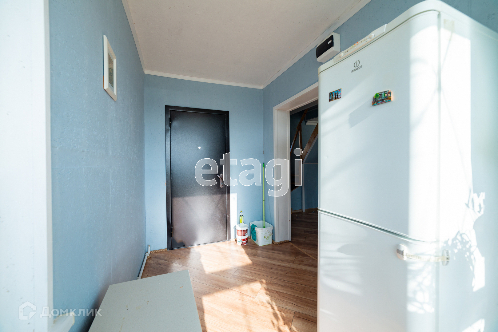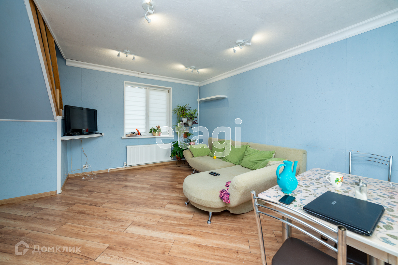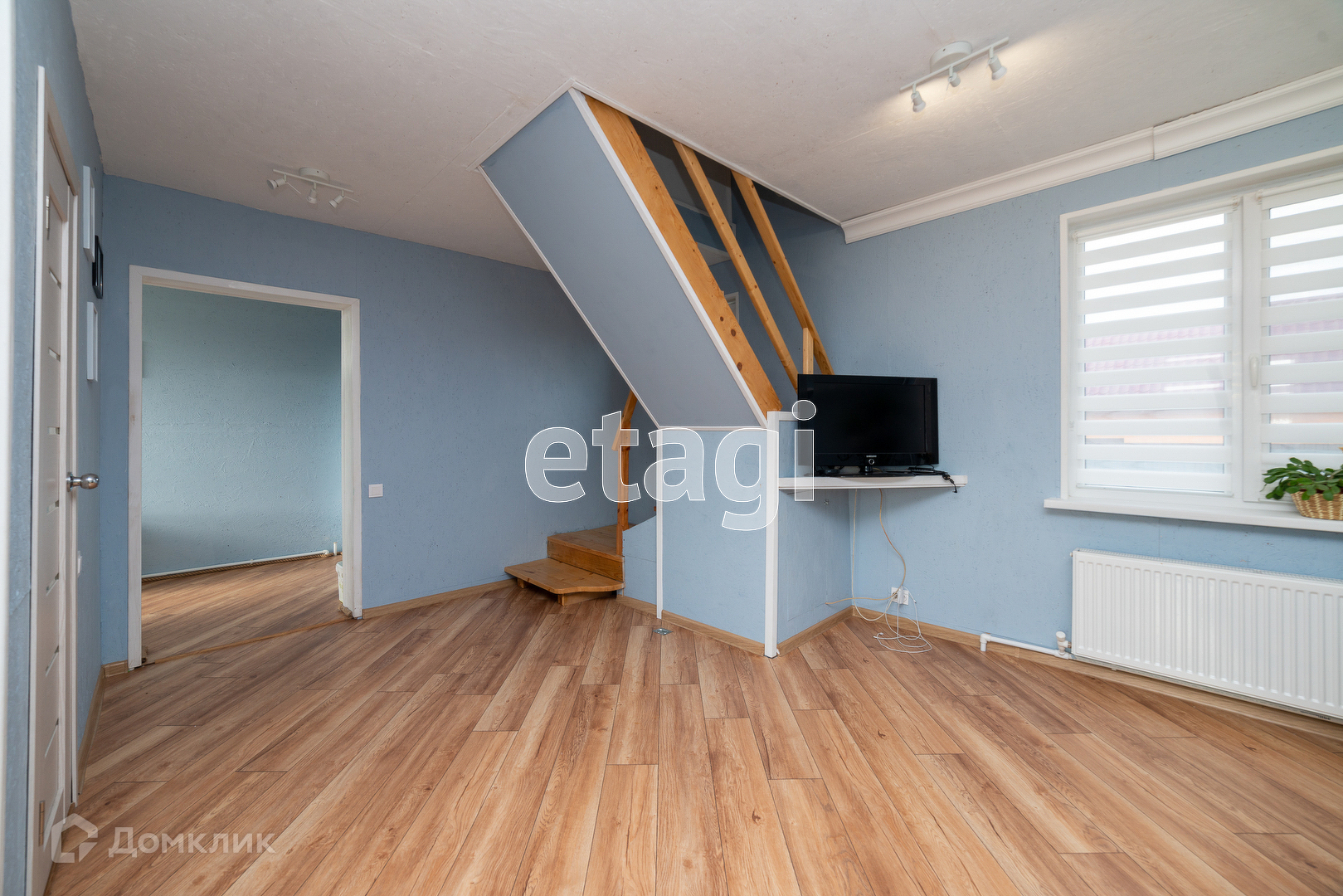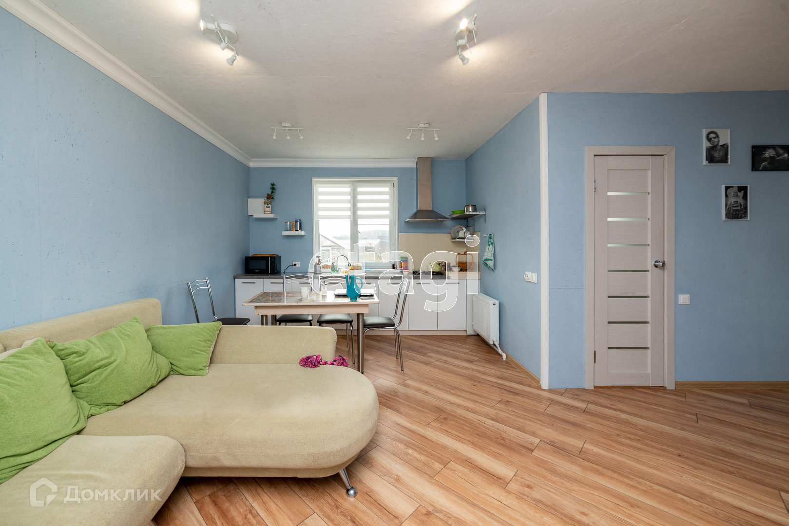 На первом этаже большая гостиная студия, душ совмещён с туалетом, входная зона с окнами в пол. Пол: ламинат.