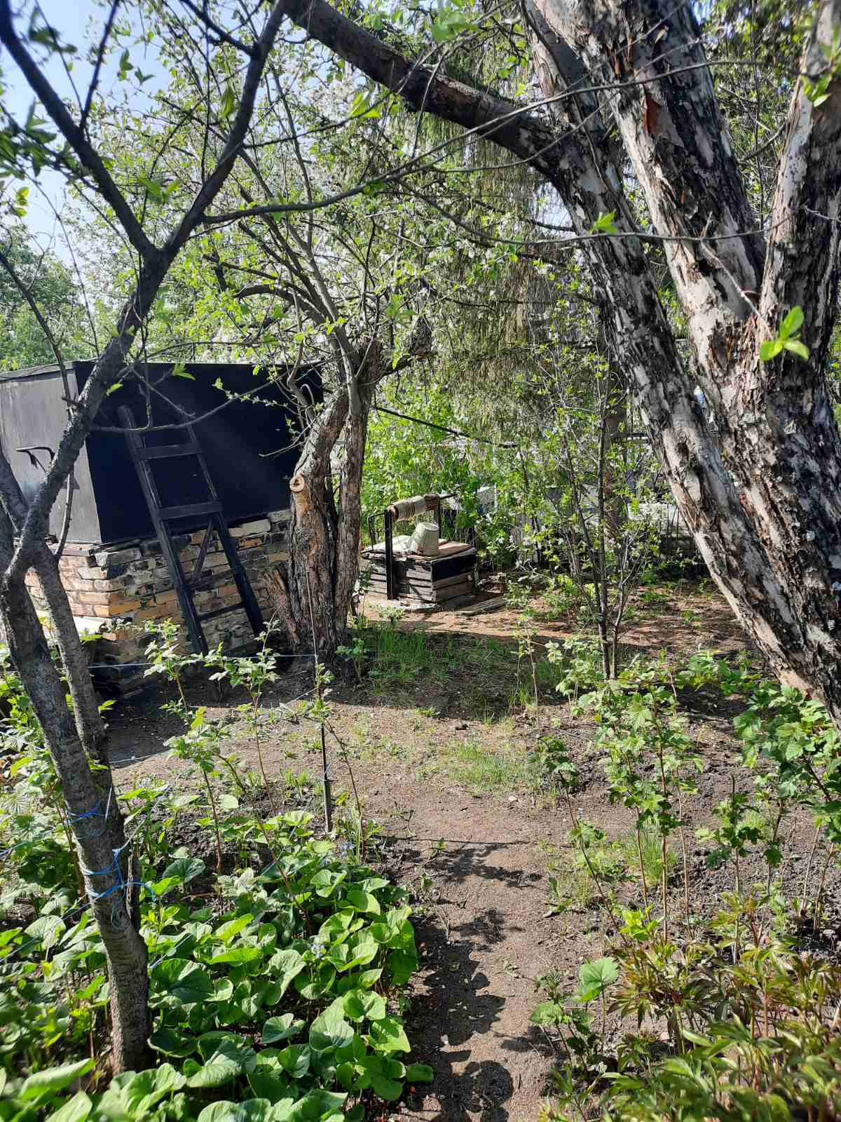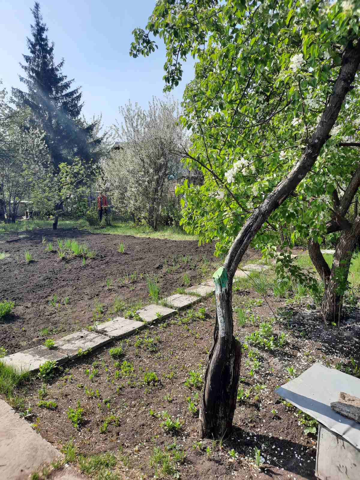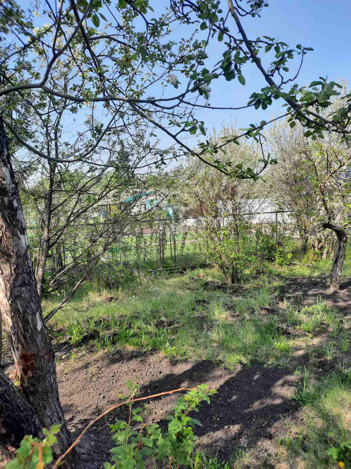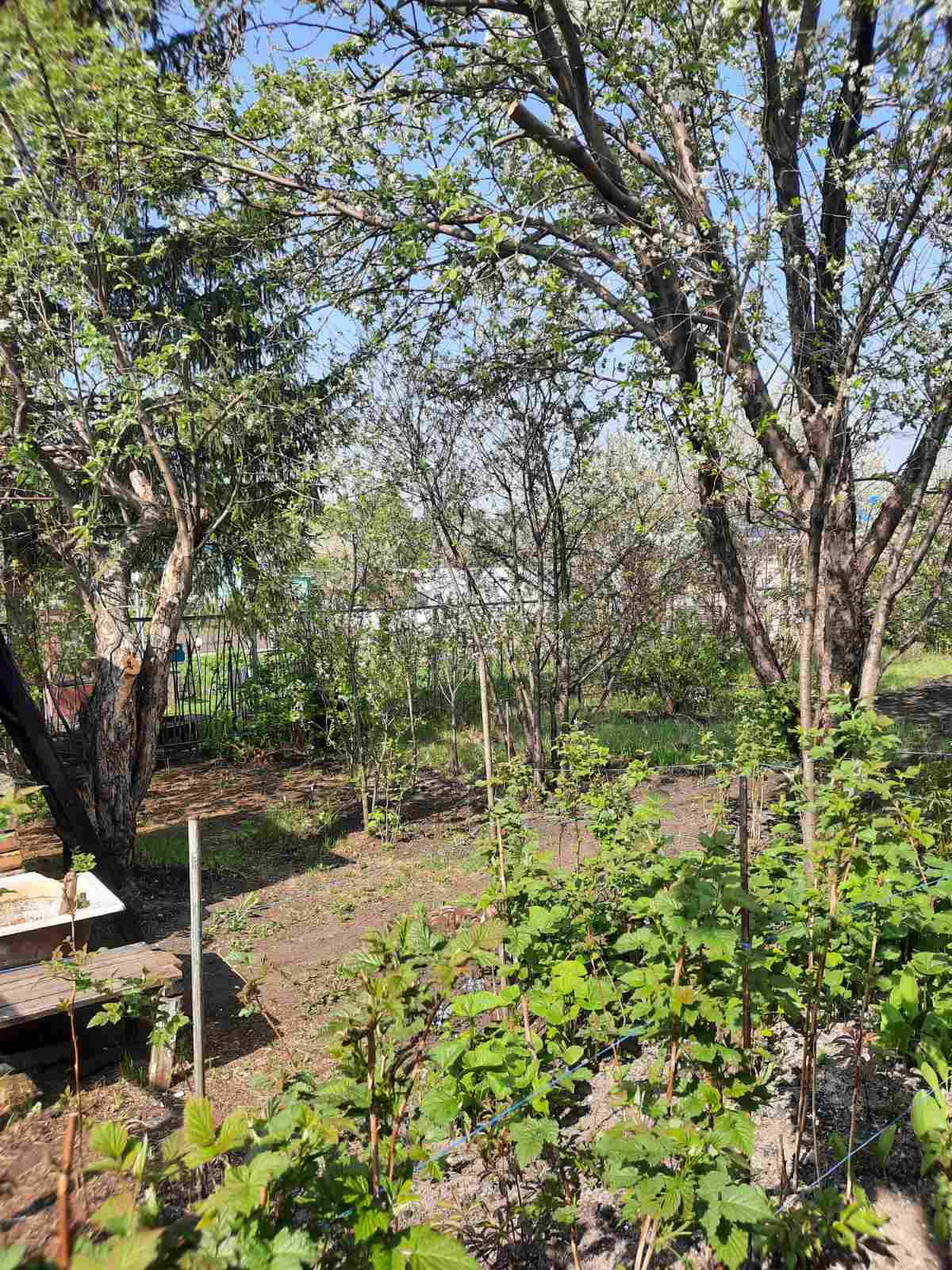 Сам участок прибран, в нужных местах зарос мятликом луговым (мягкий газон), есть взрослые плодовые деревья и кустарники.