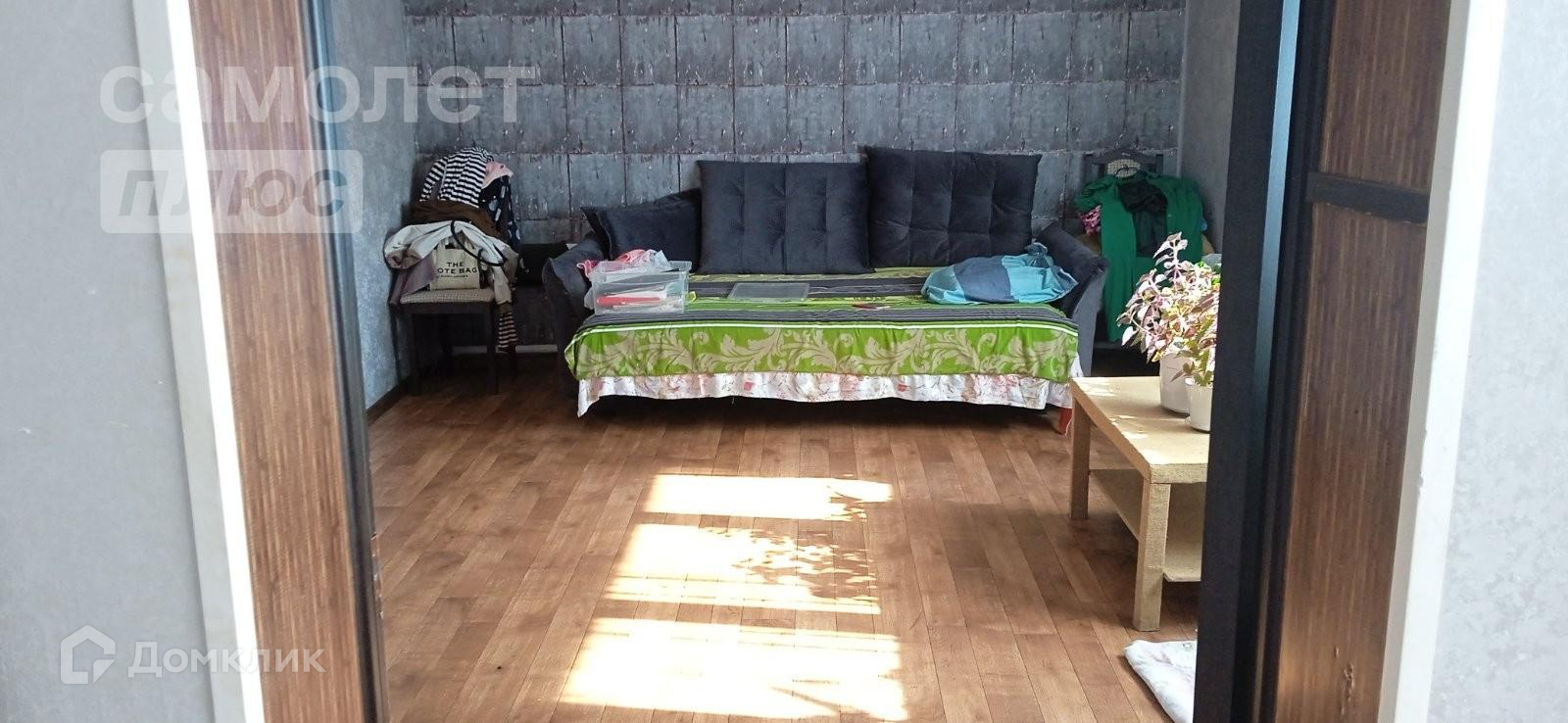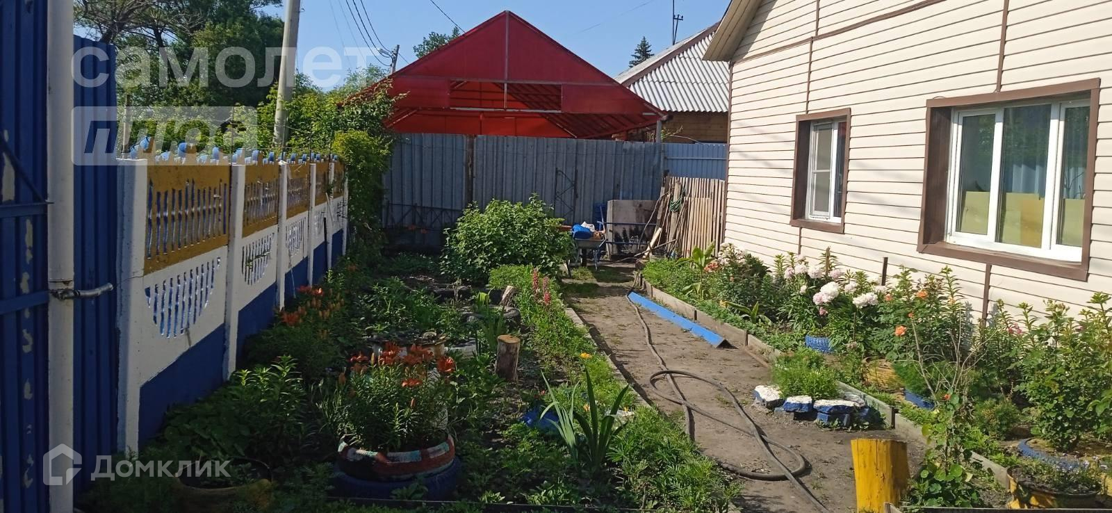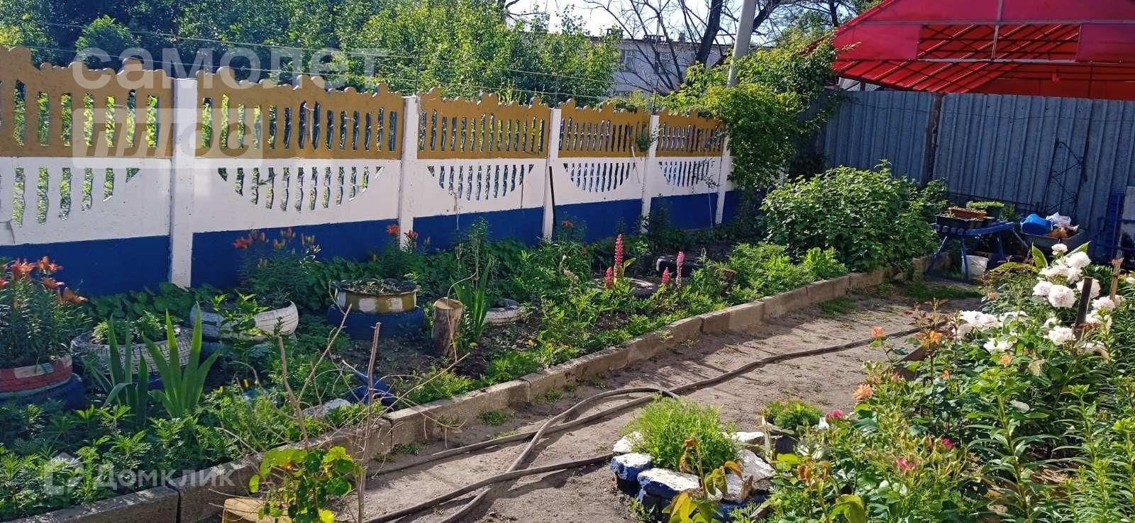 Участок в 5,5 соток обрабатывается, есть теплица 3*10 метров, растут плодоносящие деревья и кустарники, сделана система полива, накопительный бак из нержавейки. Цветущий палисадник под окном.