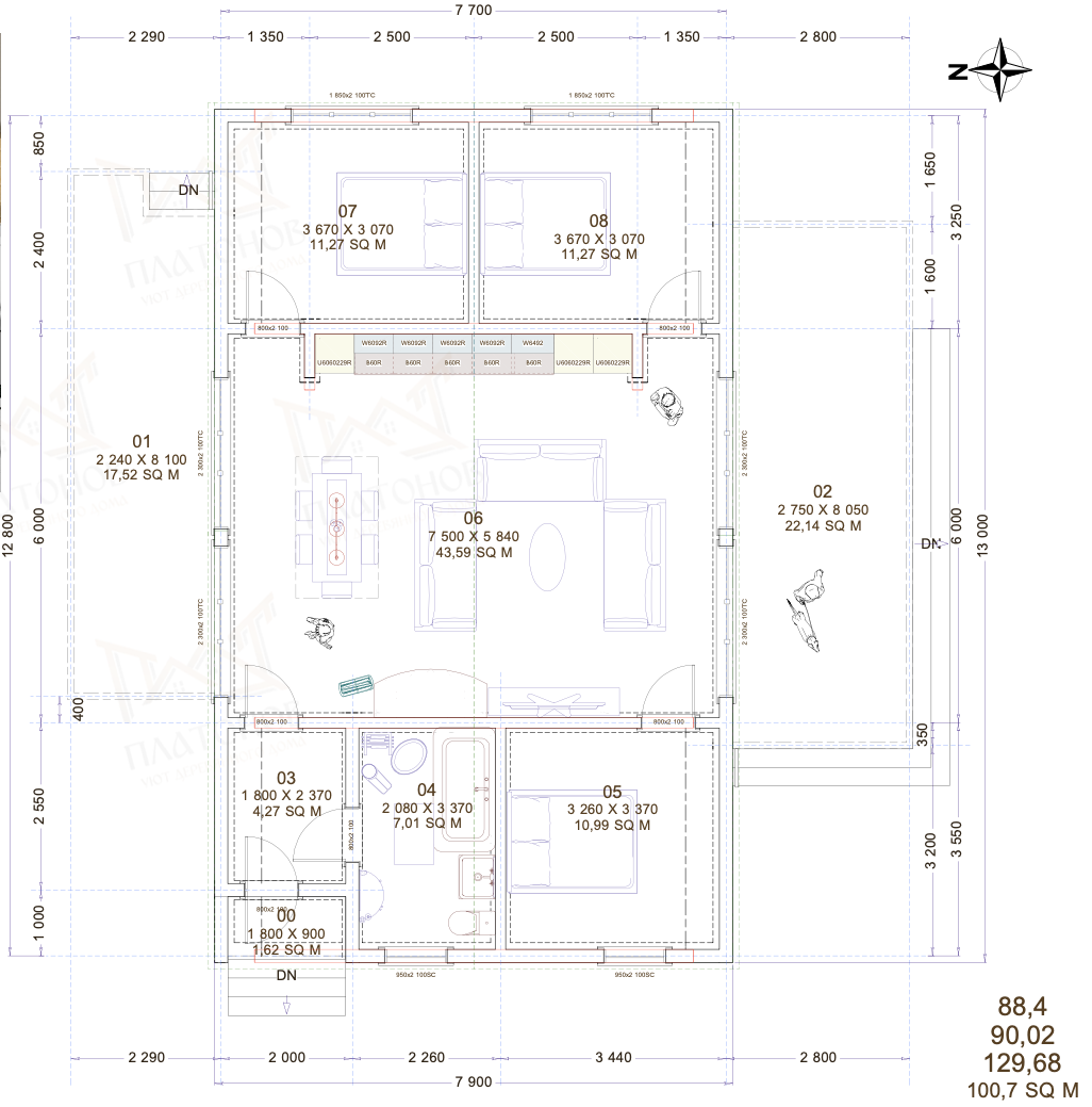 Одноэтажный дом 7х13м , 129,68 м2 c крыльцом и террасами.