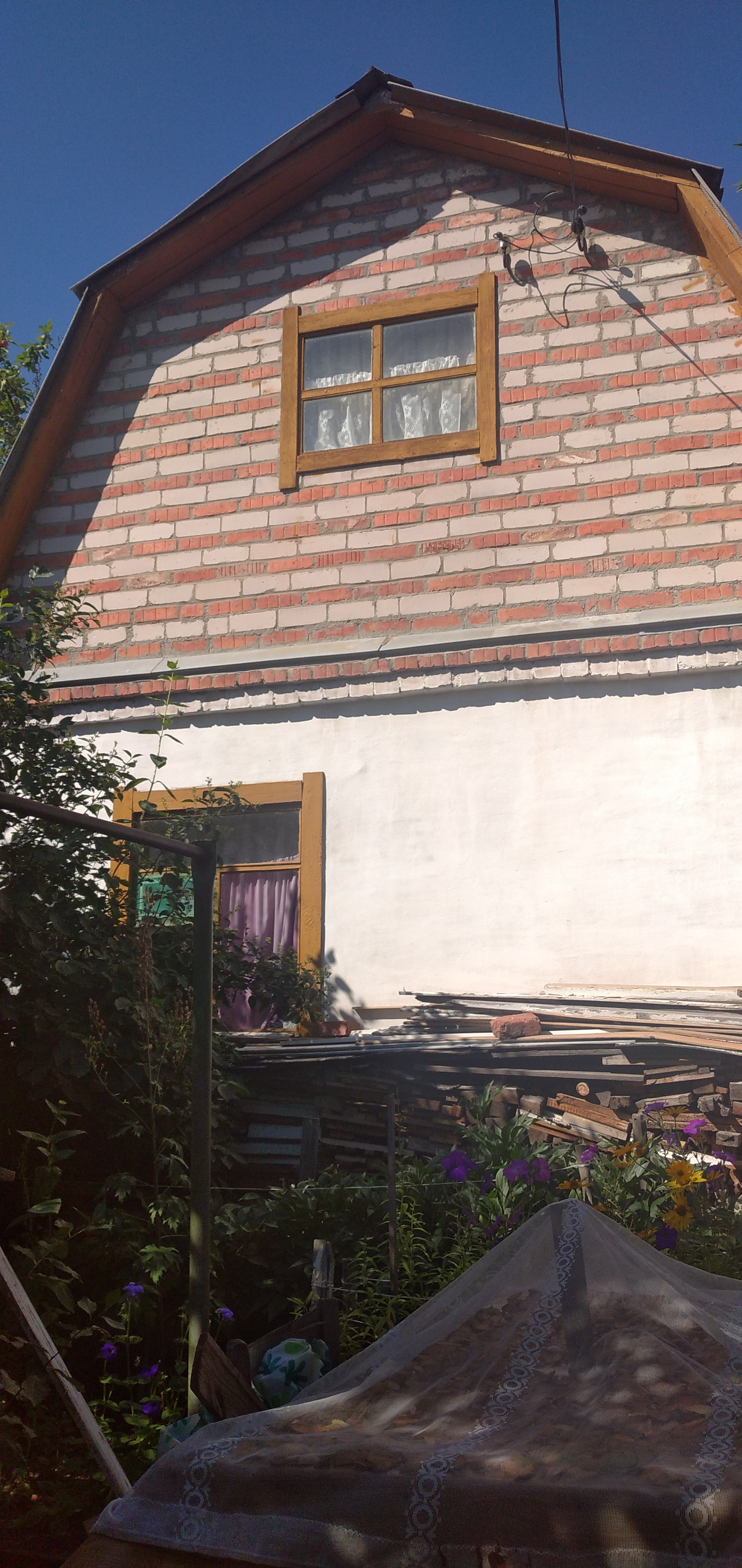 Ухоженный участок с добротным кирпичным домом в хорошем состоянии. В доме на первом этаже - застекленная терраса, кухня и комната и еще одна комната на втором этаже.