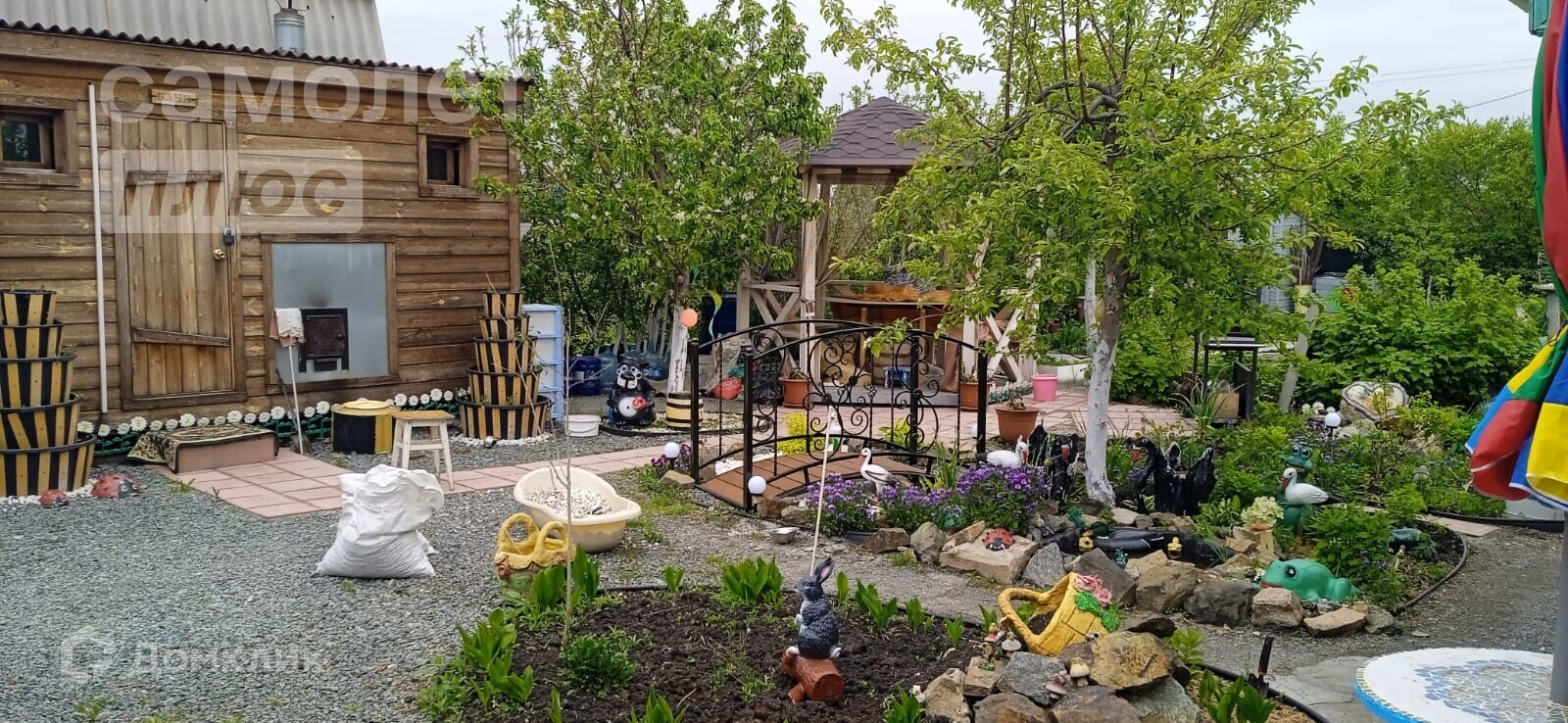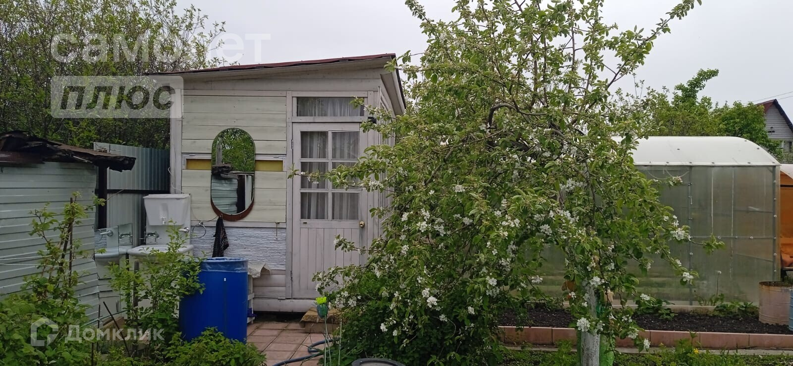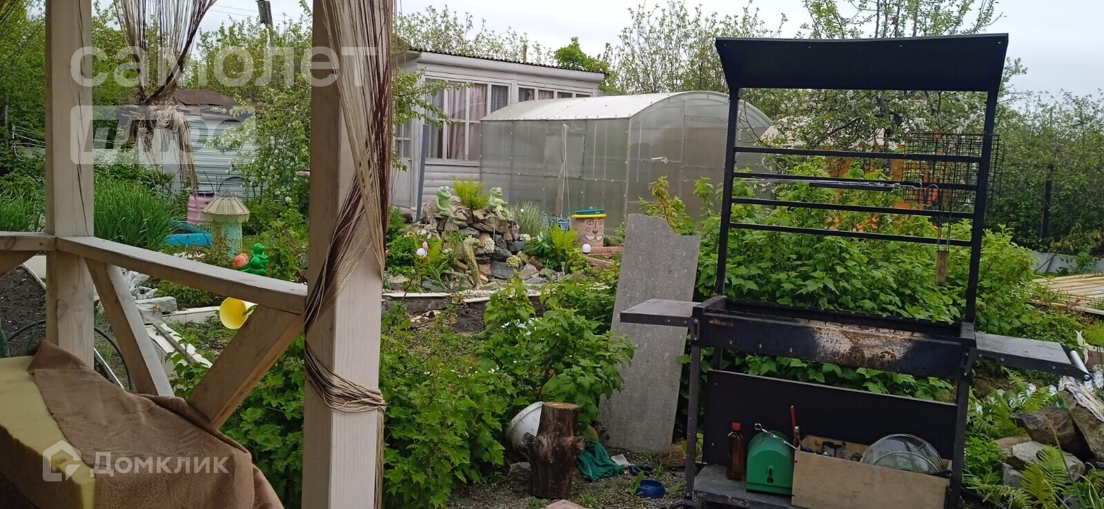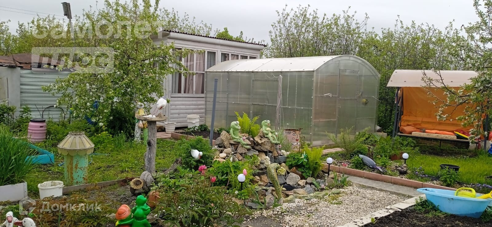 дачный домик, дровник за домиком, баня на дровах, подсобное помещение - цельнометаллический гараж, бак для полива, беседка, мангальная зона, летняя кухня, основание для наливного бассейна, большая каркасная теплица, игровая зона с декоративным мостиком, качели, газон, ухоженные грядки.