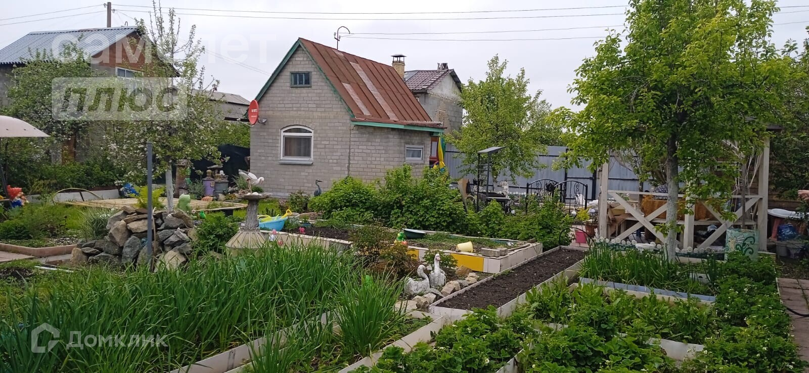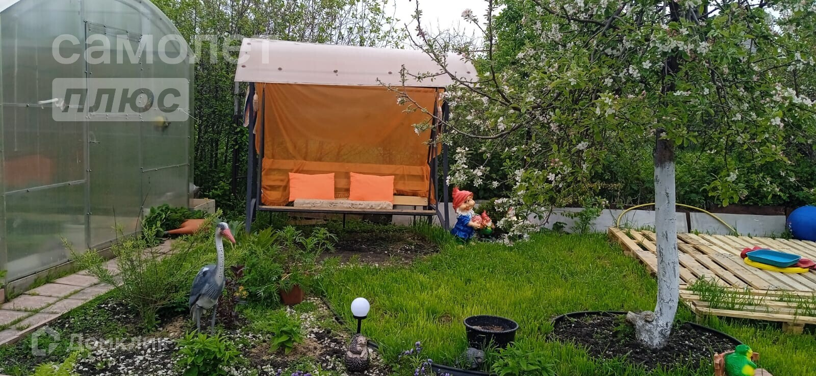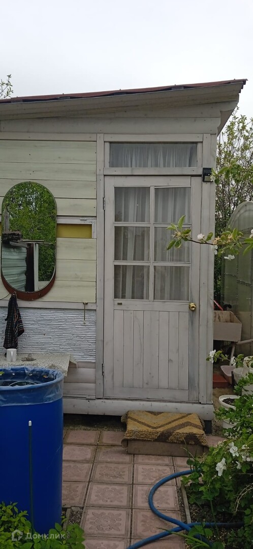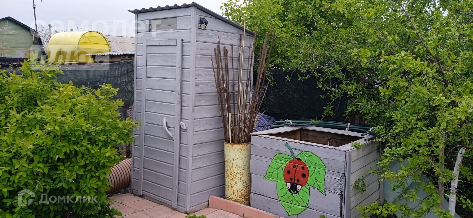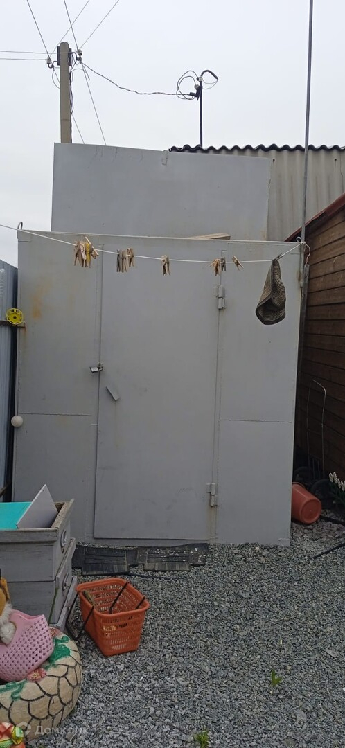 дачный домик, дровник за домиком, баня на дровах, подсобное помещение - цельнометаллический гараж, бак для полива, беседка, мангальная зона, летняя кухня, основание для наливного бассейна, большая каркасная теплица, игровая зона с декоративным мостиком, качели, газон, ухоженные грядки.