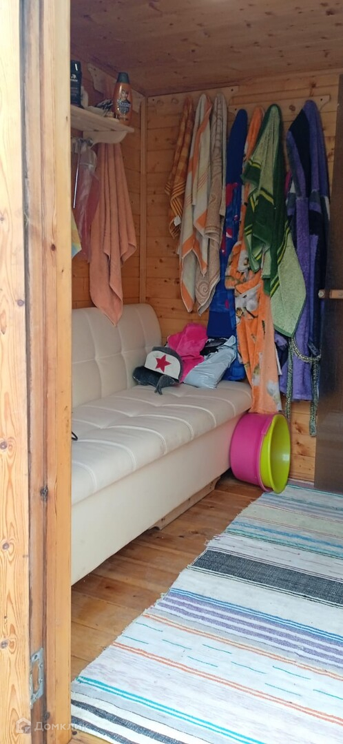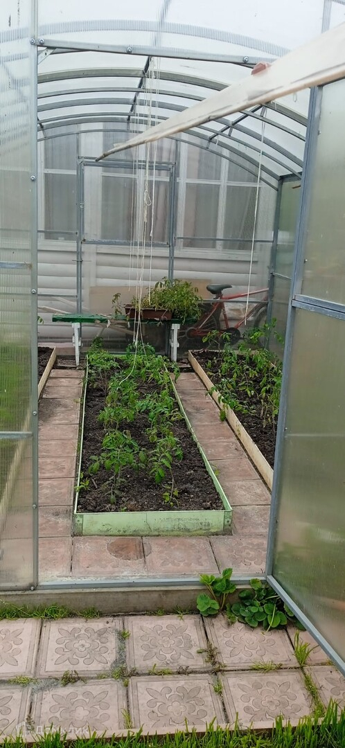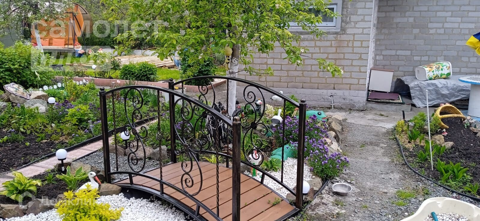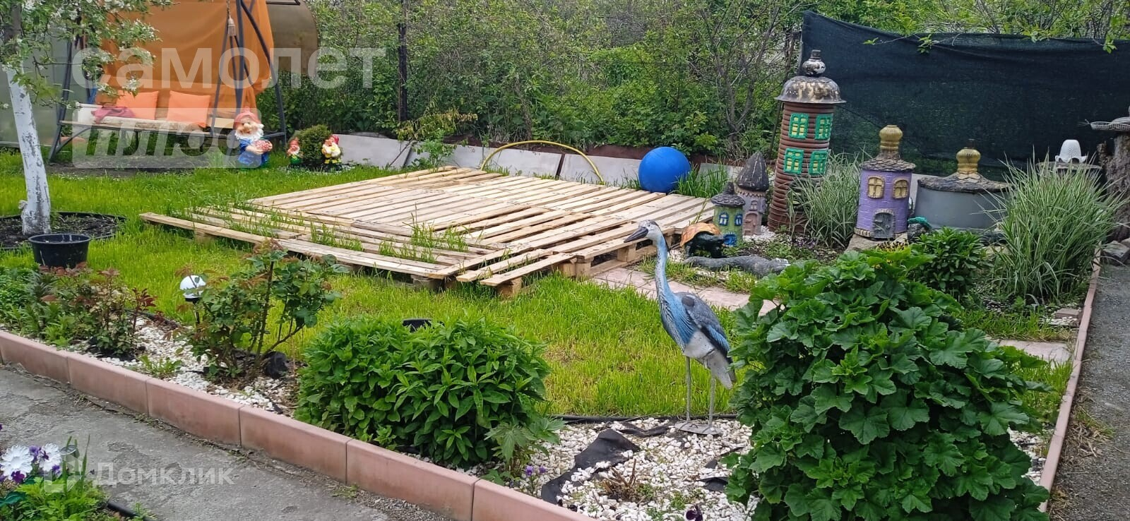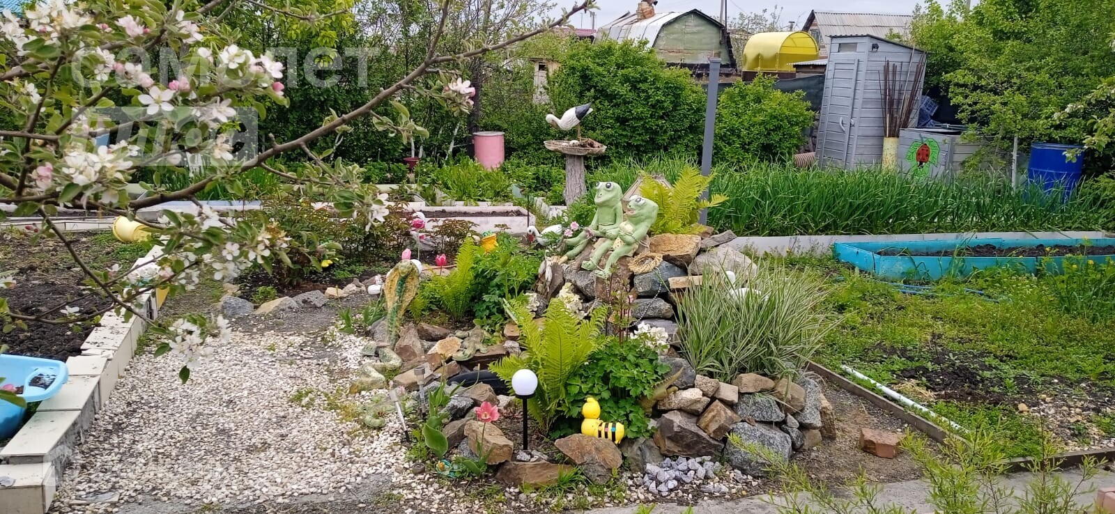 дачный домик, дровник за домиком, баня на дровах, подсобное помещение - цельнометаллический гараж, бак для полива, беседка, мангальная зона, летняя кухня, основание для наливного бассейна, большая каркасная теплица, игровая зона с декоративным мостиком, качели, газон, ухоженные грядки.