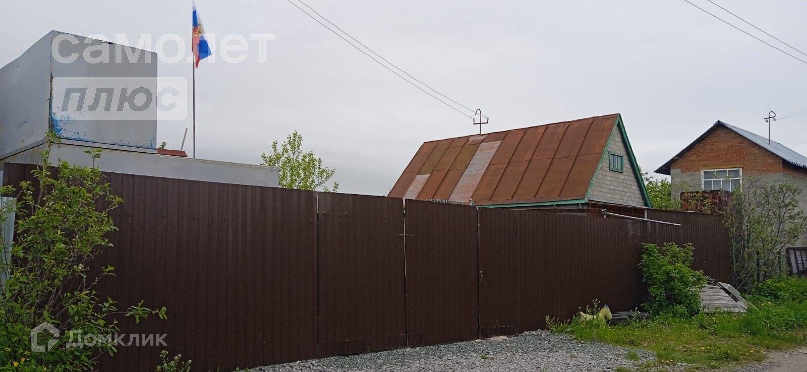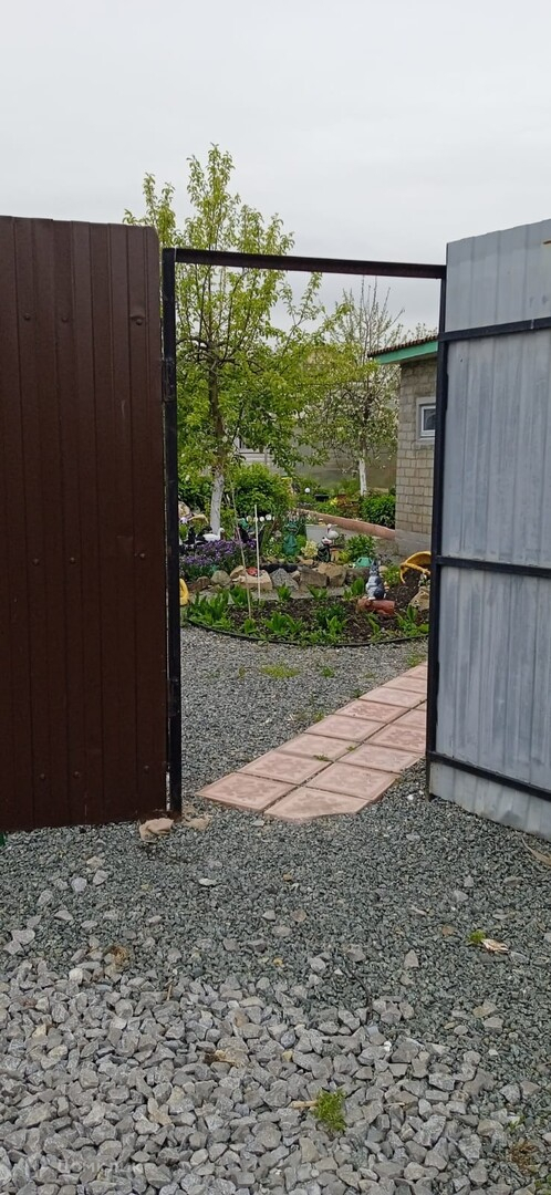 Участок огорожен по всему периметру. С фасадной части - забор из профнастила с распашными воротами и широкой калиткой.