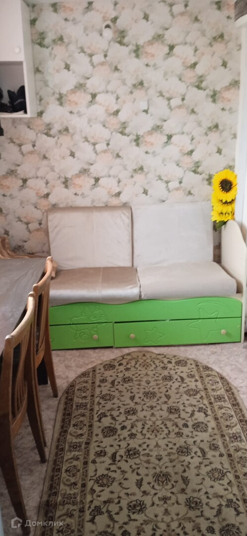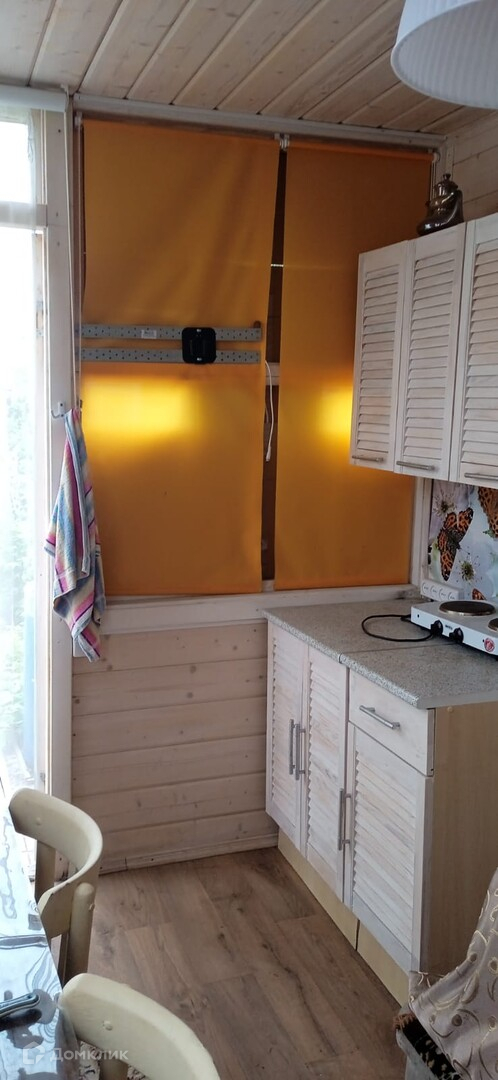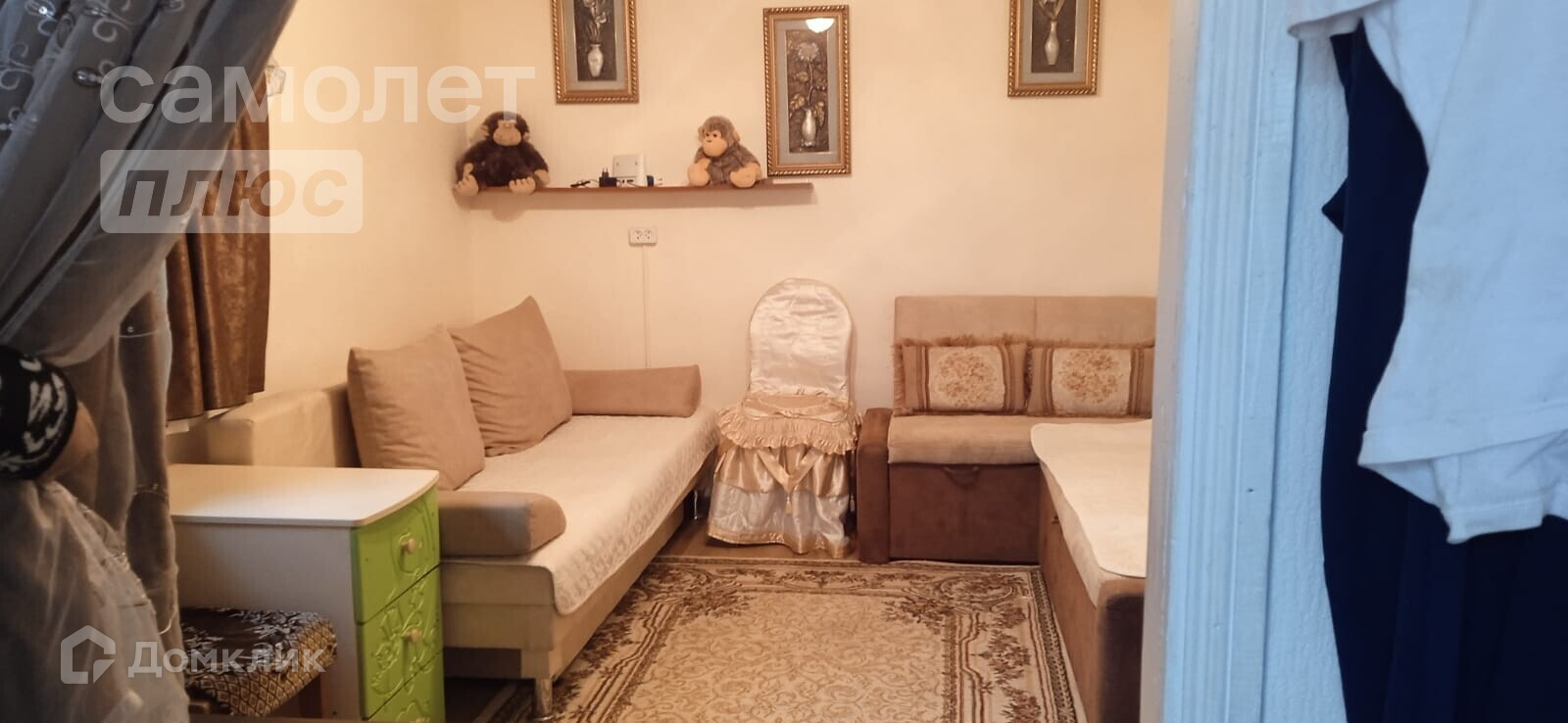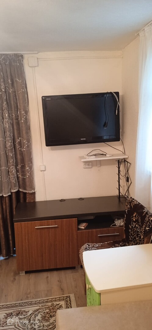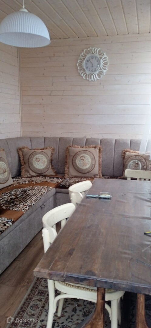 В доме - комната с двумя диванами, комодом и телевизором, и кухня с холодильником, столом и стульями, диваном.