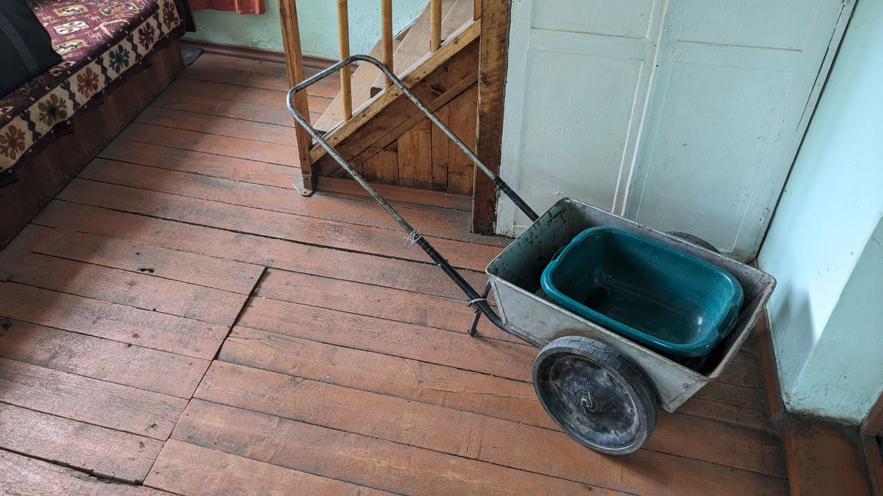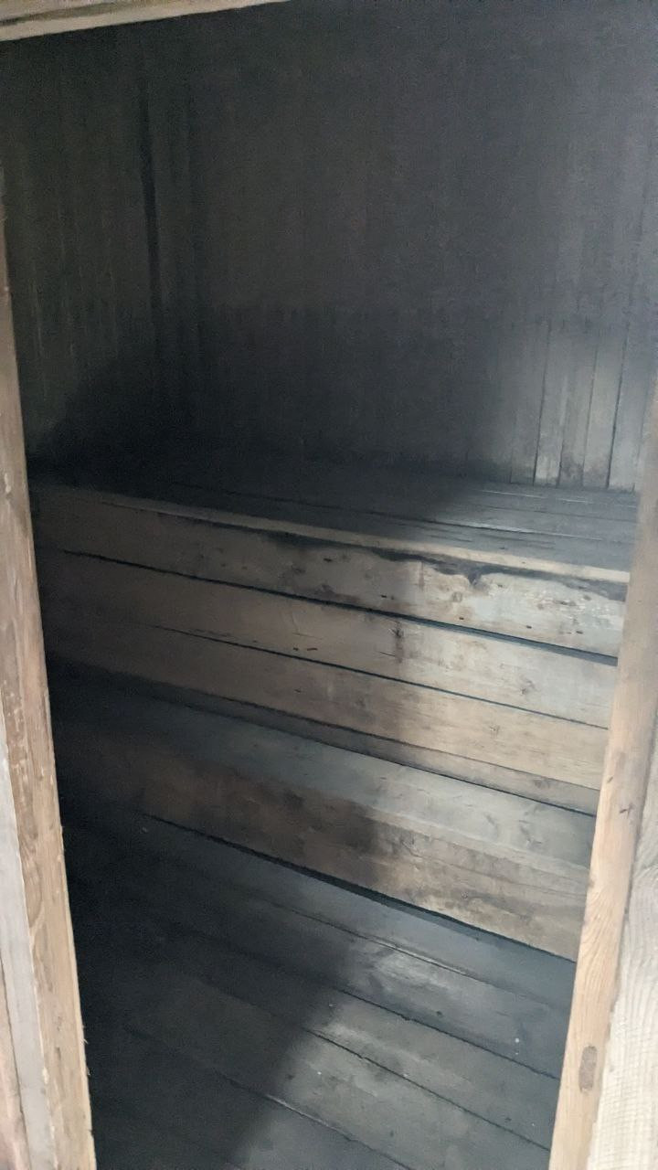 Над баней большой бак для воды (для полива и других целей).