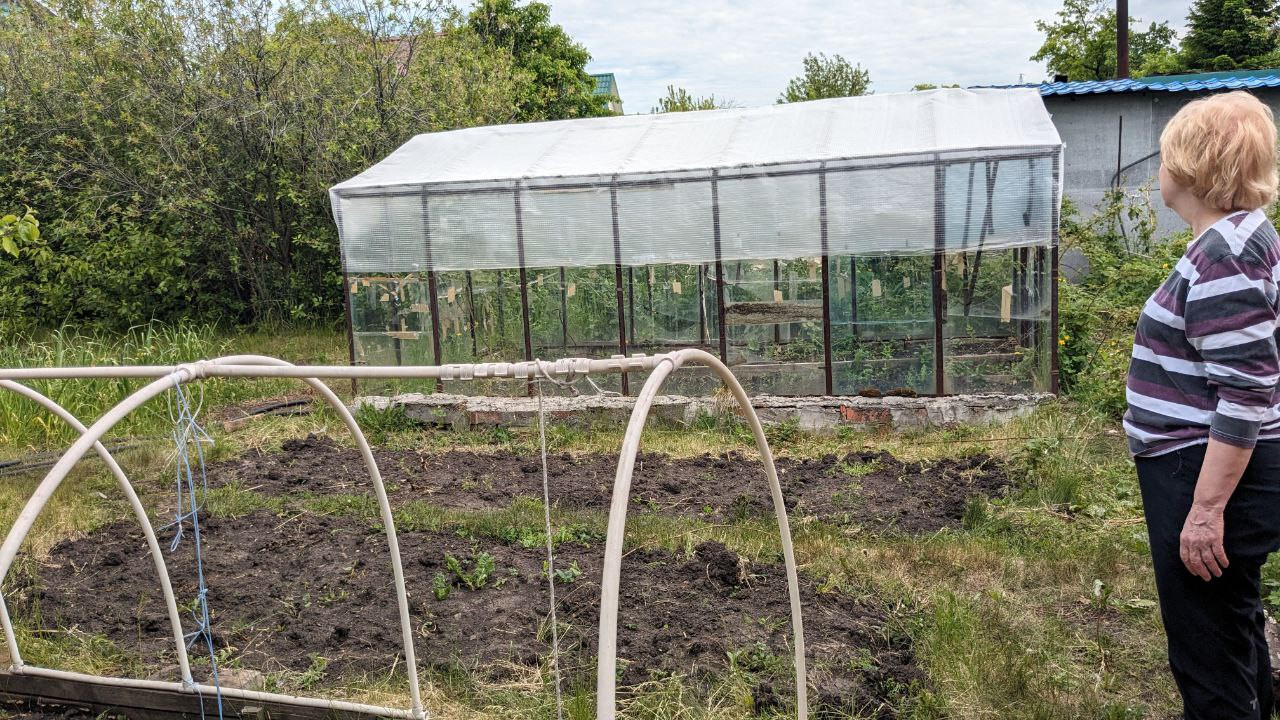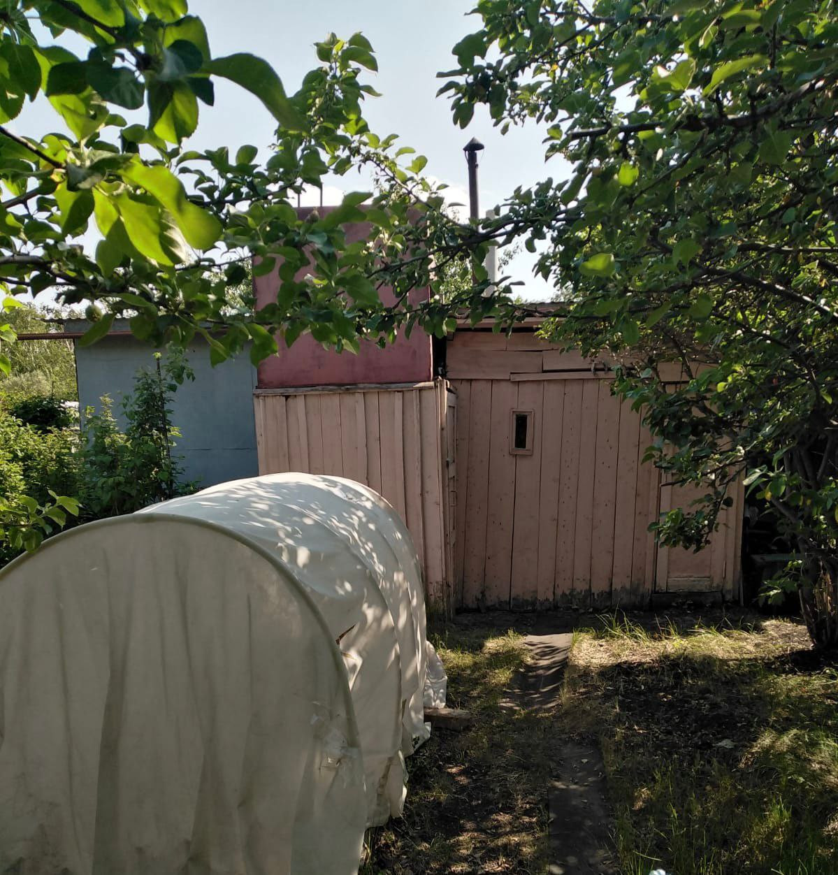 Во дворе есть деревянные - хоз.блок для хранения инвентаря, туалет с ямой, небольшая деревянная баня (без печки), две теплицы