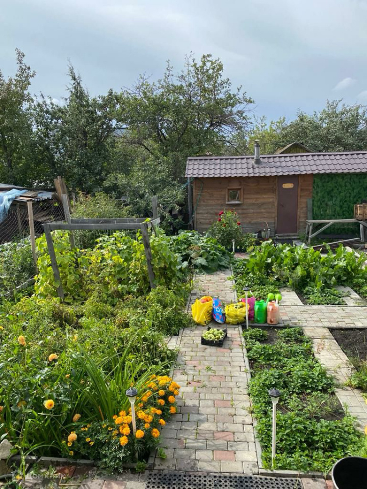Во дворе установлена теплая будка для собаки с вольером для выгула. Дорожки на участке выложены тротуарной плиткой. На участке плодово-ягодные посадки, красивая альпийская горка.