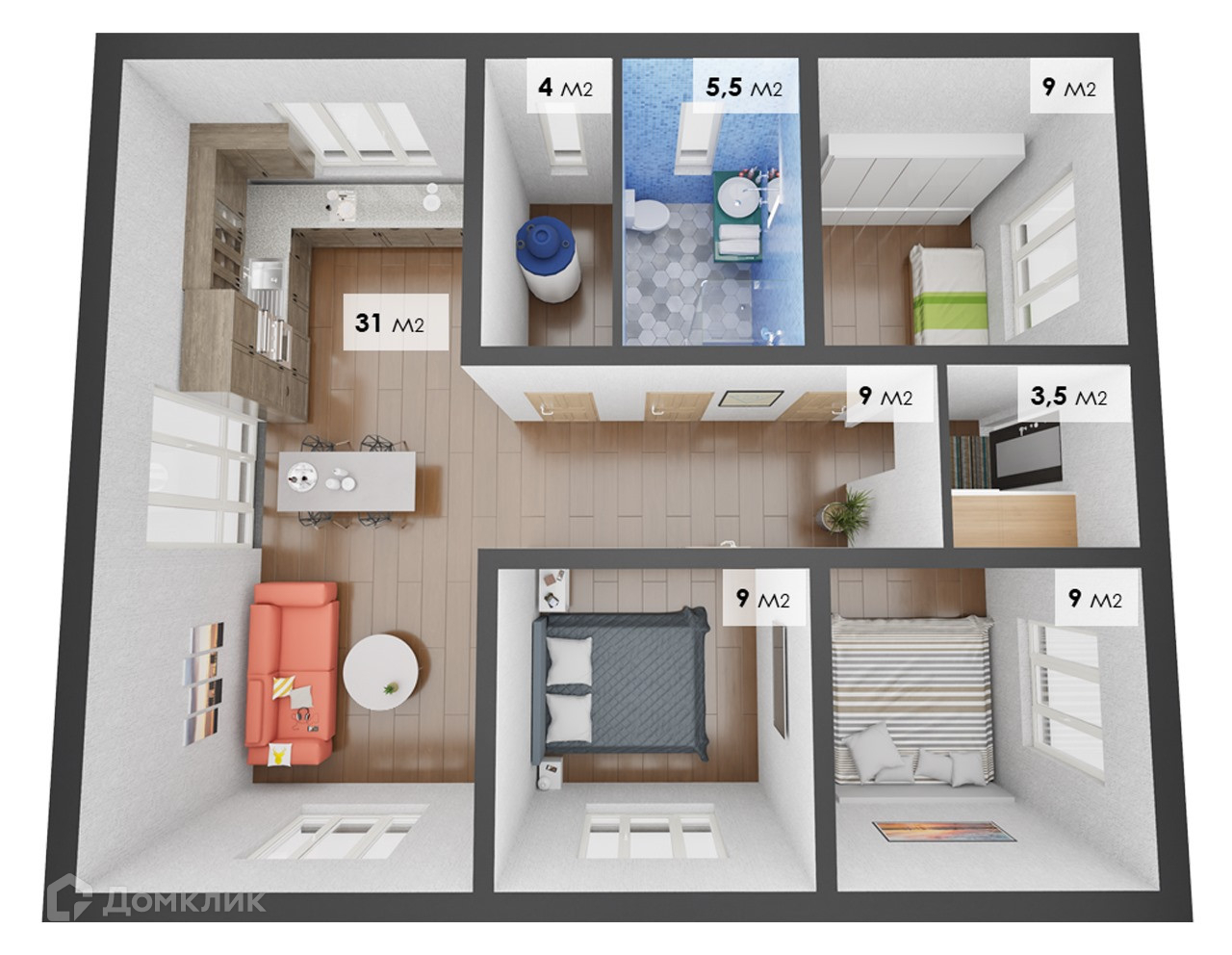 Гостинная + 3 спальни.